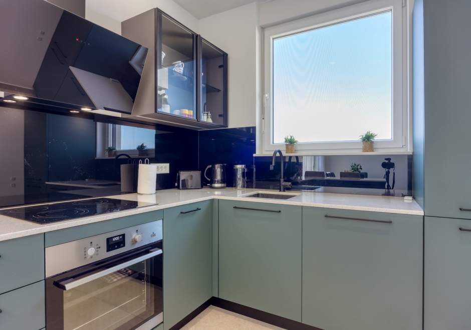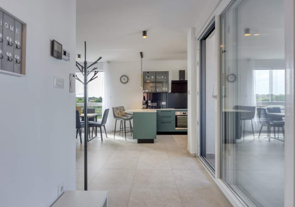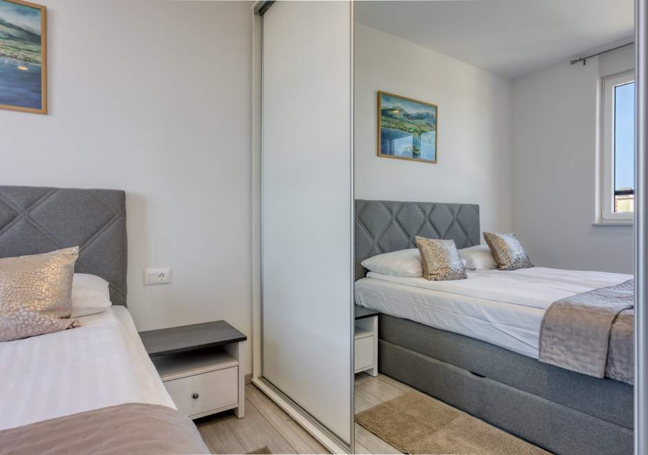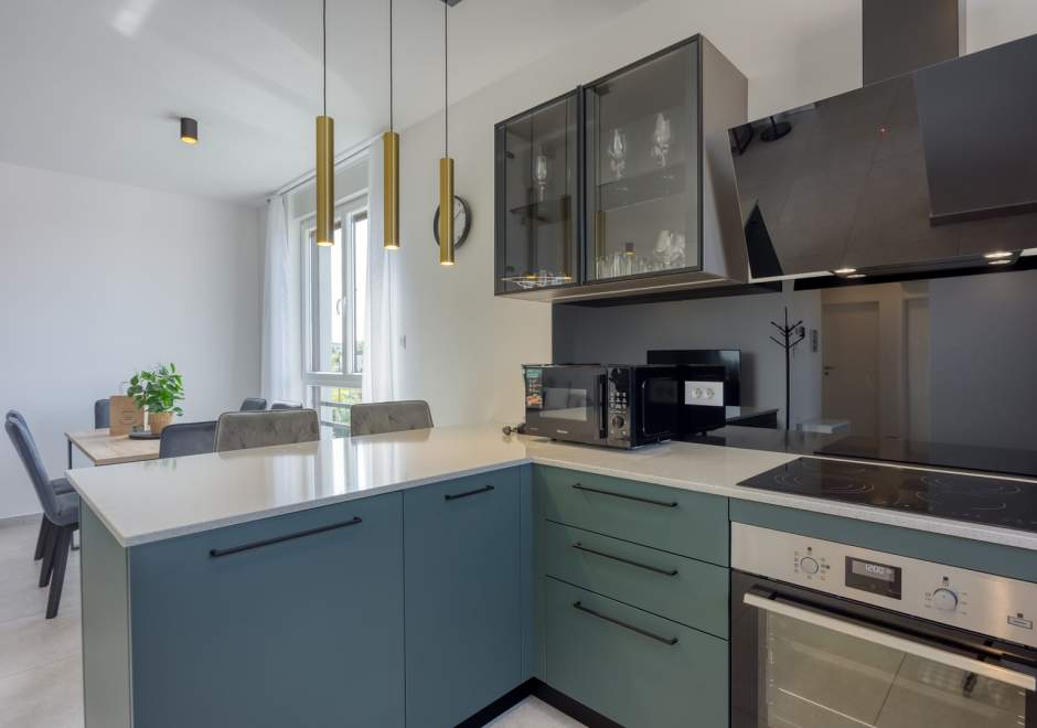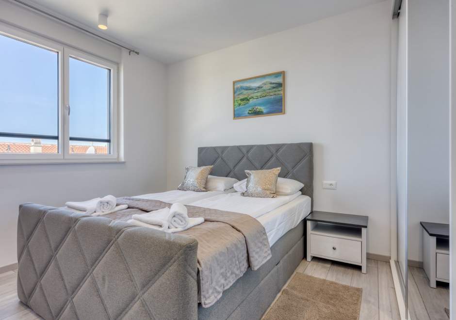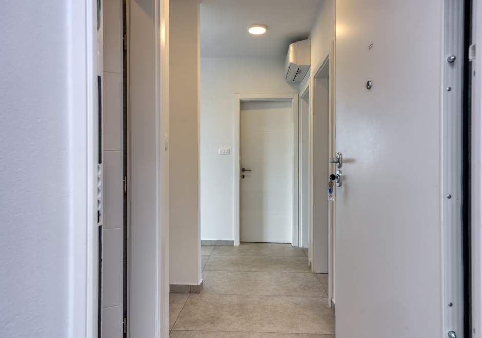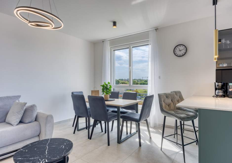 Das modern und komfortabel eingerichtete Apartment Monika Nr. 4 befindet sich im 2. Stock eines Neubau-Apartmenthauses und ist ideal für einen Familienurlaub oder eine Gruppe von Freunden. Das Apartment verfügt über ein geräumiges Wohnzimmer mit einer voll ausgestatteten Küche, die mit allen notwendigen Geräten und Annehmlichkeiten ausgestattet ist. Der Balkon bietet zusätzlichen Komfort und die Möglichkeit, die frische Luft mit Blick auf die Stadt und das Meer in der Ferne zu genießen.