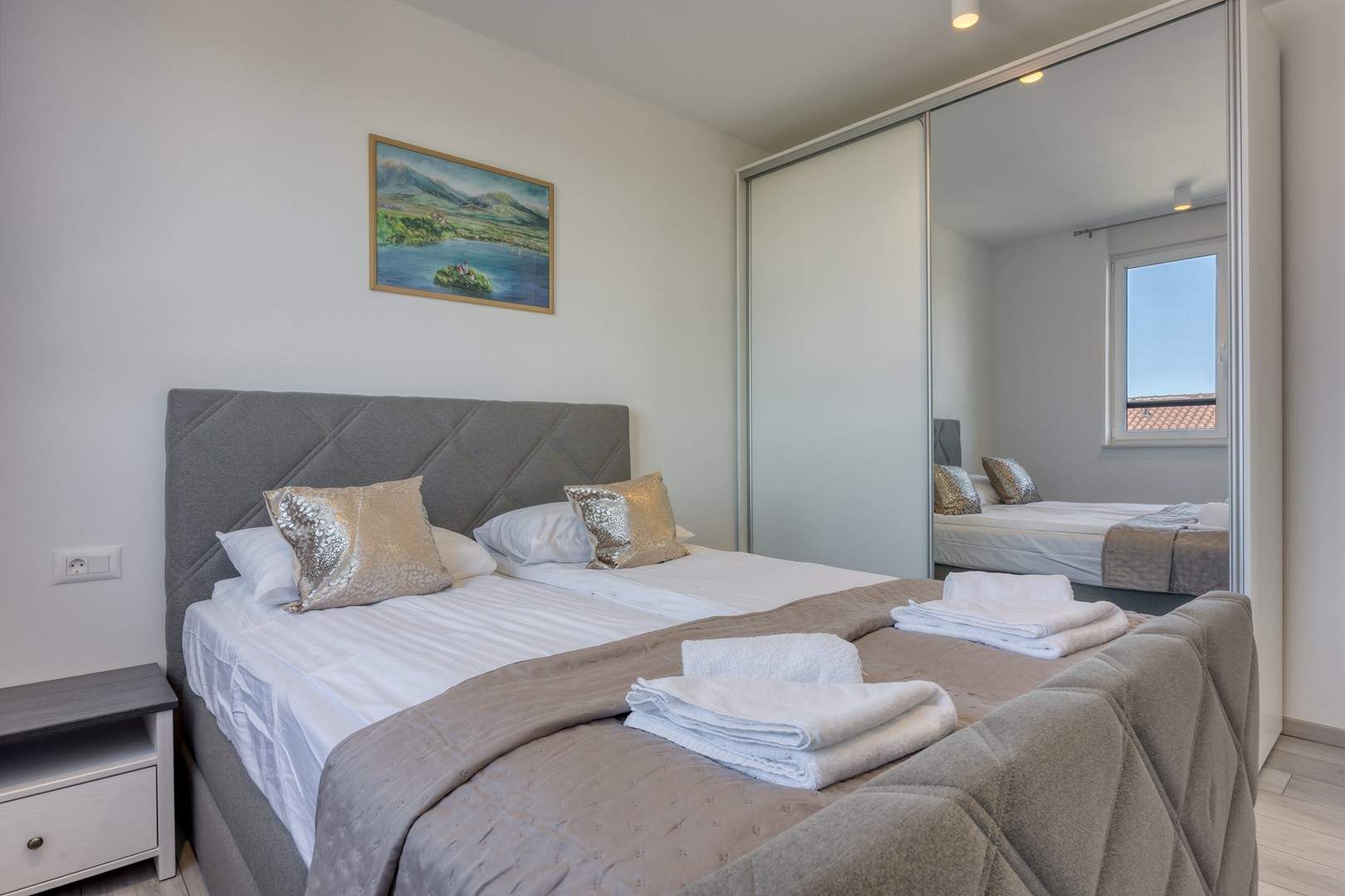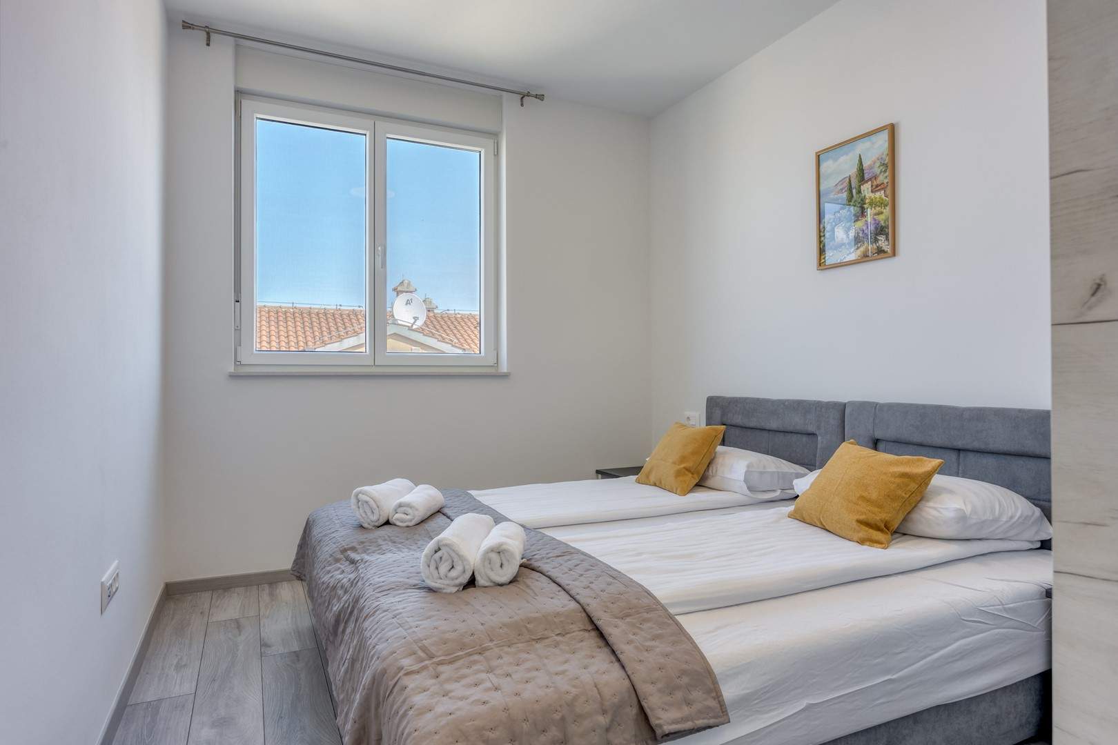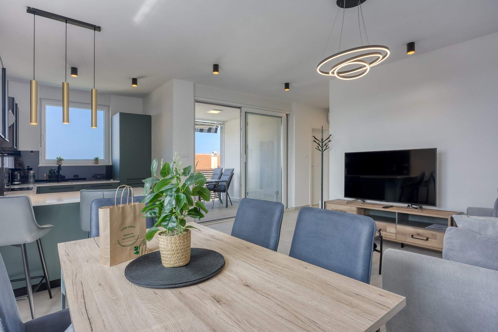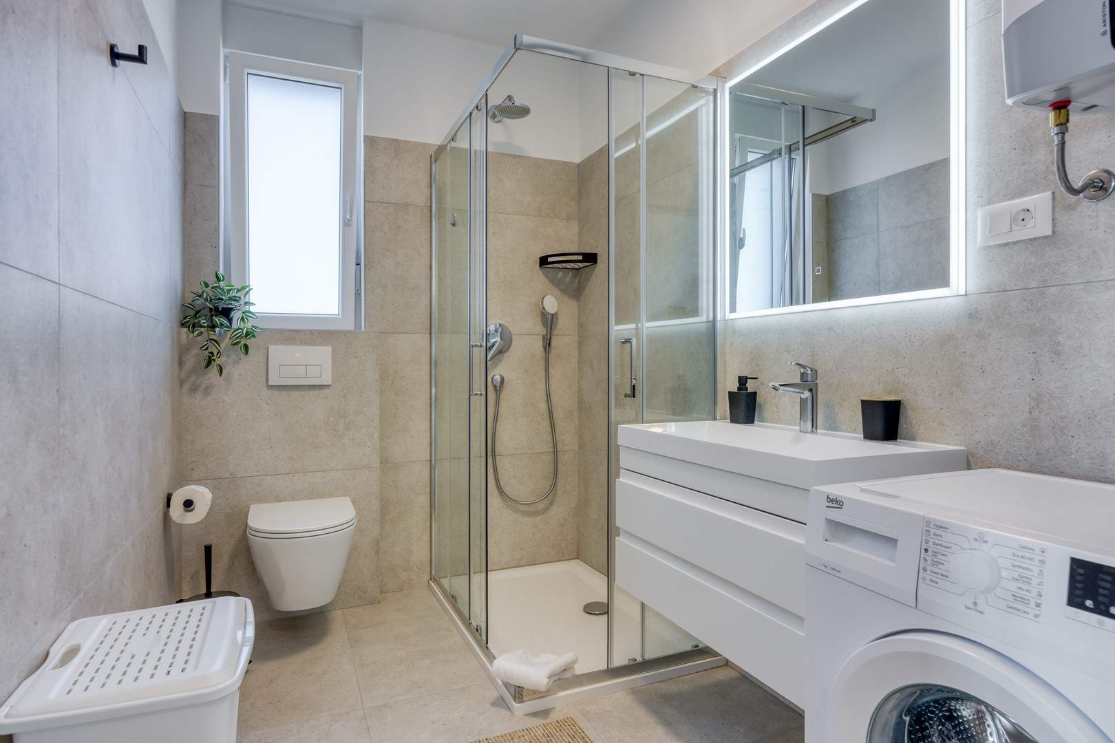 Das modern und komfortabel eingerichtete Apartment Monika Nr. 4 befindet sich im 2. Stock eines Neubau-Apartmenthauses und ist ideal für einen Familienurlaub oder eine Gruppe von Freunden. Das Apartment verfügt über ein geräumiges Wohnzimmer mit einer voll ausgestatteten Küche, die mit allen notwendigen Geräten und Annehmlichkeiten ausgestattet ist. Der Balkon bietet zusätzlichen Komfort und die Möglichkeit, die frische Luft mit Blick auf die Stadt und das Meer in der Ferne zu genießen.
