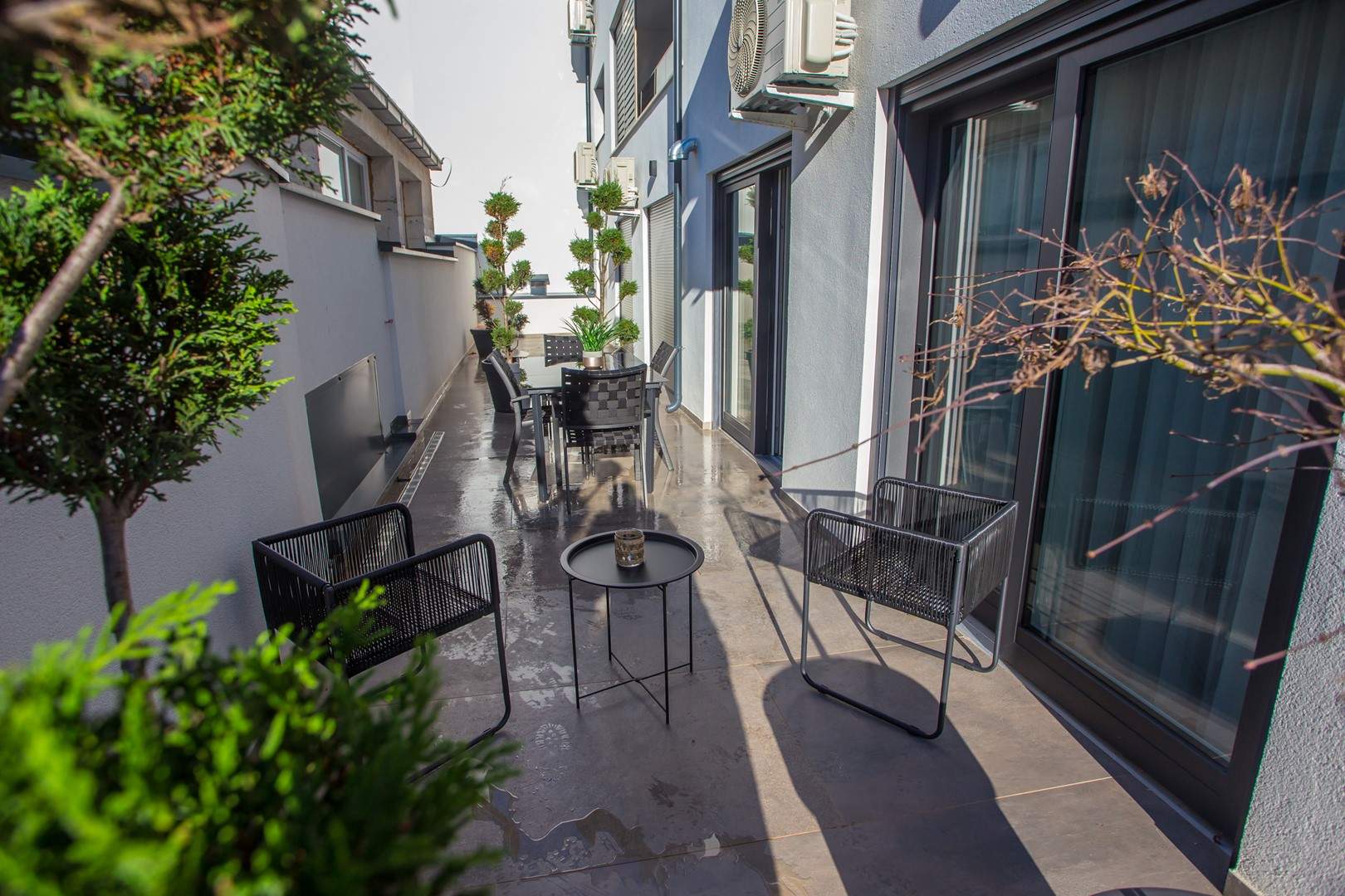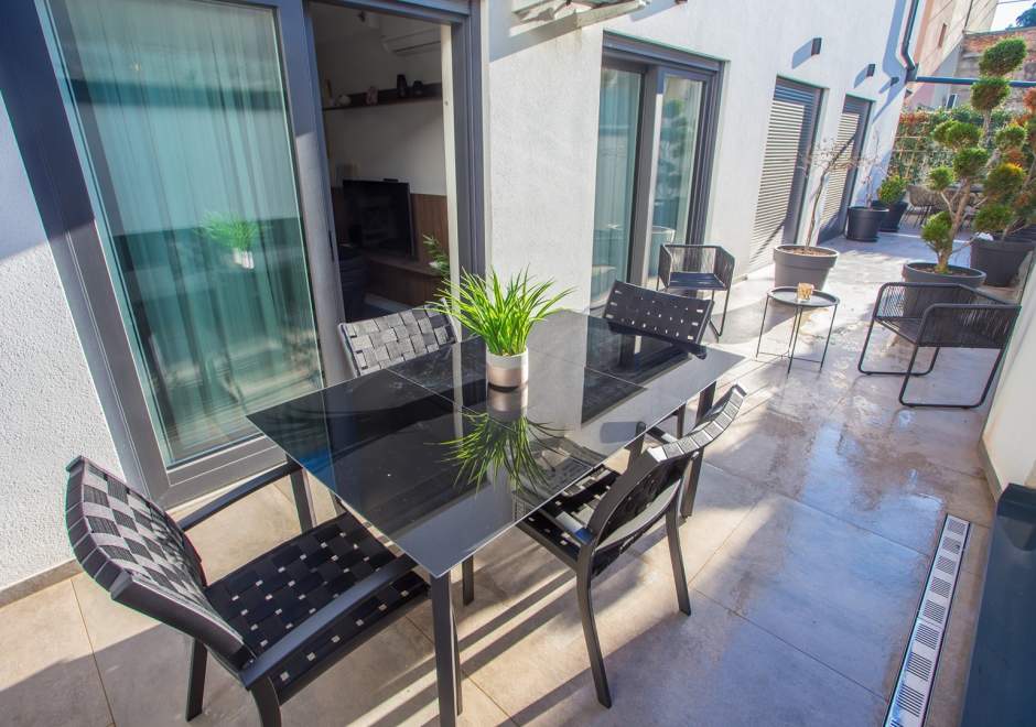 Auf der Terrasse mit Gartenmöbeln können Sie frühstücken oder zu Abend essen und ein Glas Wein genießen.