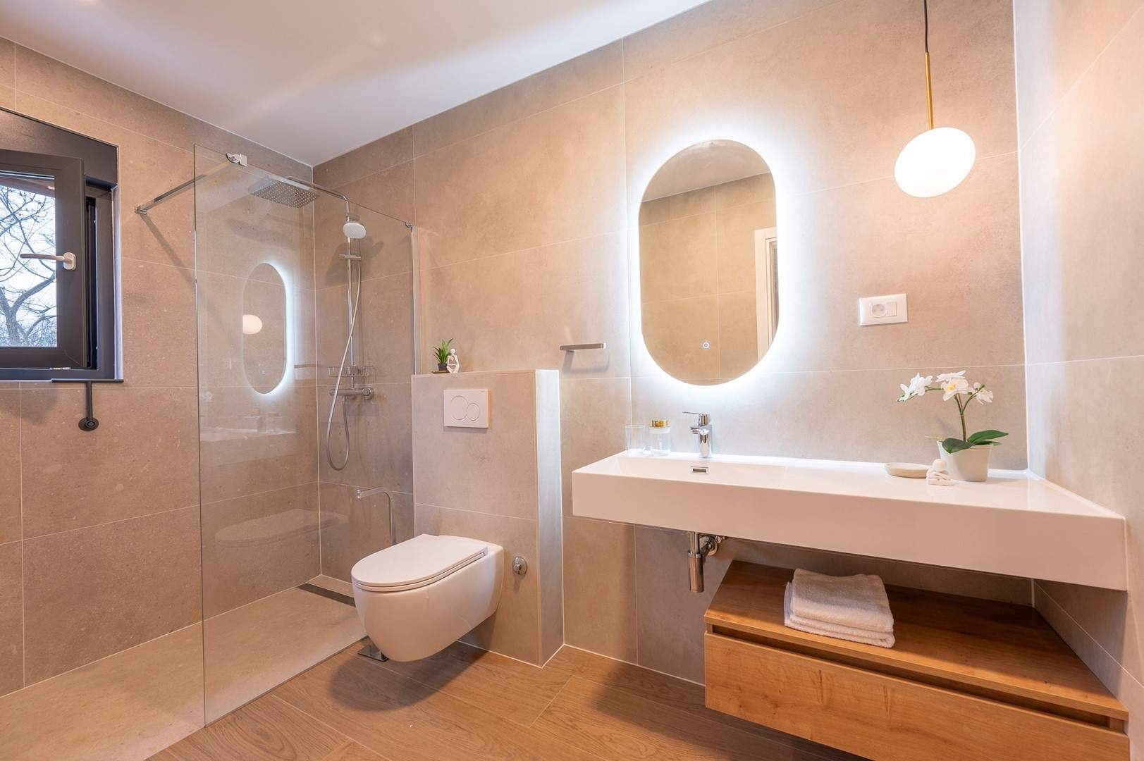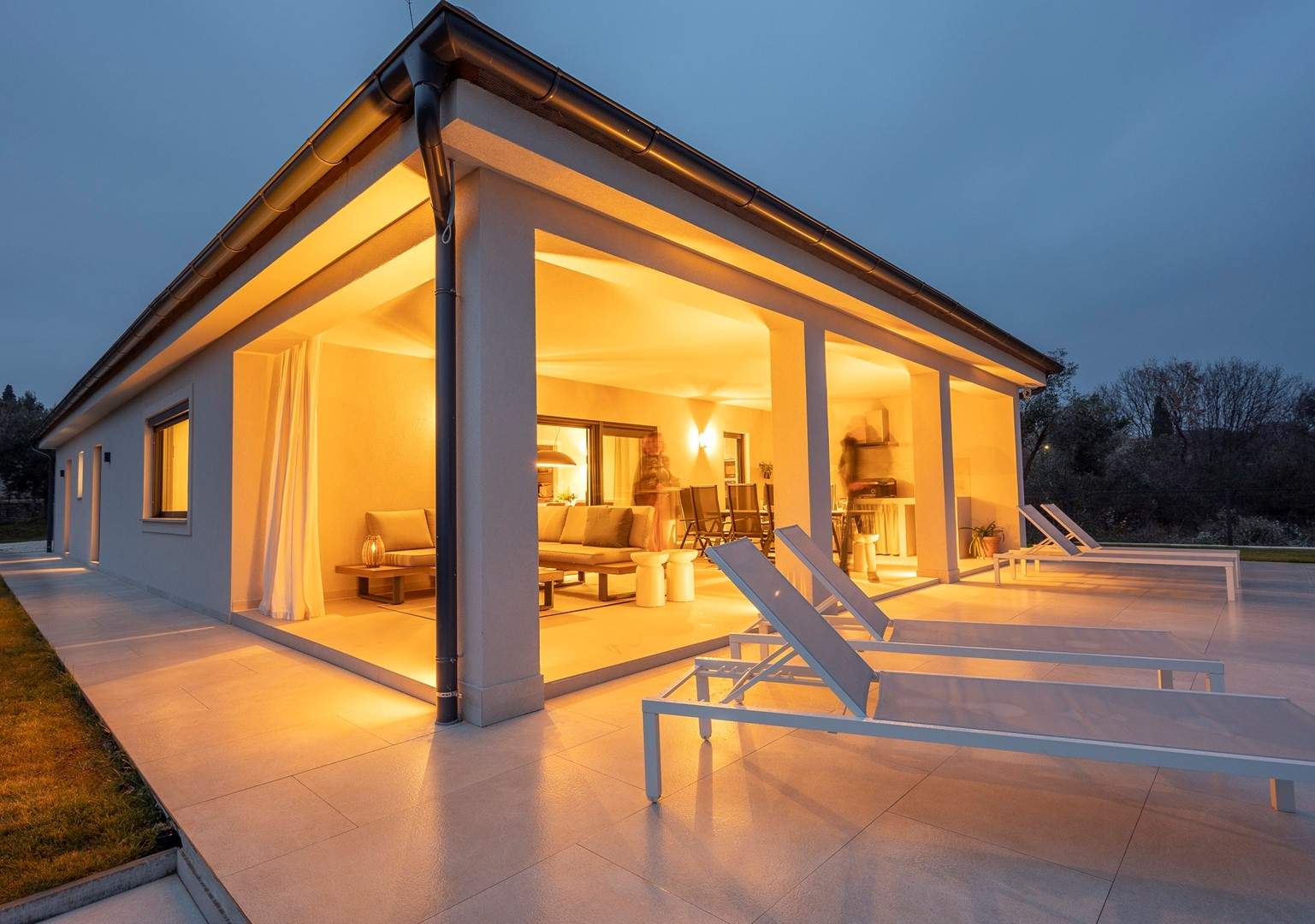 Eine wunderschöne neue Villa im ruhigen Dorf Golaš, nahe Bale, ist die perfekte Wahl für alle, die Privatsphäre, Komfort und völlige Ruhe im Herzen der Natur suchen. Umgeben von einem Olivenhain und einem großzügigen Grundstück von 4.000 m2 bietet diese elegante Immobilie ein Gefühl von Freiheit und Entspannung – fernab vom Stadttrubel. Die Villa verfügt über drei modern eingerichtete und klimatisierte Schlafzimmer sowie drei stilvolle Badezimmer und ist damit ideal für Familien oder Paare, die Komfort und Privatsphäre genießen möchten. Das geräumige Wohnzimmer ist mit einer voll ausgestatteten Küche und einem Essbereich verbunden und schafft einen hellen, offenen Raum zum gemeinsamen Verweilen. Vom Wohnbereich aus gelangt man direkt auf die überdachte Terrasse und zum privaten Swimmingpool mit Blick auf die umliegende Natur. Der Außenbereich ist perfekt gestaltet, um das Leben im Freien zu genießen – ein privater Pool, eine Sonnenterrasse und eine große Terrasse laden zu entspannten Sommermorgen oder stimmungsvollen Abenden bei Sonnenuntergang ein. Den Gästen steht zudem ein gesicherter Parkplatz auf dem Grundstück zur Verfügung. Diese Villa ist der ideale Rückzugsort für einen ruhigen und erholsamen Urlaub – ob mit der Familie oder bei einem romantischen Aufenthalt zu zweit. Die Kombination aus modernem Komfort, natürlicher Umgebung und vollständiger Privatsphäre macht sie zum perfekten Ort für unvergessliche Erinnerungen. Der nächste Strand befindet sich 9 km entfernt im Feriencamp Mon Perin. Eine Strand-Eintrittskarte für das nahegelegene Camp Mon Perin ist im Mietpreis inbegriffen.
