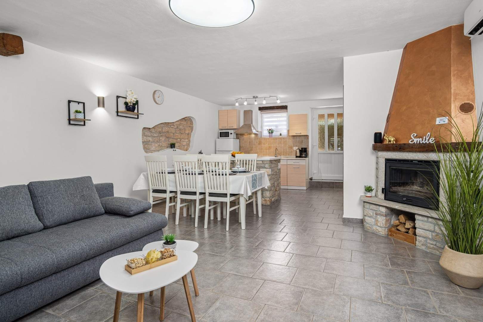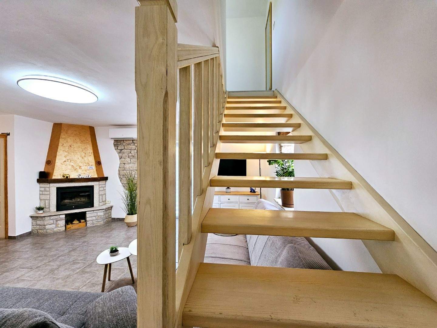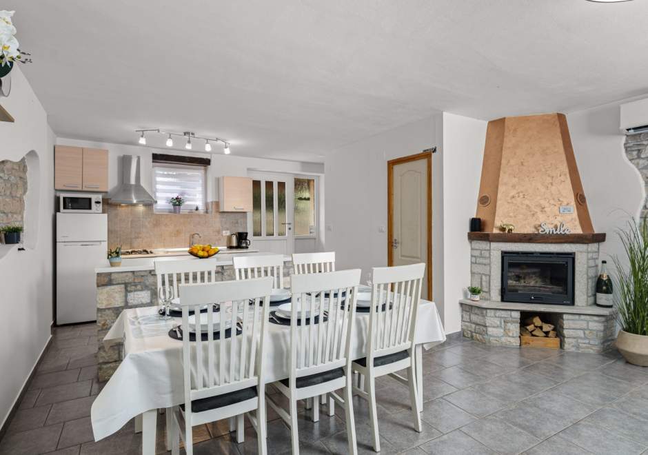 Willkommen im Ferienhaus Istria Pipo, einem authentischen istrischen Steinhaus im malerischen und ruhigen Dorf Pilati bei Pazin. Dieses renovierte Haus mit privatem Pool und atemberaubendem Blick auf den Naturpark Učka ist der perfekte Ort für alle, die Natur, Ruhe und Komfort genießen möchten – fernab vom Stadtlärm und doch in der Nähe aller Attraktionen Istriens. Die Villa Istria Pipo erstreckt sich über zwei Etagen und bietet 90 m2 elegante Wohnfläche für bis zu sechs Gäste. Die Inneneinrichtung vereint traditionellen istrischen Stil mit modernen Akzenten und schafft so eine warme und entspannende Atmosphäre. Im Erdgeschoss befinden sich eine voll ausgestattete Küche, ein Essbereich, ein gemütliches Wohnzimmer mit Kamin und Zugang zum Garten, ein Gäste-WC sowie eine überdachte, efeubewachsene Eingangsterrasse – der ideale Ort für einen Morgenkaffee im Schatten. Im Obergeschoss erwarten Sie zwei Doppelzimmer und zwei Badezimmer. Hinter dem Haus liegt ein großzügiger, umzäunter Garten, der absolute Privatsphäre und Ruhe bietet. Hier erwartet Sie ein privater Pool mit sechs bequemen Liegen, ein Essbereich im Freien, ein Grill für regionale Spezialitäten und Plätze zum Entspannen in Sonne oder Schatten. Ideal für Familien, Paare, Naturliebhaber und alle, die einen ruhigen Urlaub verbringen möchten. Haustiere sind nach vorheriger Absprache willkommen.
