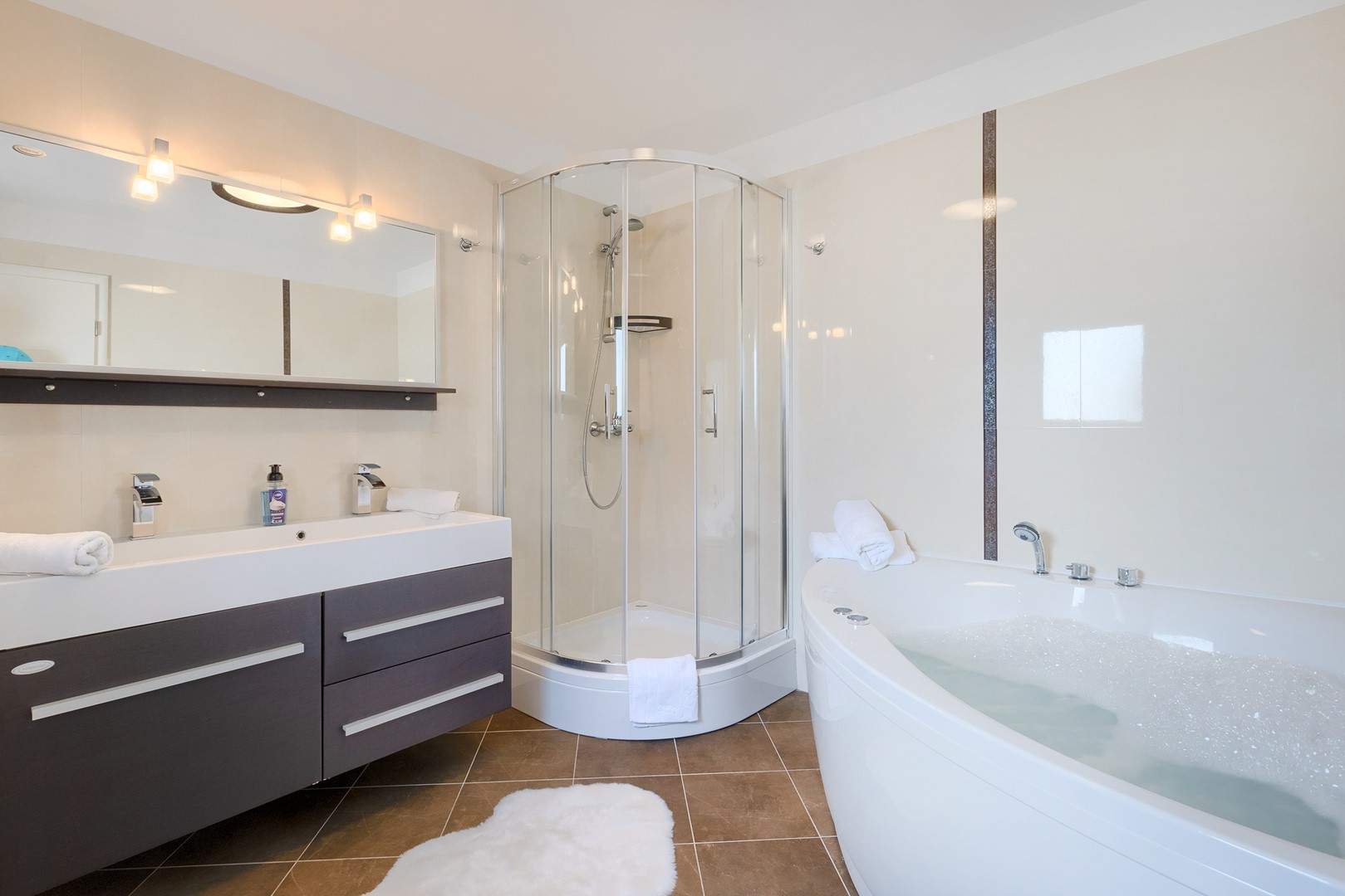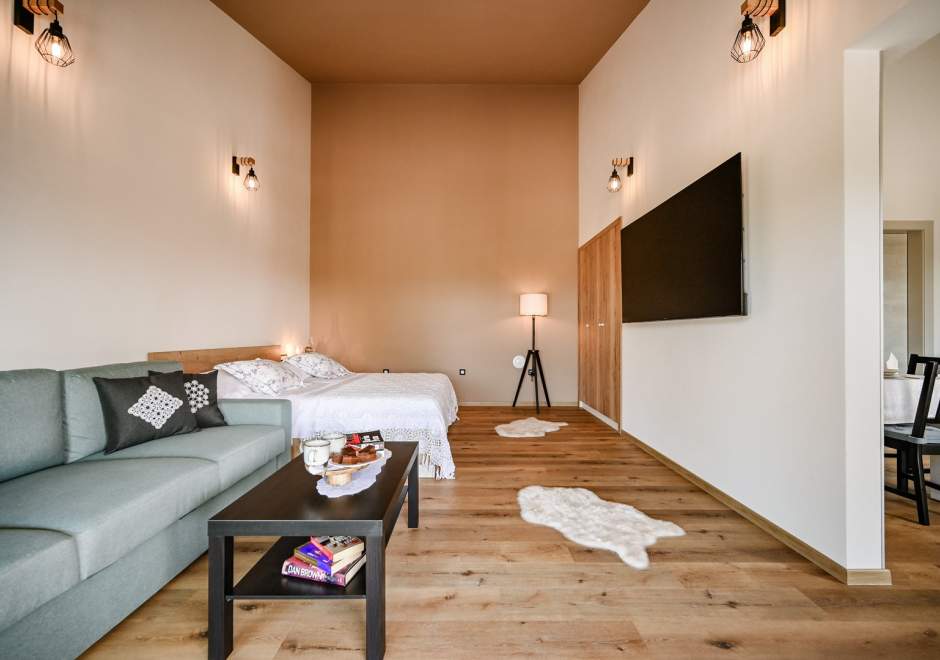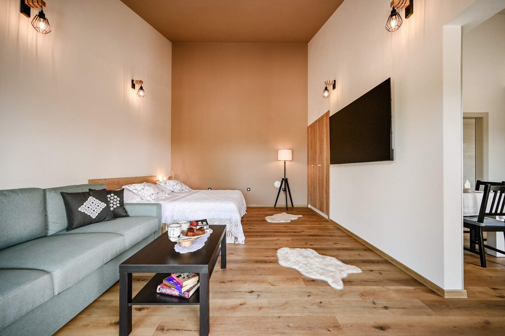 Im Inneren der Villa stechen zwei Schlafzimmer hervor, die jeweils mit raffinierten Details und bequemen Möbeln ausgestattet sind. Ein großes geschlossenes Esszimmer mit angeschlossener Küche schafft eine warme Atmosphäre für Familientreffen und Zusammenkünfte mit Freunden. Innerhalb des großen Anwesens befindet sich ein separates Haus, in dem sich eine weitere komplett und modern ausgestattete Wohnung für 4 Personen befindet. Dieses Apartment besteht aus einem Schlafzimmer und einem Wohnzimmer mit einem Schlafsofa für zwei weitere Personen, einem Badezimmer und einer Küche.