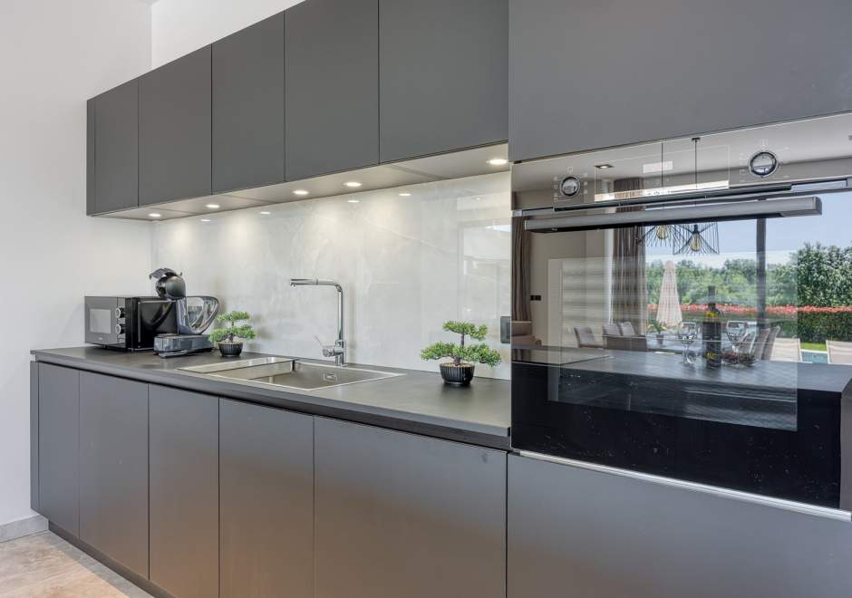The kitchen area (oven, kettle, coffee machine, dishwasher, crockery, glasses, cups, pots, bowls, cutlery, microwave, refrigerator, freezer, ...) should be emphasized in terms of the equipment in the villa.