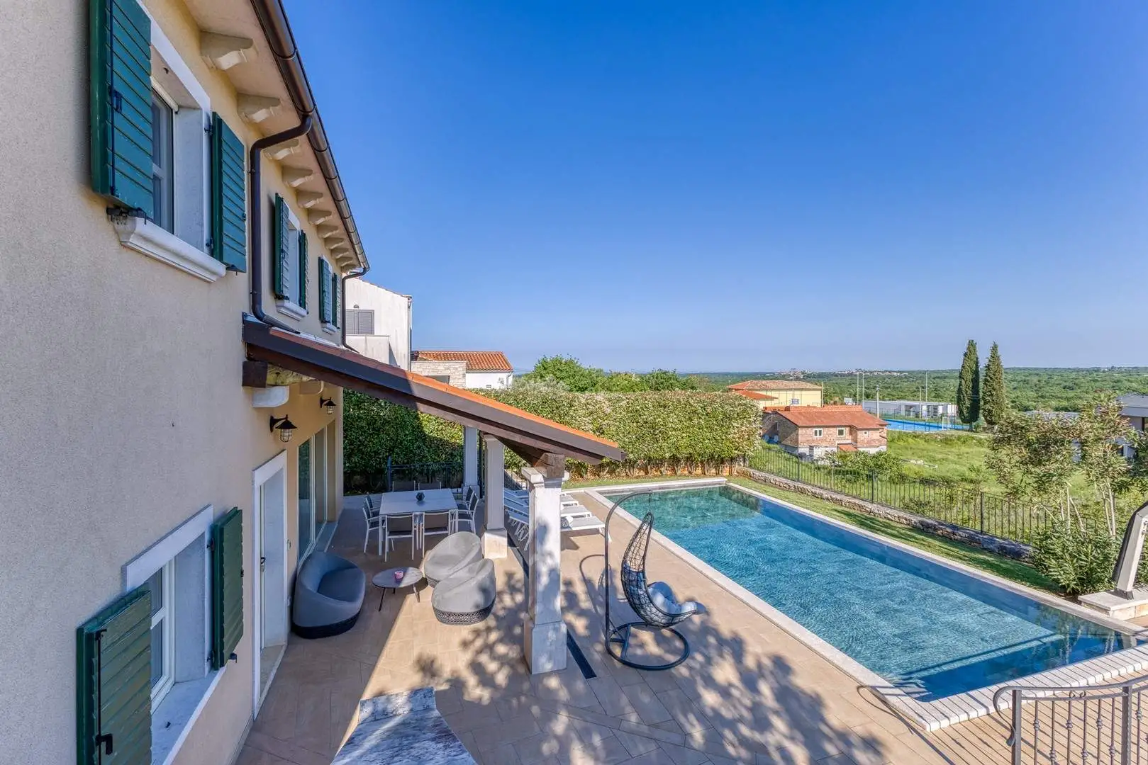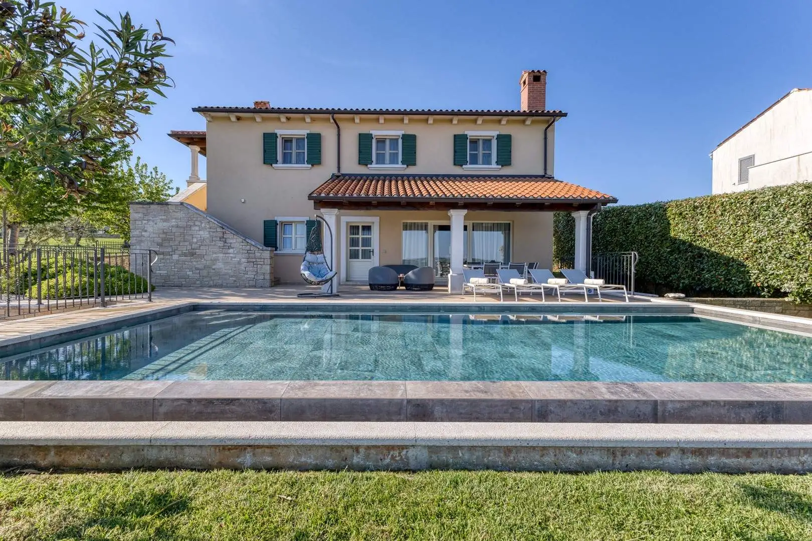 The spacious yard, swimming pool (which can be heated), outdoor kitchen and beautiful view create the ideal atmosphere for socializing, fun and relaxation.