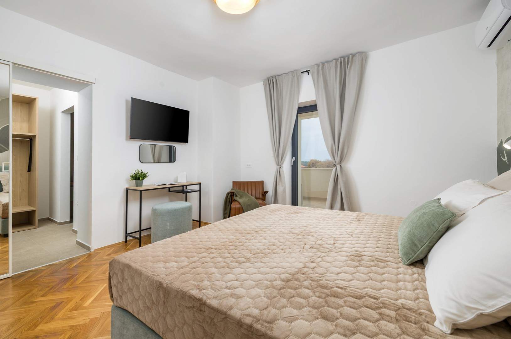 Villa Marija is a modern holiday villa with a private 44 m² infinity pool, located in the heart of Medulin within walking distance of beaches, restaurants, shops, and bars. Set on an 800 m² plot, it offers 280 m² of stylish living space for up to 8 guests. The villa features four air-conditioned bedrooms, each with a private bathroom, TV, and mosquito nets; two rooms have balcony access. The ground floor includes a bright living area, dining space, fully equipped kitchen, covered terrace with barbecue, guest toilet, and laundry room. Outdoors are a sun deck with loungers, covered dining area, and a private sauna in a garden house. Private parking for four cars. One dog allowed (€15/day). Baby cot and high chair on request. Youth groups only on request. Damage deposit €500.