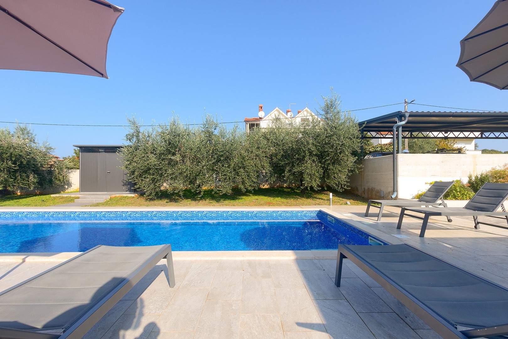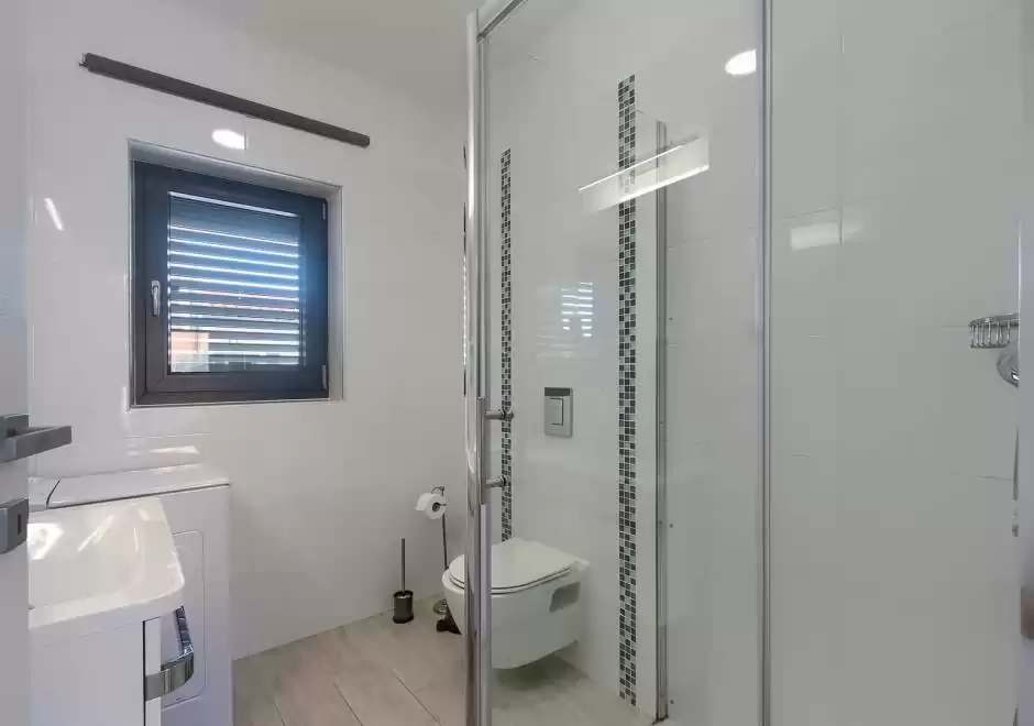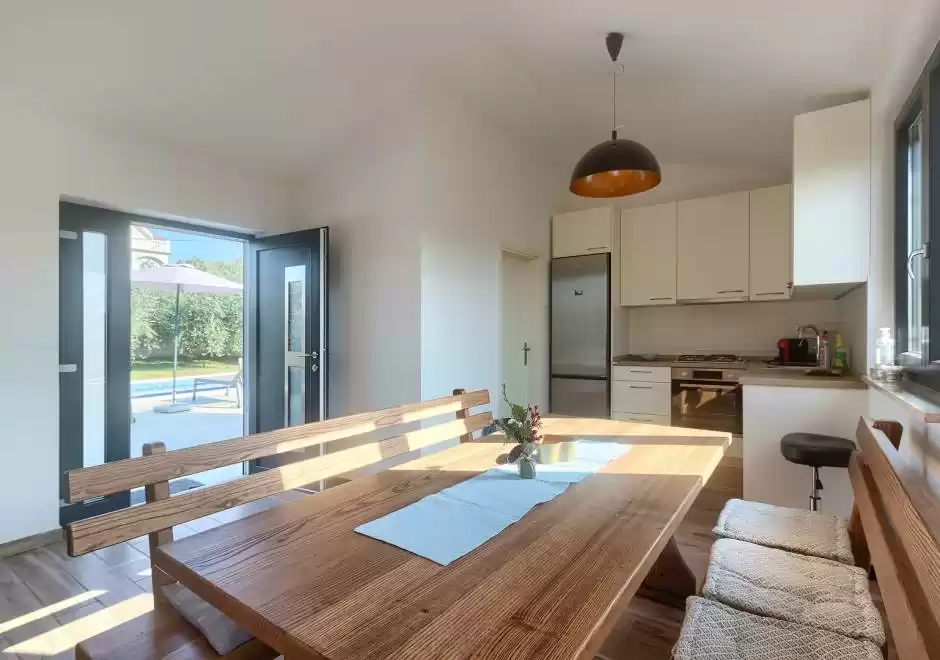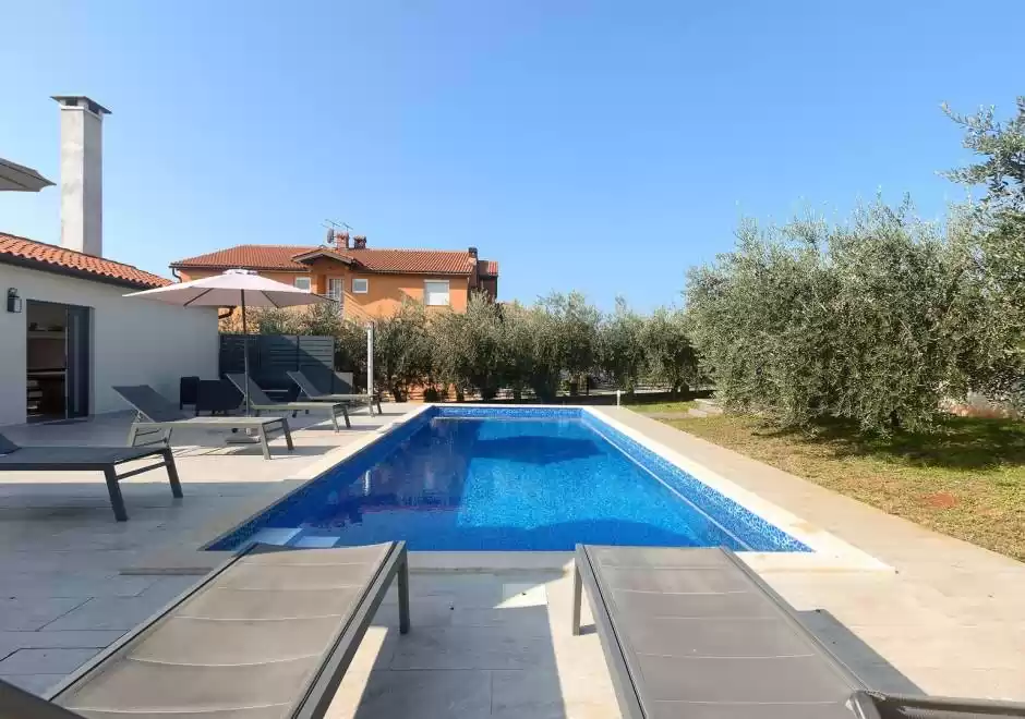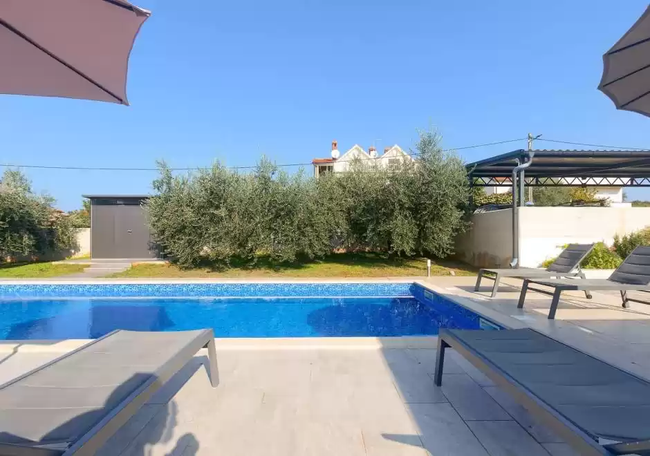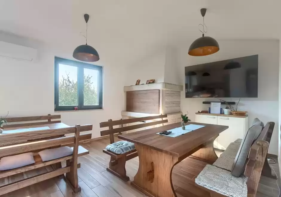 The main house consists of a cozy living room, a fully equipped kitchen with dining area and a modern bathroom with a washing machine. Guests have access to three air-conditioned bedrooms that ensure a comfortable stay even during the hottest summer days. At the back is a separate studio apartment, perfect for guests who want extra privacy. The studio is equipped with a kitchen, double bed, TV, air conditioning and a private bathroom. The property is especially charming with a poolside tavern, decorated as an additional space for socializing and relaxing. Here you will find a seating area, TV, kitchen and bathroom with washing machine — ideal for spending the whole day outdoors without having to return to the main house. The central gathering place is certainly the private pool, surrounded by olive trees that provide natural shade and a Mediterranean atmosphere. Guests are provided with sun loungers, parasols and an outdoor shower, allowing them to fully enjoy the warm and sunny days. The property also offers private parking for three vehicles, ensuring convenience and safety during their stay.