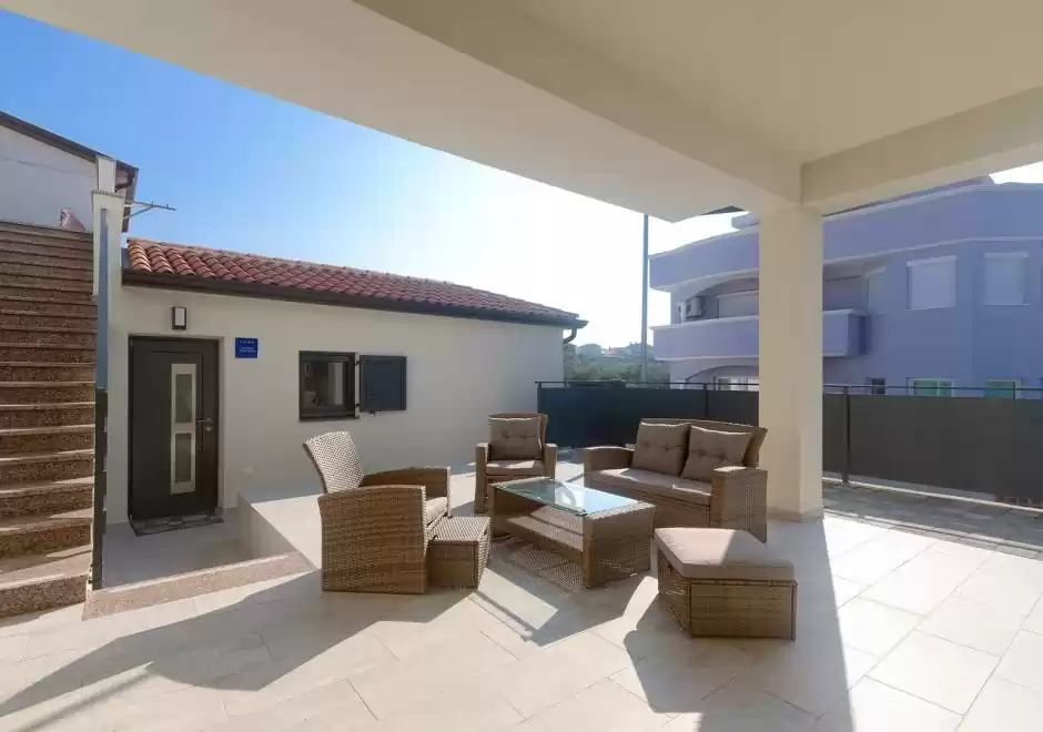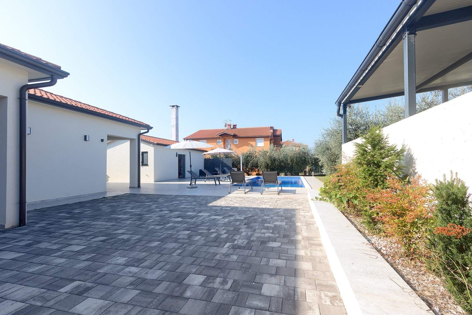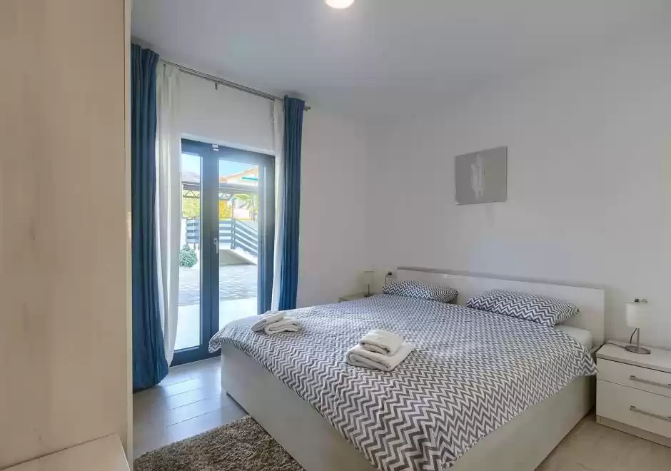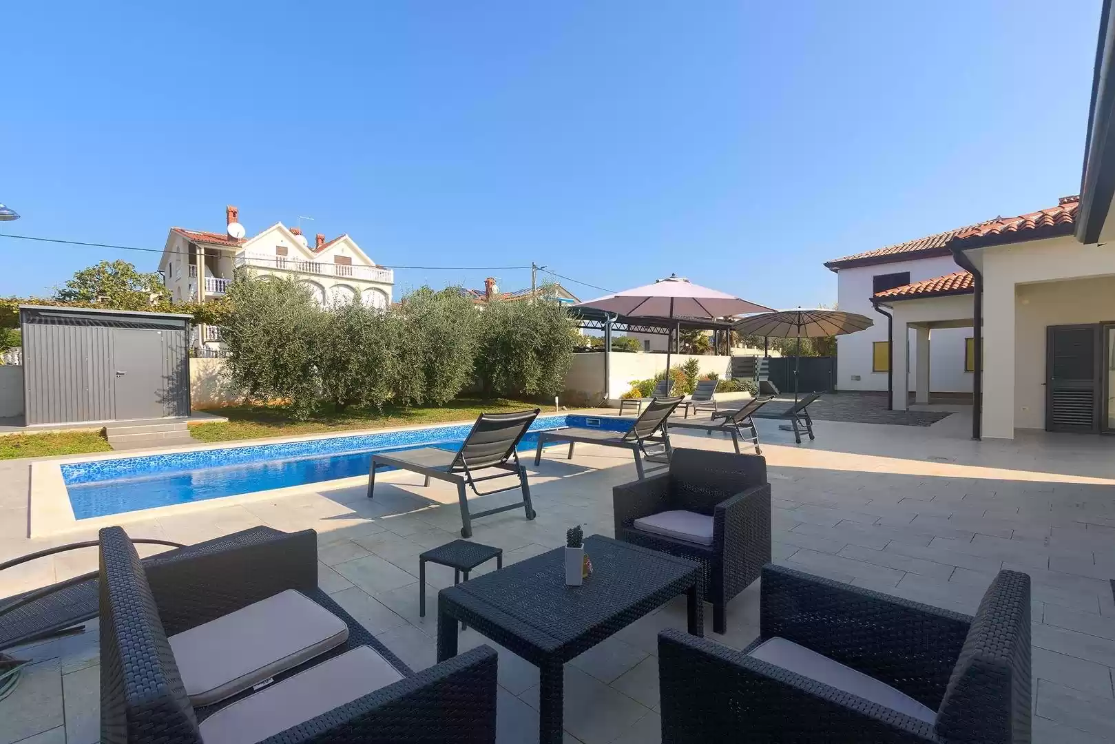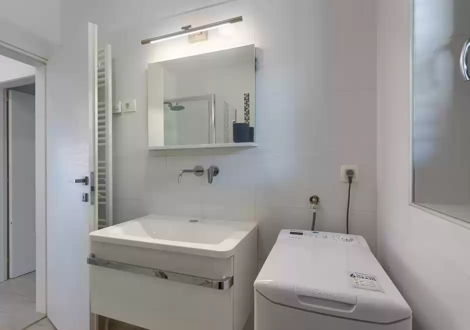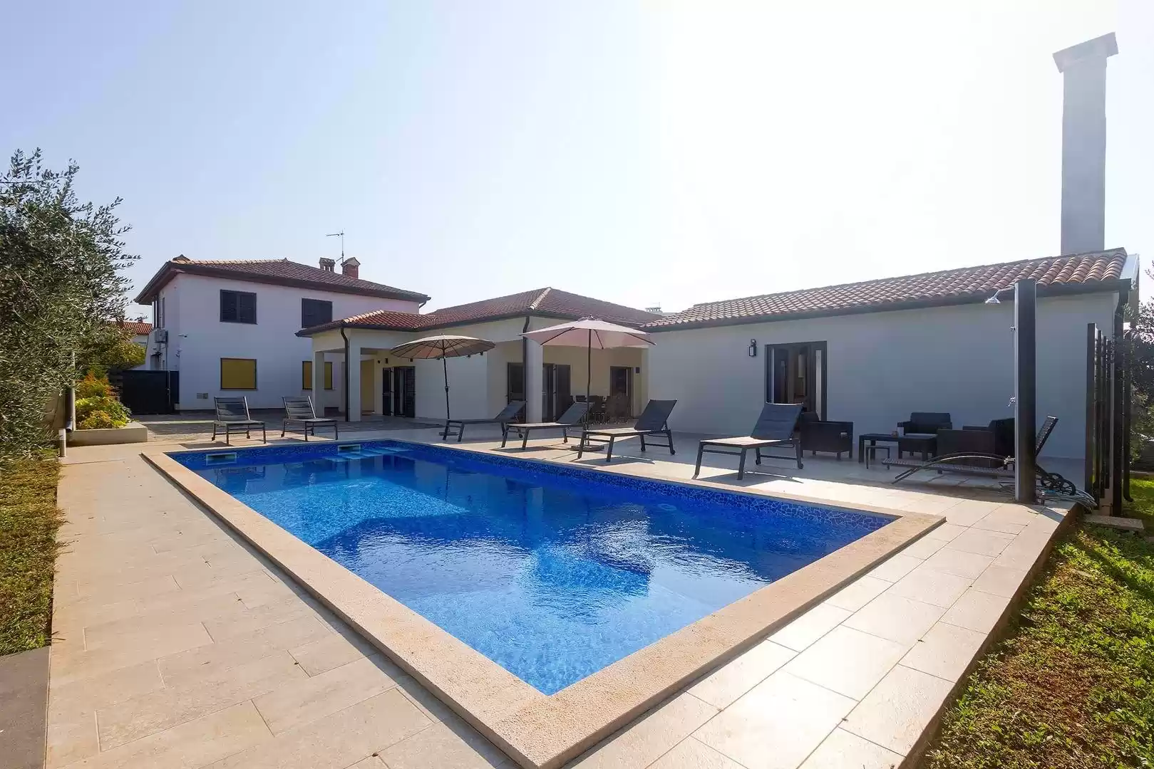The main house consists of a cozy living room, a fully equipped kitchen with dining area and a modern bathroom with a washing machine. Guests have access to three air-conditioned bedrooms that ensure a comfortable stay even during the hottest summer days. At the back is a separate studio apartment, perfect for guests who want extra privacy. The studio is equipped with a kitchen, double bed, TV, air conditioning and a private bathroom. The property is especially charming with a poolside tavern, decorated as an additional space for socializing and relaxing. Here you will find a seating area, TV, kitchen and bathroom with washing machine — ideal for spending the whole day outdoors without having to return to the main house. The central gathering place is certainly the private pool, surrounded by olive trees that provide natural shade and a Mediterranean atmosphere. Guests are provided with sun loungers, parasols and an outdoor shower, allowing them to fully enjoy the warm and sunny days. The property also offers private parking for three vehicles, ensuring convenience and safety during their stay.