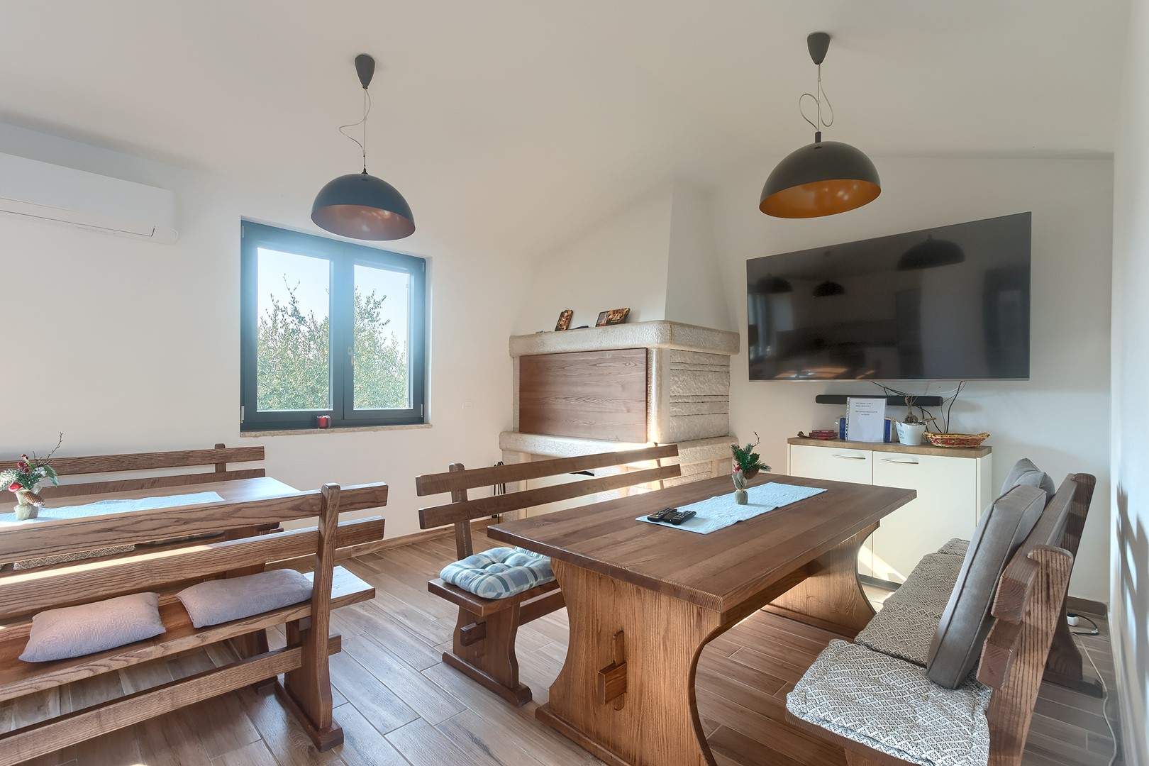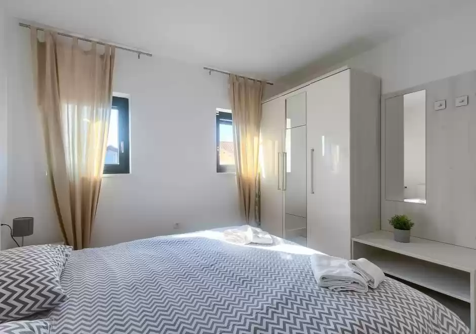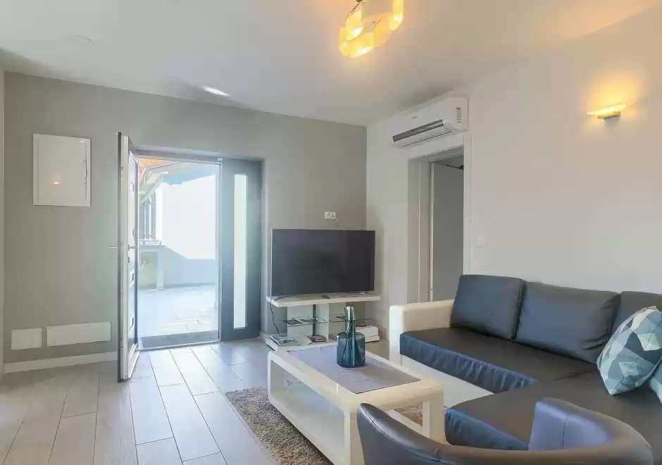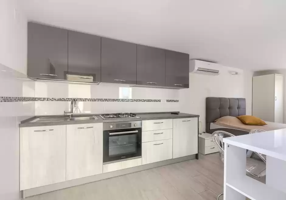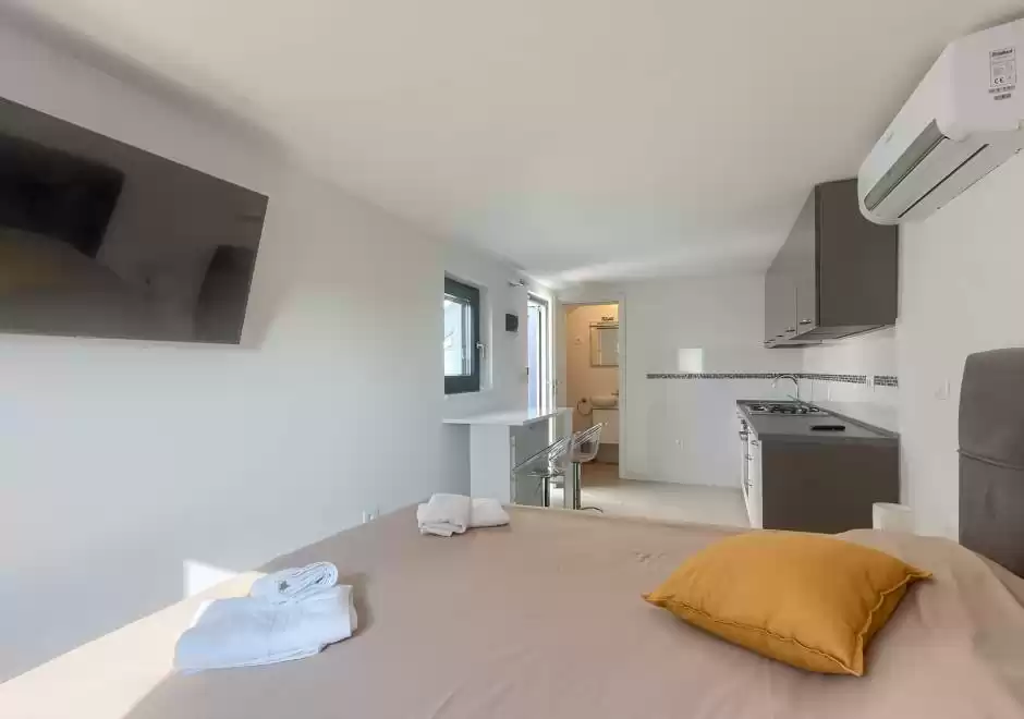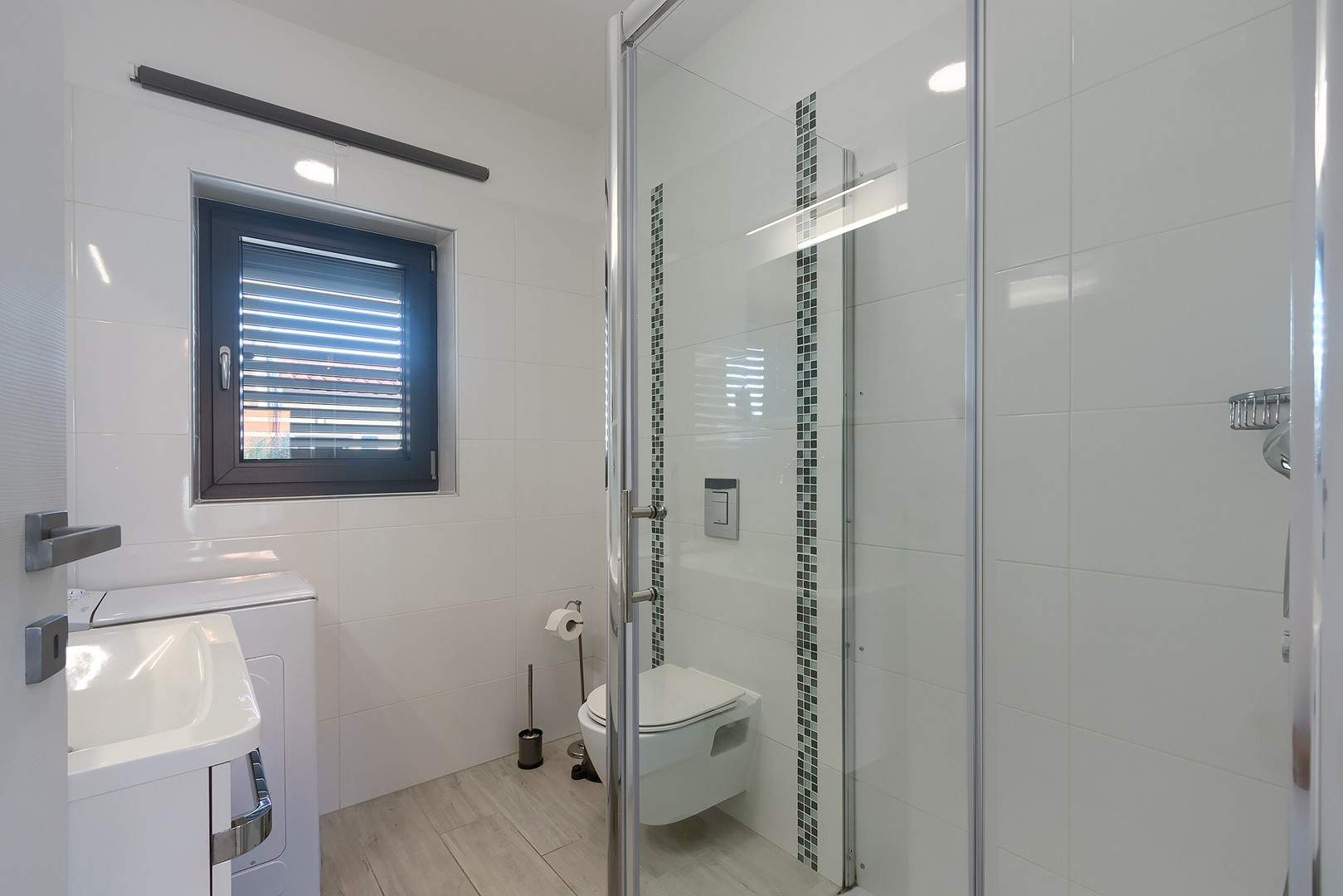 The main house consists of a cozy living room, a fully equipped kitchen with dining area and a modern bathroom with a washing machine. Guests have access to three air-conditioned bedrooms that ensure a comfortable stay even during the hottest summer days. At the back is a separate studio apartment, perfect for guests who want extra privacy. The studio is equipped with a kitchen, double bed, TV, air conditioning and a private bathroom. The property is especially charming with a poolside tavern, decorated as an additional space for socializing and relaxing. Here you will find a seating area, TV, kitchen and bathroom with washing machine — ideal for spending the whole day outdoors without having to return to the main house. The central gathering place is certainly the private pool, surrounded by olive trees that provide natural shade and a Mediterranean atmosphere. Guests are provided with sun loungers, parasols and an outdoor shower, allowing them to fully enjoy the warm and sunny days. The property also offers private parking for three vehicles, ensuring convenience and safety during their stay.