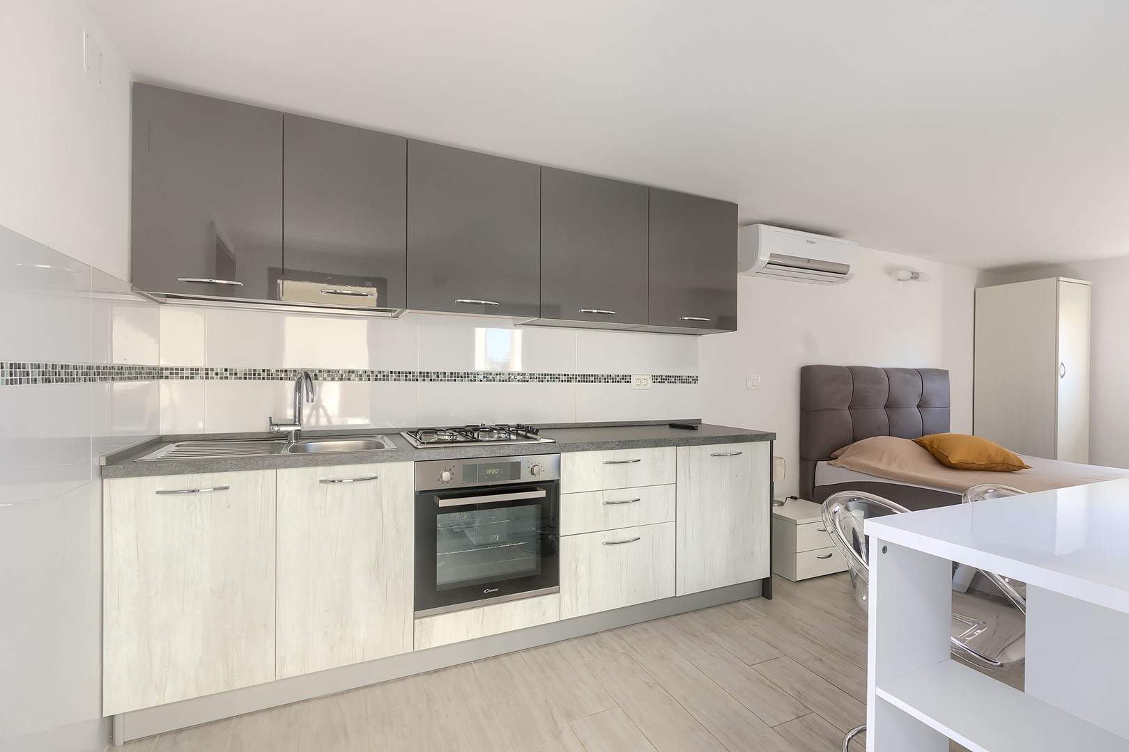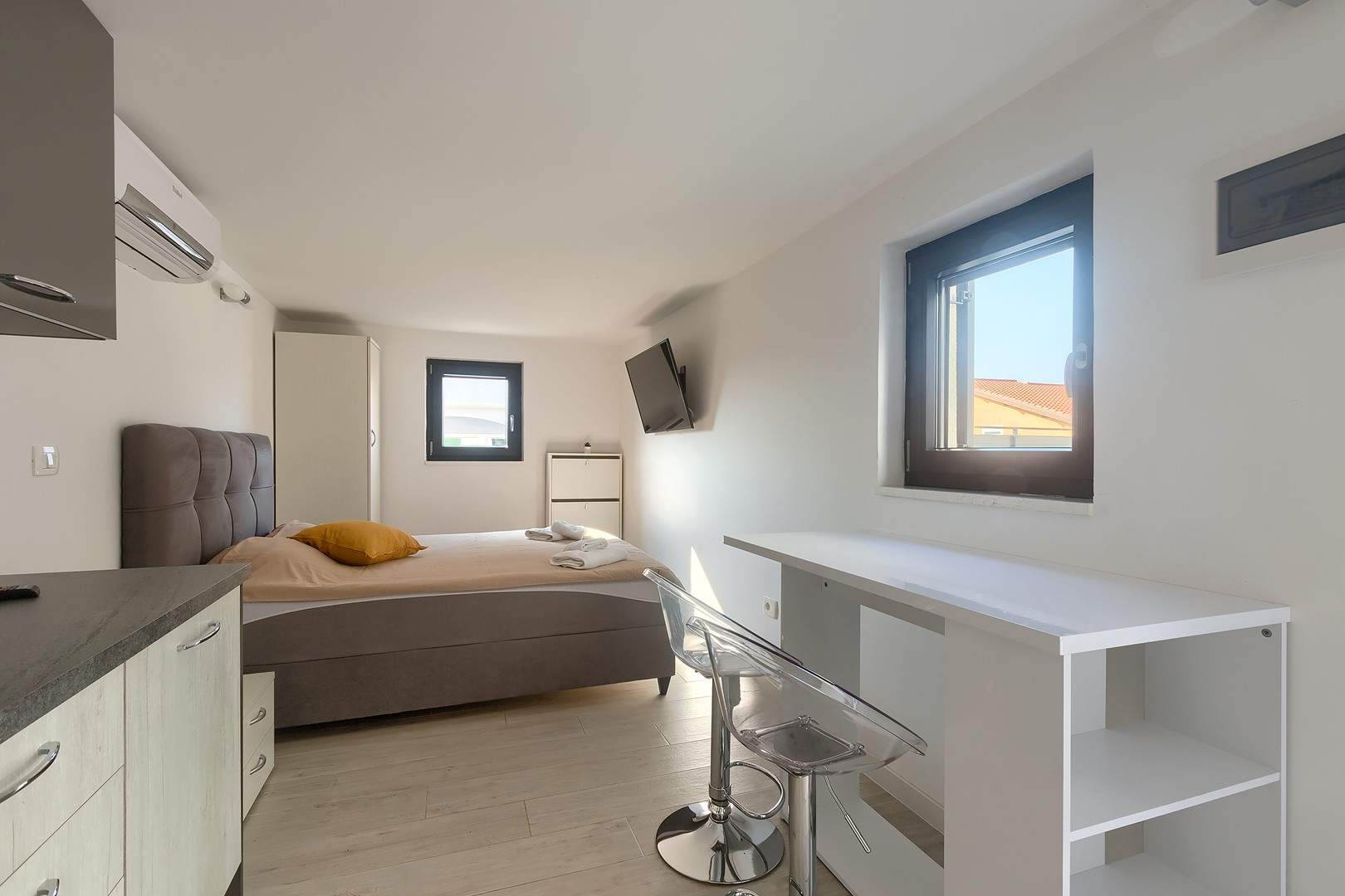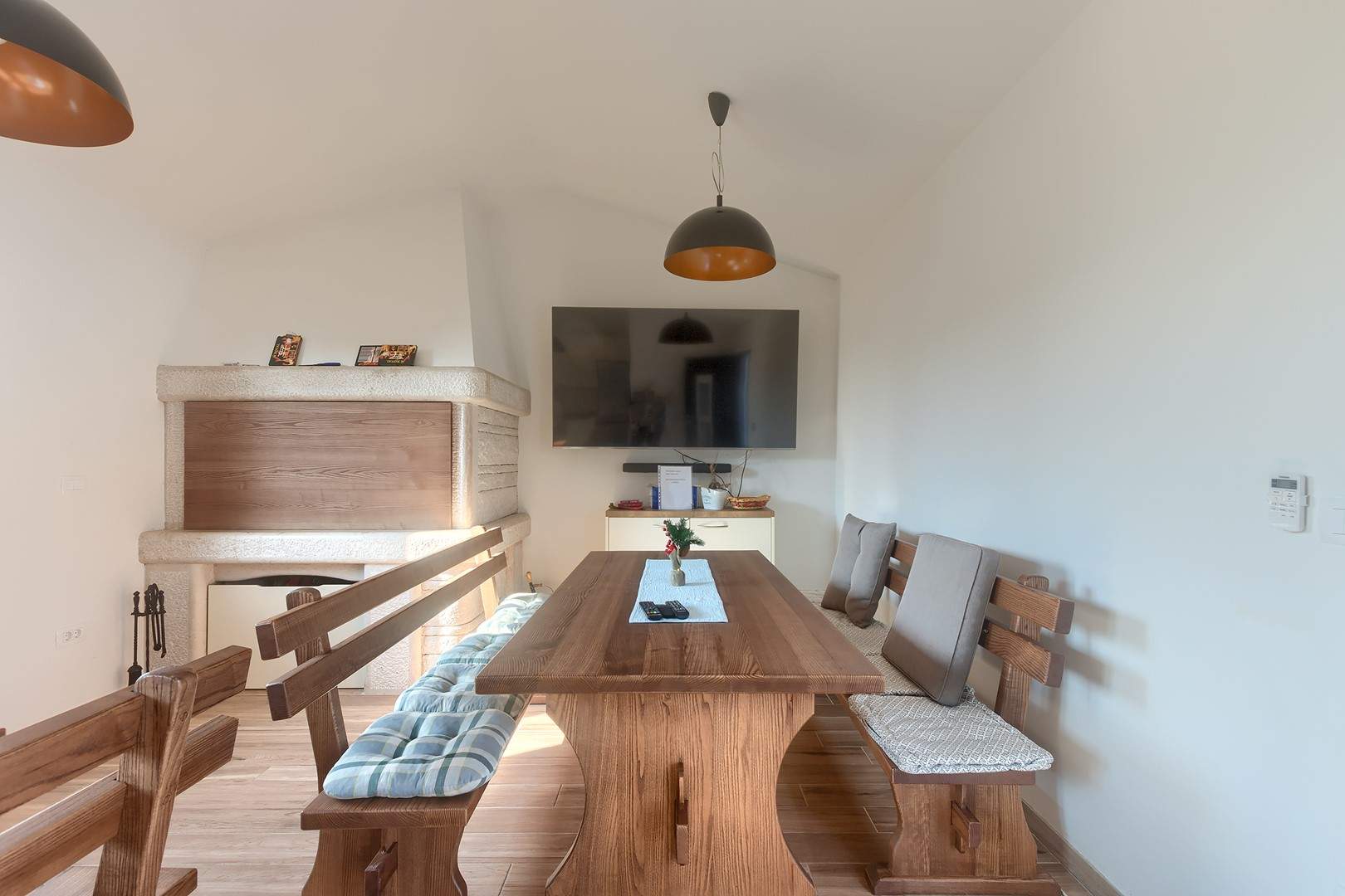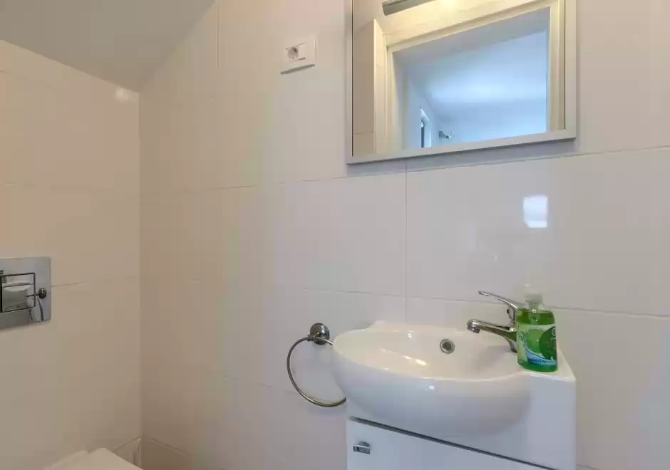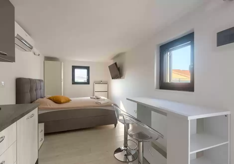 The main house consists of a cozy living room, a fully equipped kitchen with dining area and a modern bathroom with a washing machine. Guests have access to three air-conditioned bedrooms that ensure a comfortable stay even during the hottest summer days. At the back is a separate studio apartment, perfect for guests who want extra privacy. The studio is equipped with a kitchen, double bed, TV, air conditioning and a private bathroom. The property is especially charming with a poolside tavern, decorated as an additional space for socializing and relaxing. Here you will find a seating area, TV, kitchen and bathroom with washing machine — ideal for spending the whole day outdoors without having to return to the main house. The central gathering place is certainly the private pool, surrounded by olive trees that provide natural shade and a Mediterranean atmosphere. Guests are provided with sun loungers, parasols and an outdoor shower, allowing them to fully enjoy the warm and sunny days. The property also offers private parking for three vehicles, ensuring convenience and safety during their stay.