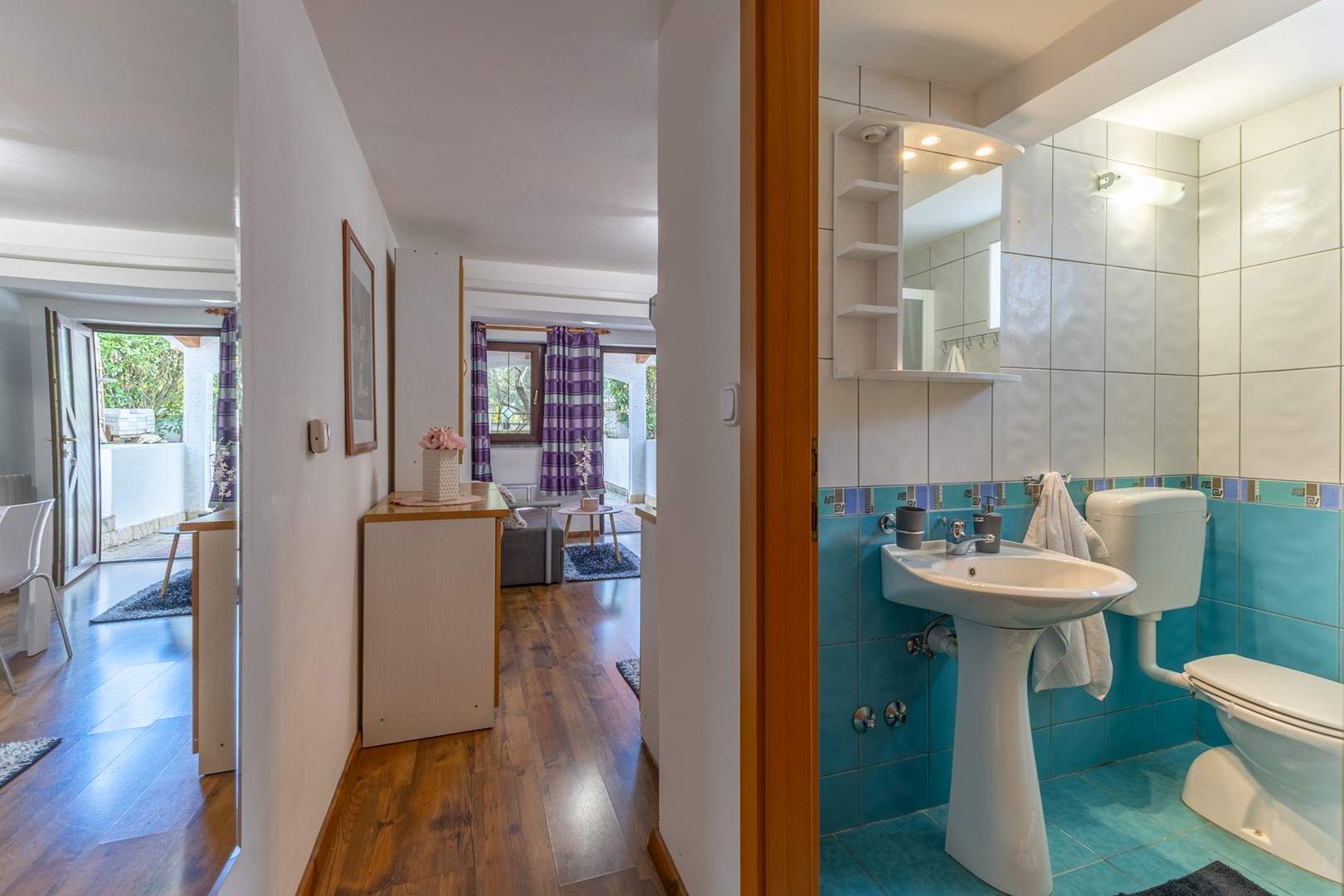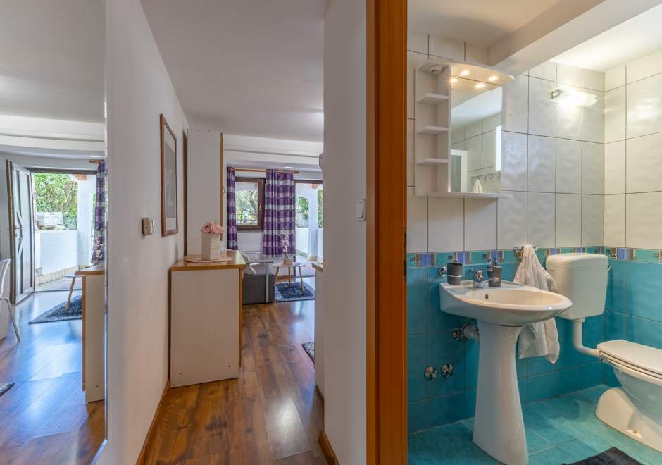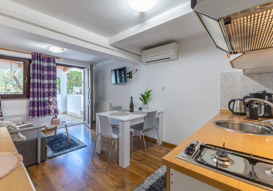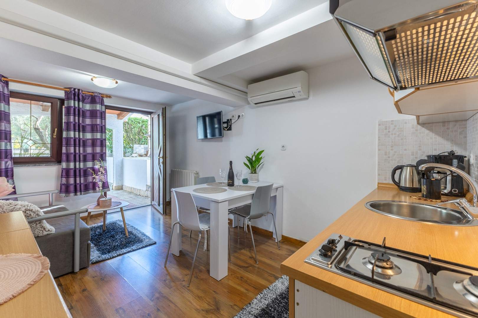 Ovaj ugodan apartman u prizemlju obiteljske kuće idealan je za goste koji traže miran i funkcionalan smještaj u blizini obale. Opremljen je svim potrebnim sadržajima za udoban boravak, uključujući klimatizaciju, besplatni Wi-Fi i osigurano parkirno mjesto ispred kuće. Spavaća soba ima udoban bračni krevet, a kupaonica je opremljena tušem. Dnevni prostor povezuje kuhinju, blagovaonicu i kutak za odmor, a kuhinja sadrži sve osnovne aparate za praktičan boravak. Blagovaonski stol pogodan je za zajedničke obroke, dok dnevni boravak pruža udobno mjesto za opuštanje. U vrtu je natkrivena terasa i vrt, opremljena roštiljem i vrtom garniturom za sve goste, idealne za uživanje u jutarnjoj kavi ili večernjoj čaši vina. Apartman se ističe jednostavnim i funkcionalnim rasporedom te je odlična polazna točka za istraživanje lokalnih atrakcija, plaža i sadržaja.