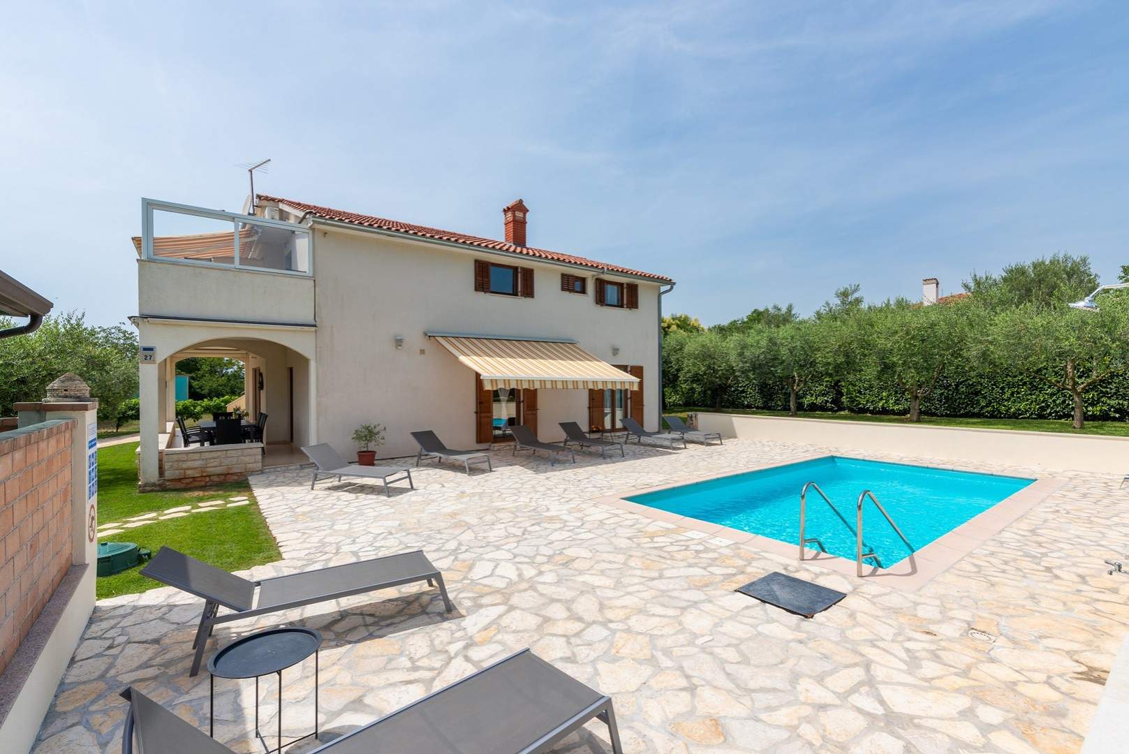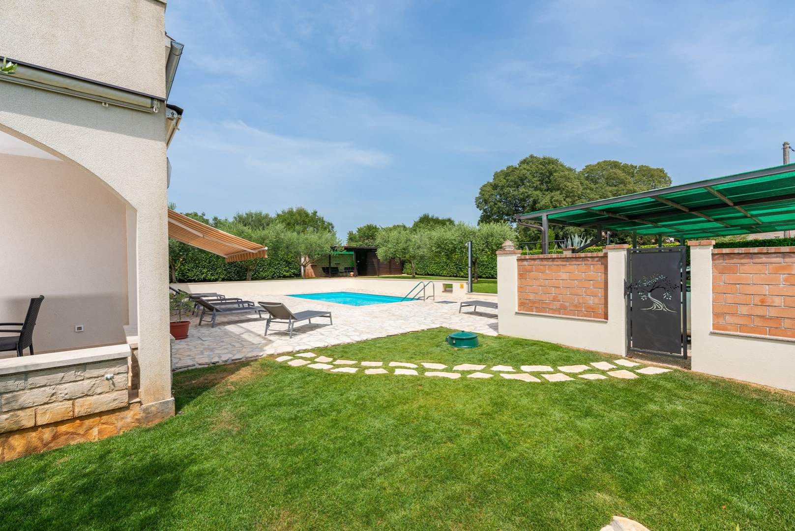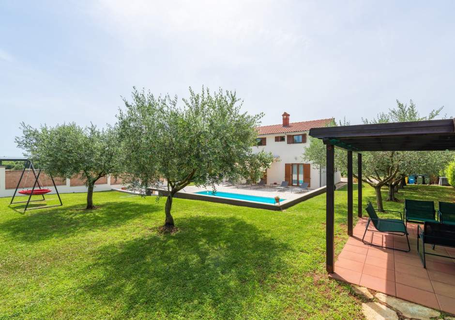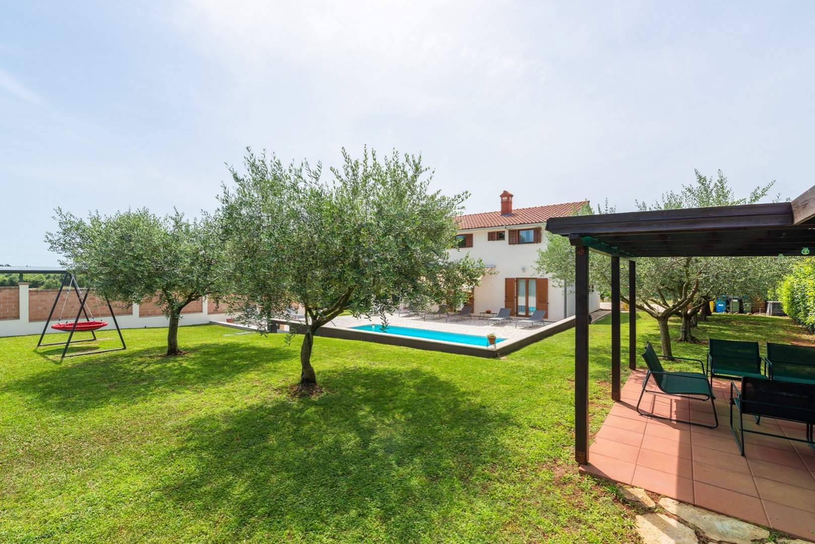 Središnja točka dvorišta je bazen, gdje se možete osvježiti i opustiti u toplim ljetnim danima. Oko bazena su ležaljke i udoban vanjski namještaj, idealni za sunčanje ili čitanje omiljene knjige. Kuća također nudi natkriveni parking prostor kako biste bezbrižno parkirali svoje vozilo.