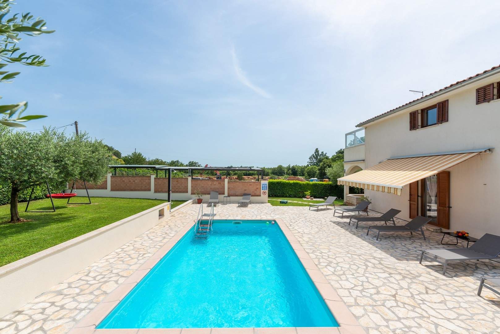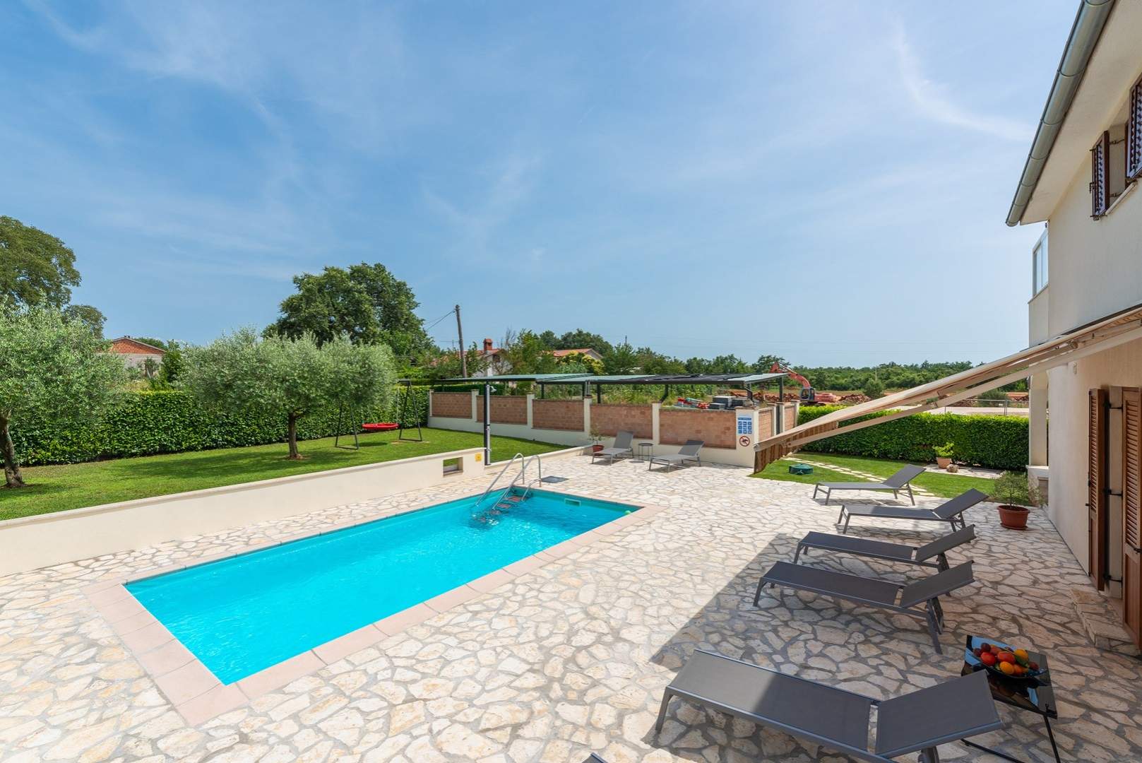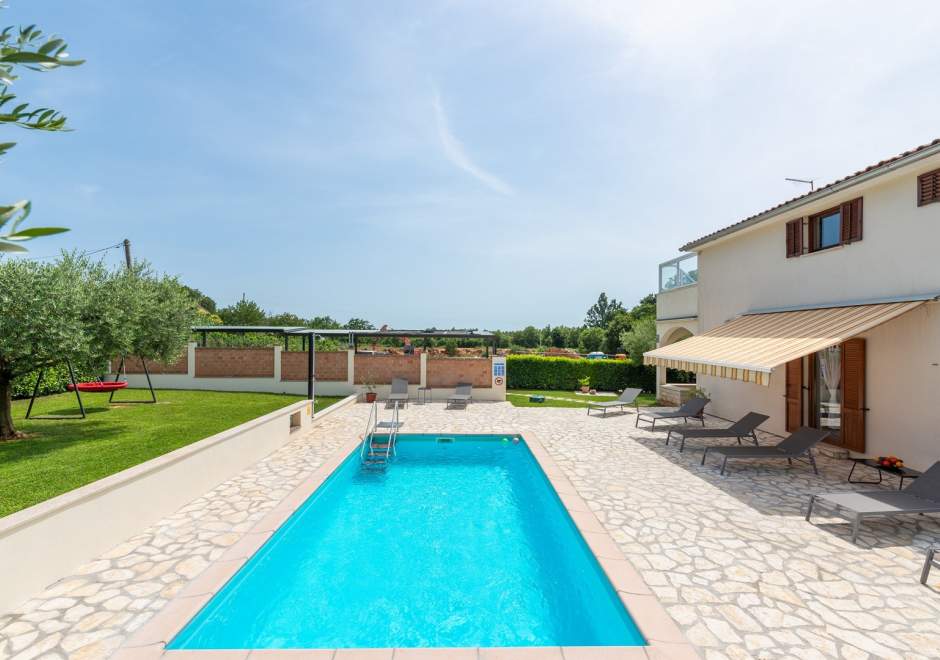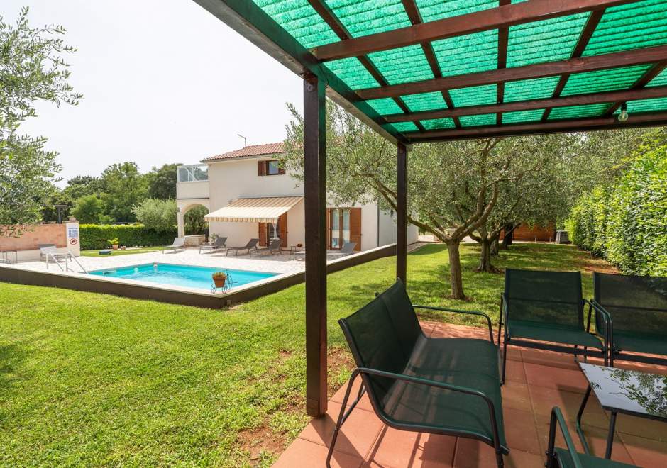 Središnja točka dvorišta je bazen, gdje se možete osvježiti i opustiti u toplim ljetnim danima. Oko bazena su ležaljke i udoban vanjski namještaj, idealni za sunčanje ili čitanje omiljene knjige. Kuća također nudi natkriveni parking prostor kako biste bezbrižno parkirali svoje vozilo.