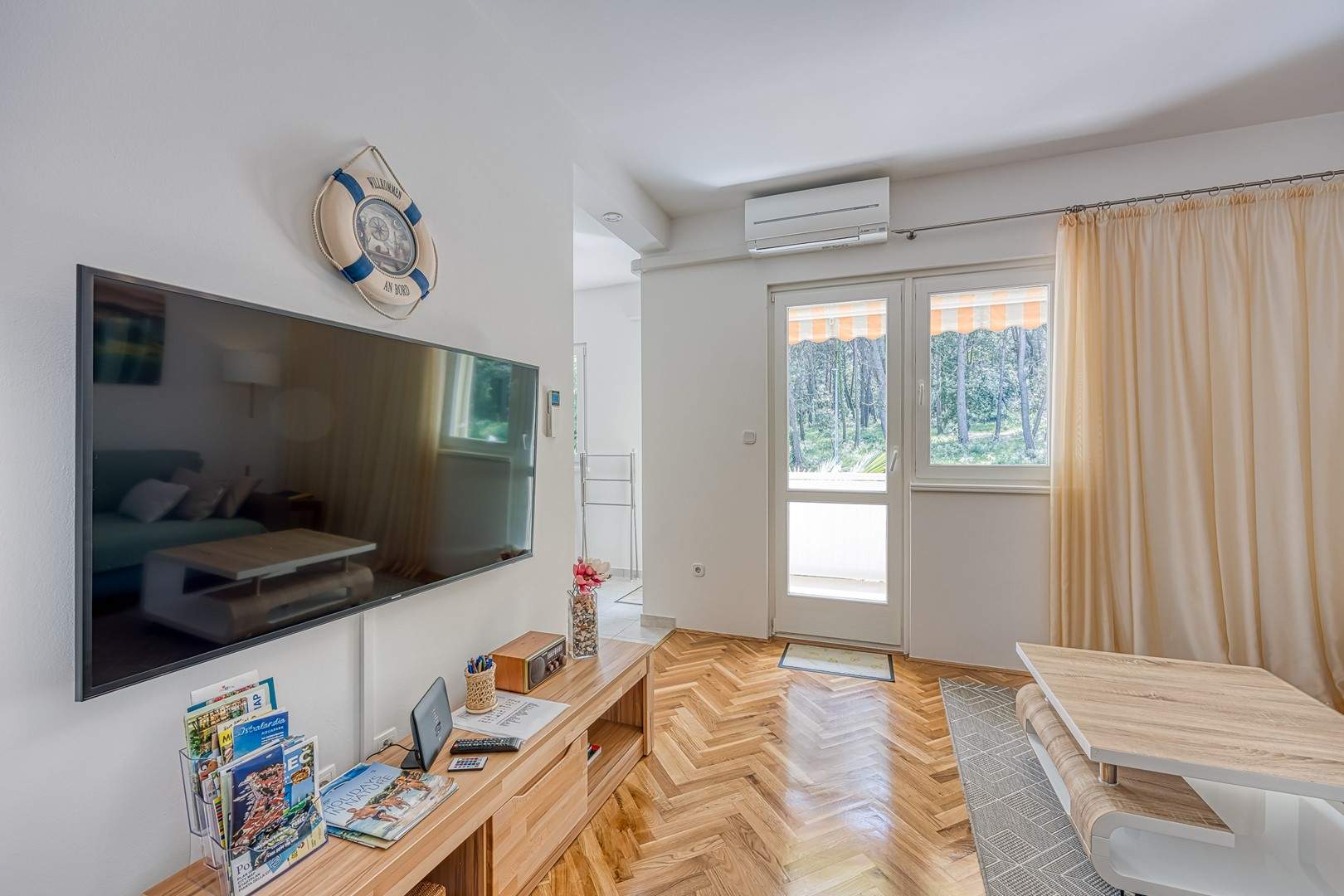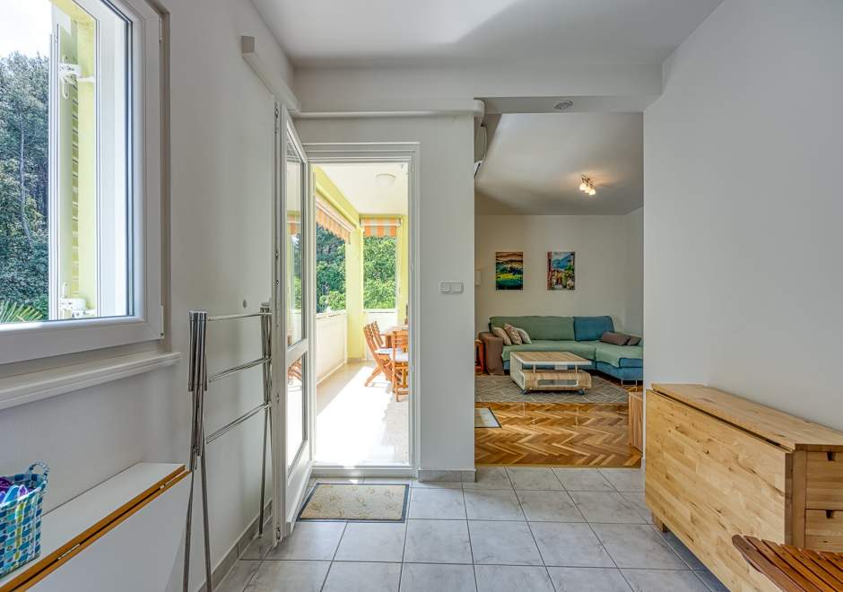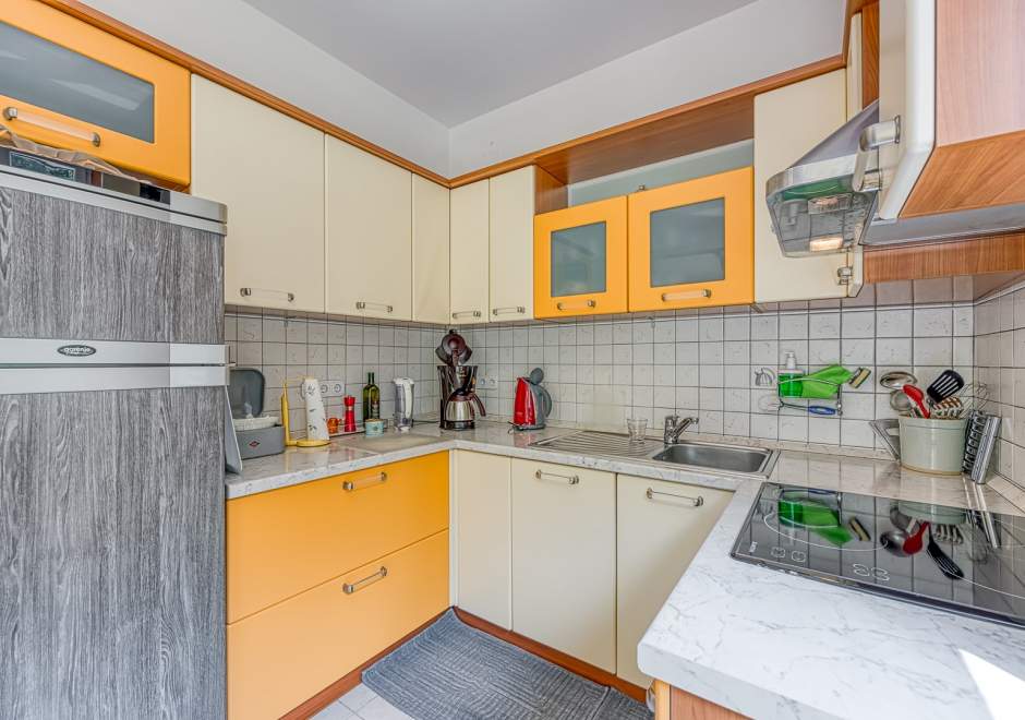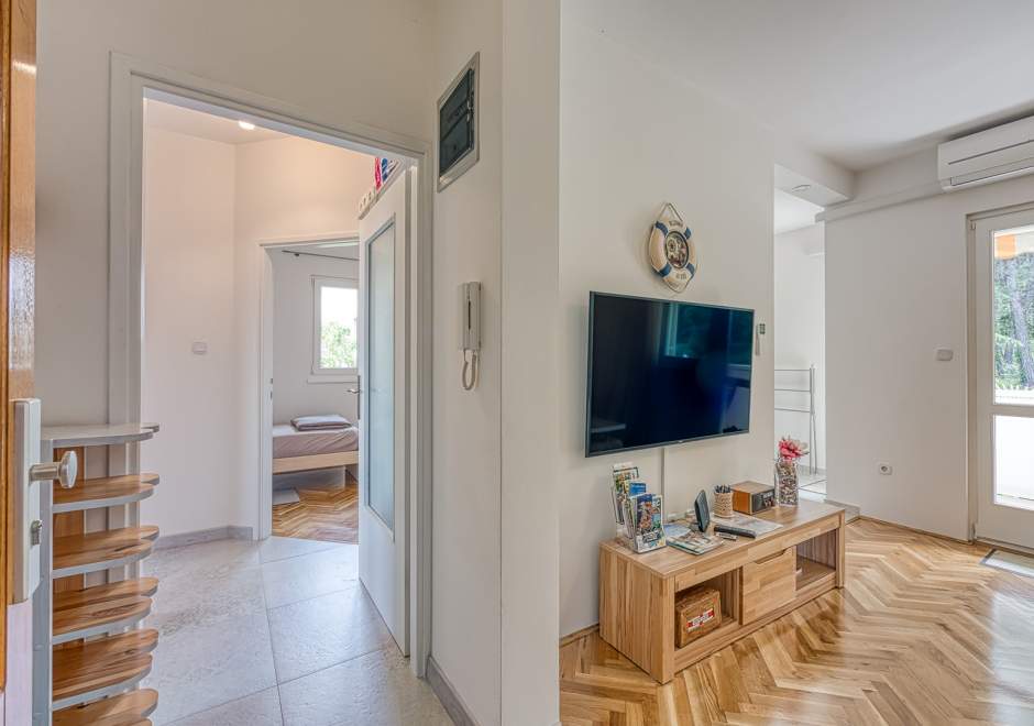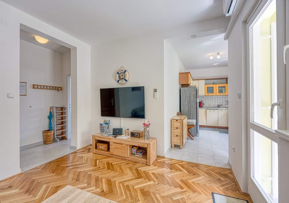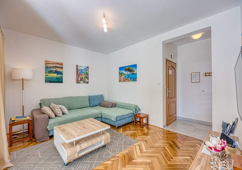 Enterijer apartmana očarava svojom toplinom i udobnošću. Namještaj je odabran s pažnjom kako bi gostima pružio osjećaj doma i udobnosti. Svijetle boje i pažljivo odabrani detalji stvaraju atmosferu koja potiče opuštanje i uživanje.