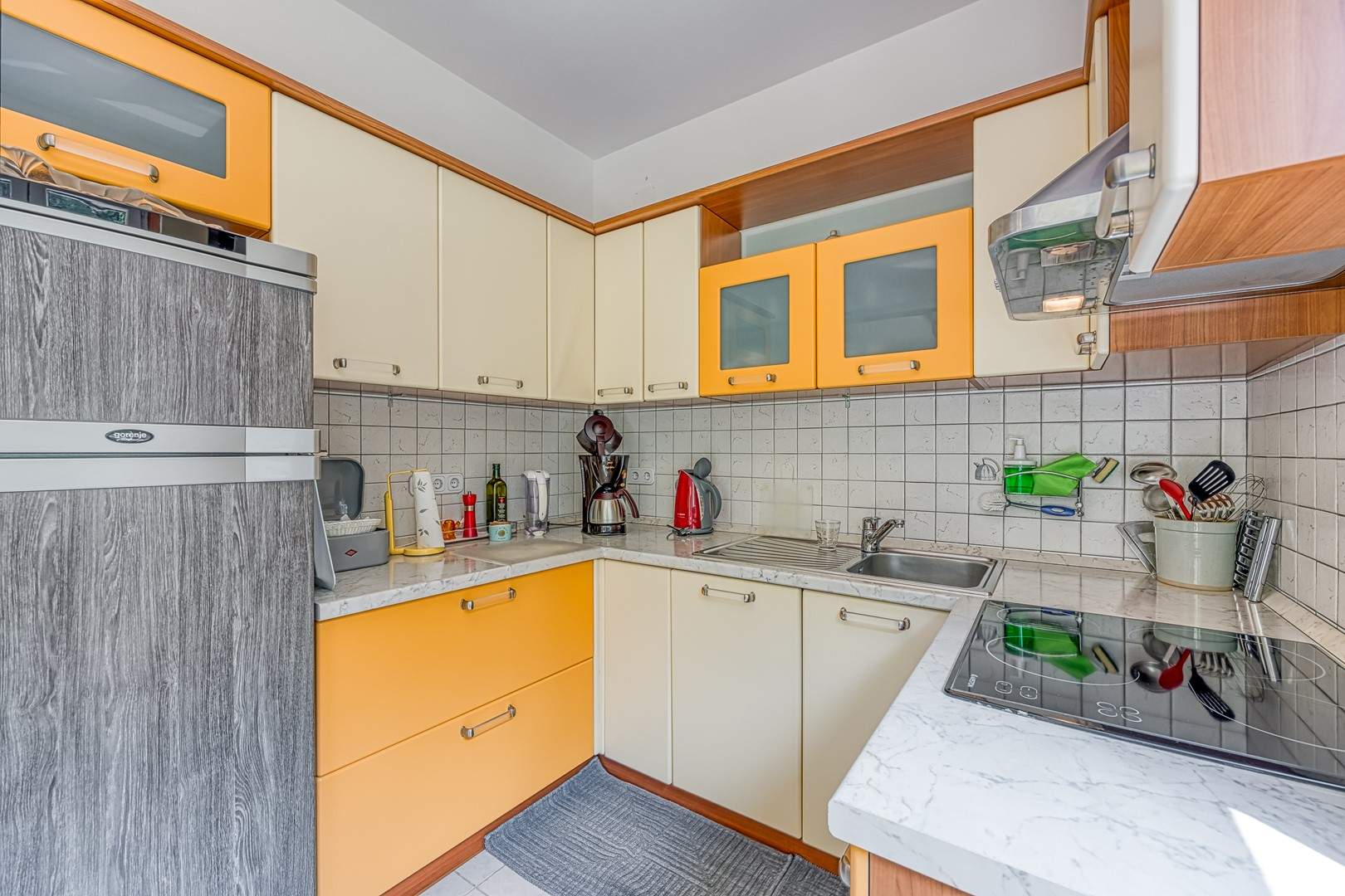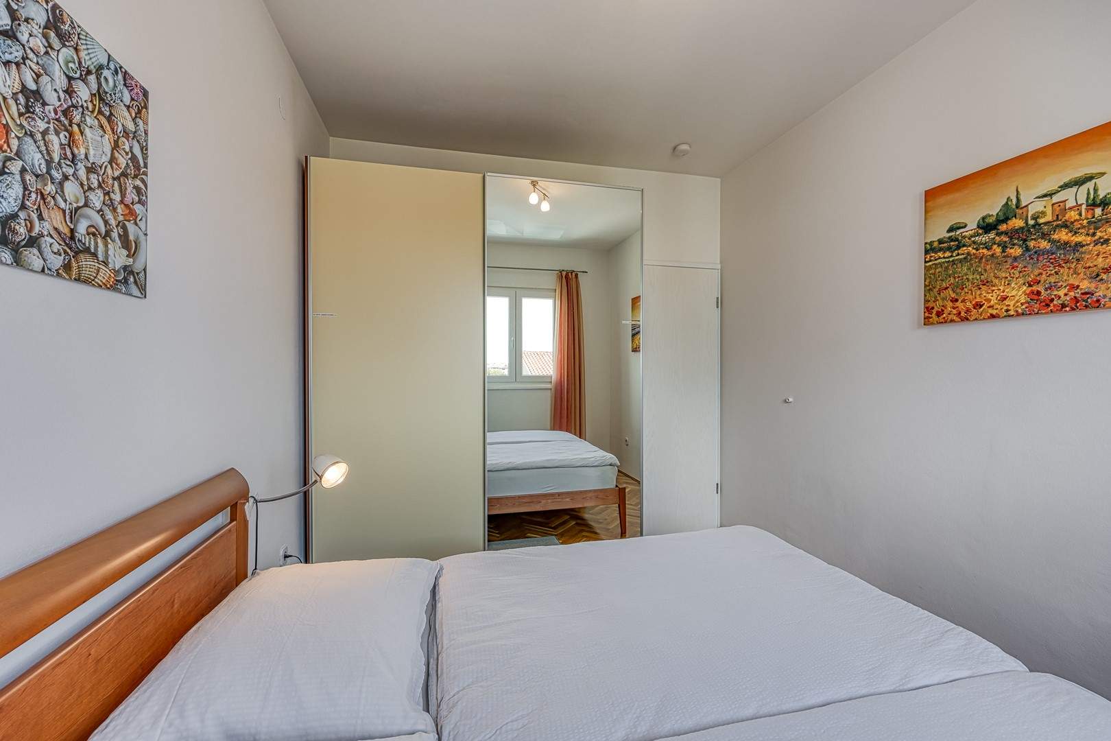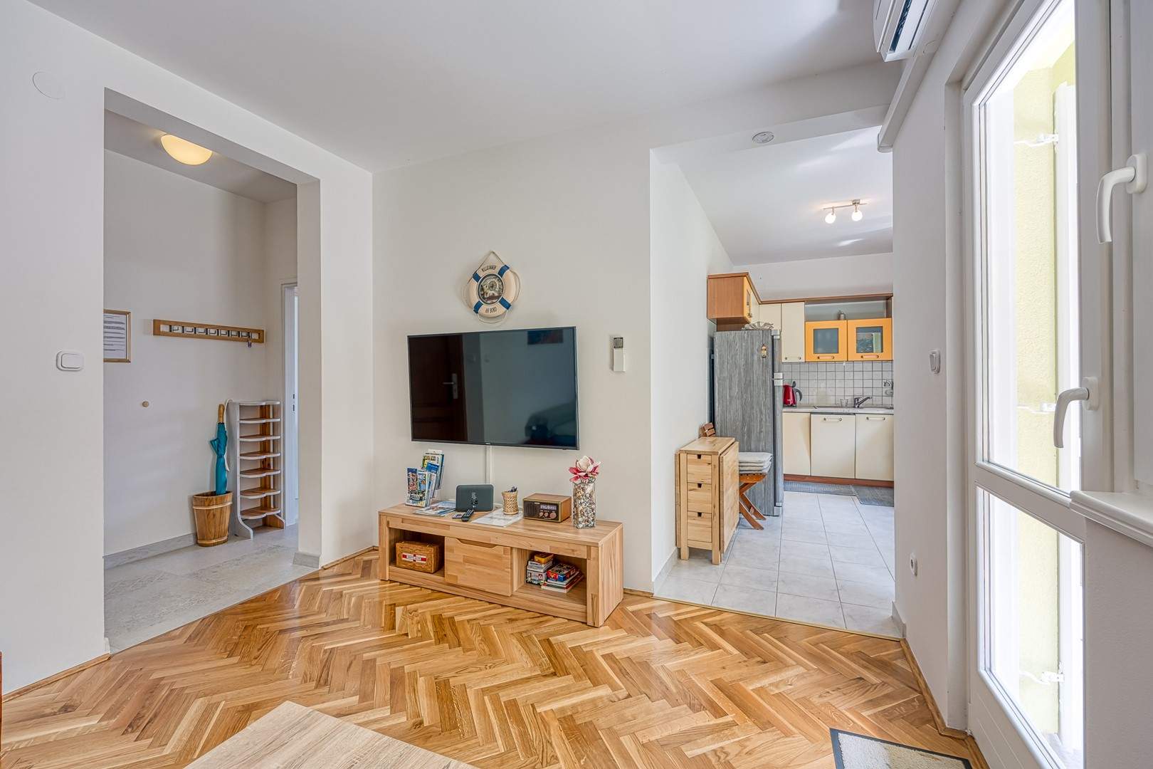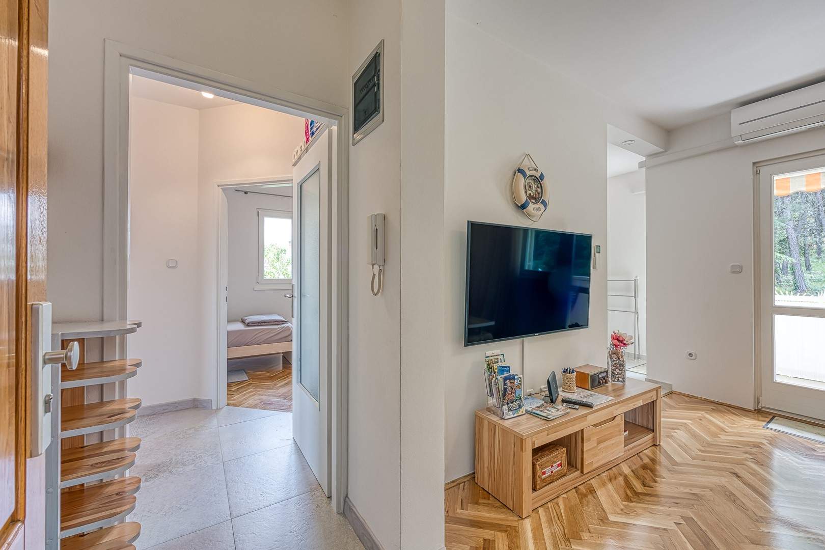 Enterijer apartmana očarava svojom toplinom i udobnošću. Namještaj je odabran s pažnjom kako bi gostima pružio osjećaj doma i udobnosti. Svijetle boje i pažljivo odabrani detalji stvaraju atmosferu koja potiče opuštanje i uživanje.