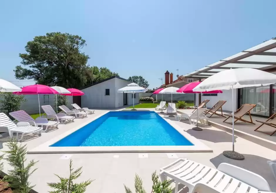 U središtu vrta nalazi se zajednički bazen opremljen ležaljkama, savršen za rashlađivanje u vrućim ljetnim danima ili opuštanje uz dobru knjigu. Bazen je na raspolaganju svim gostima apartmana, tako da u svakom trenutku mogu uživati ??u kupanju i sunčanju.