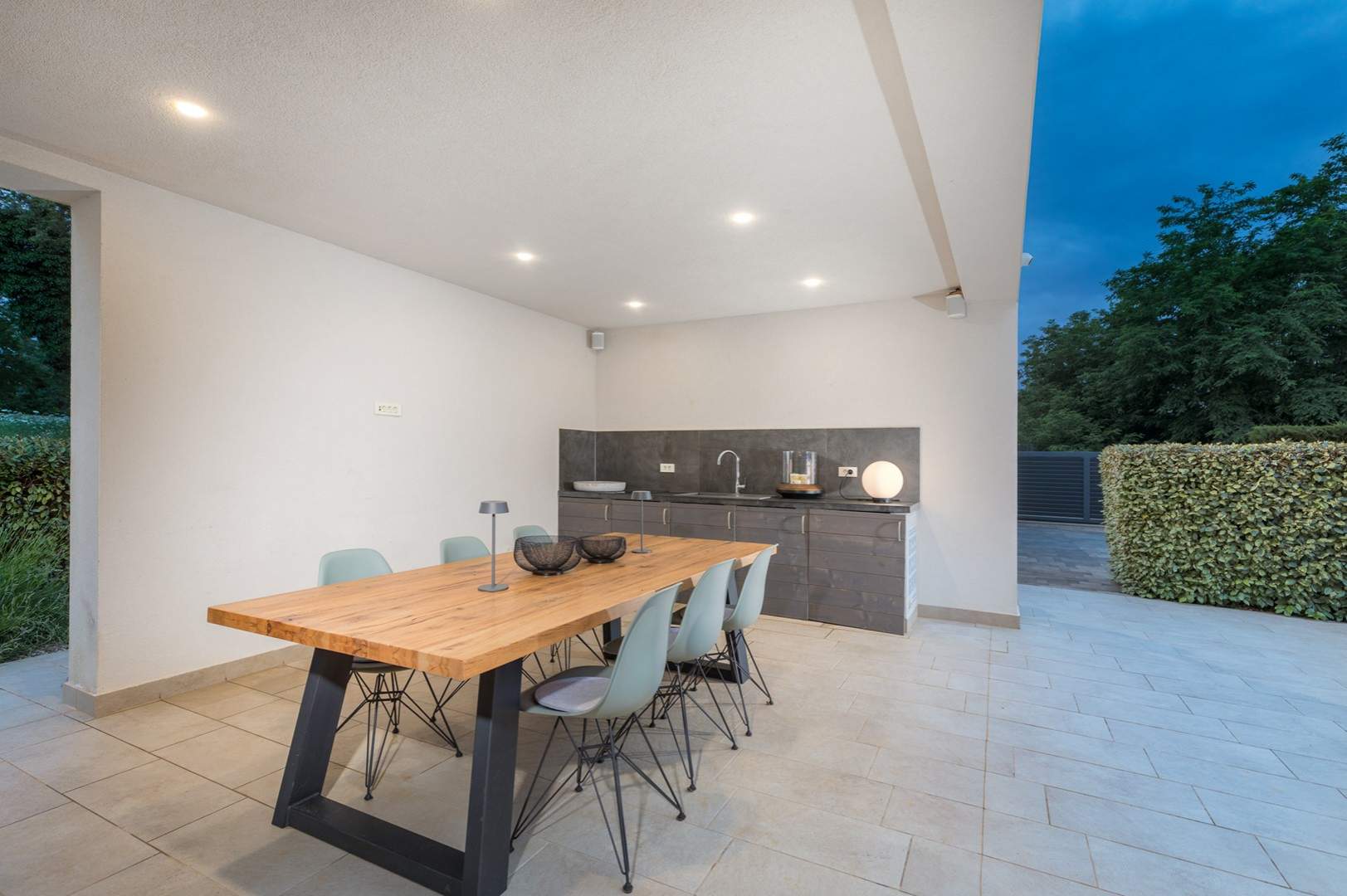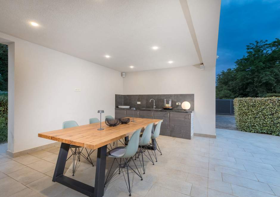 Na prostranom posjedu od 950 m², gostima je na raspolaganju prekrasno uređeni vrt s velikim bazenom, savršenim za osvježenje tijekom sunčanih dana. Natkrivena terasa s vanjskom kuhinjom i roštiljem idealna je za uživanje u jelima na otvorenom.