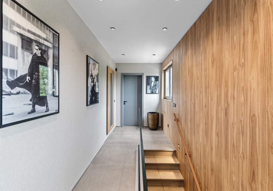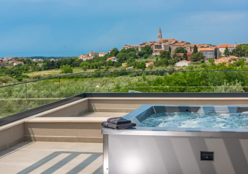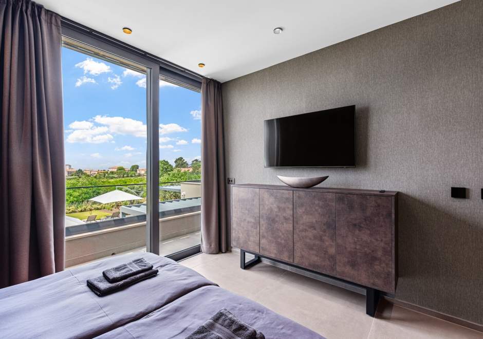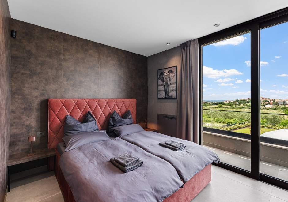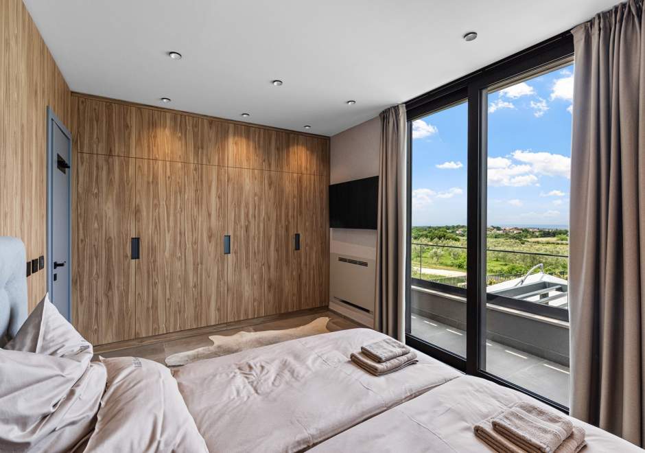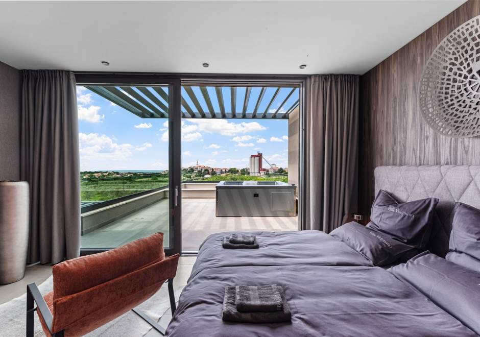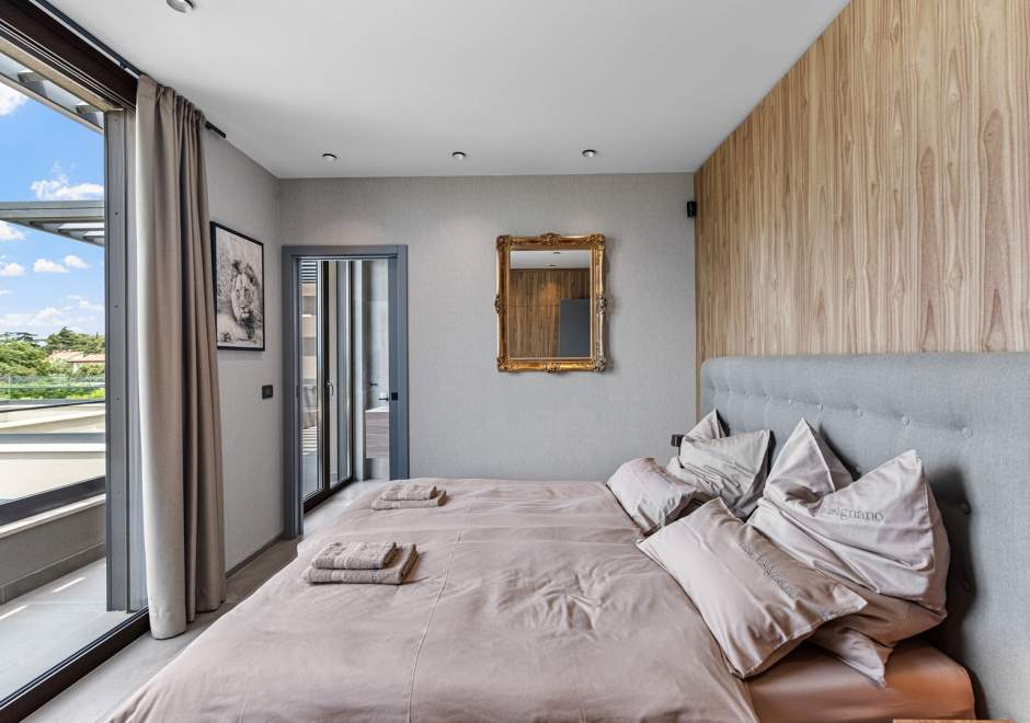 Na katu se nalaze tri elegantno uređene spavaće sobe, svaka s en-suite kupaonicom i izlazom na terasu. Master spavaća soba ističe se prostranom terasom s jacuzzijem i prekrasnim pogledom na more i istarski krajolik.
