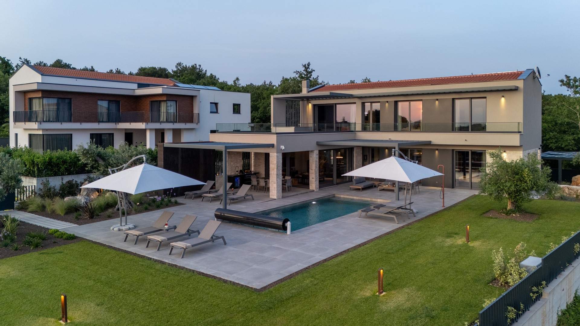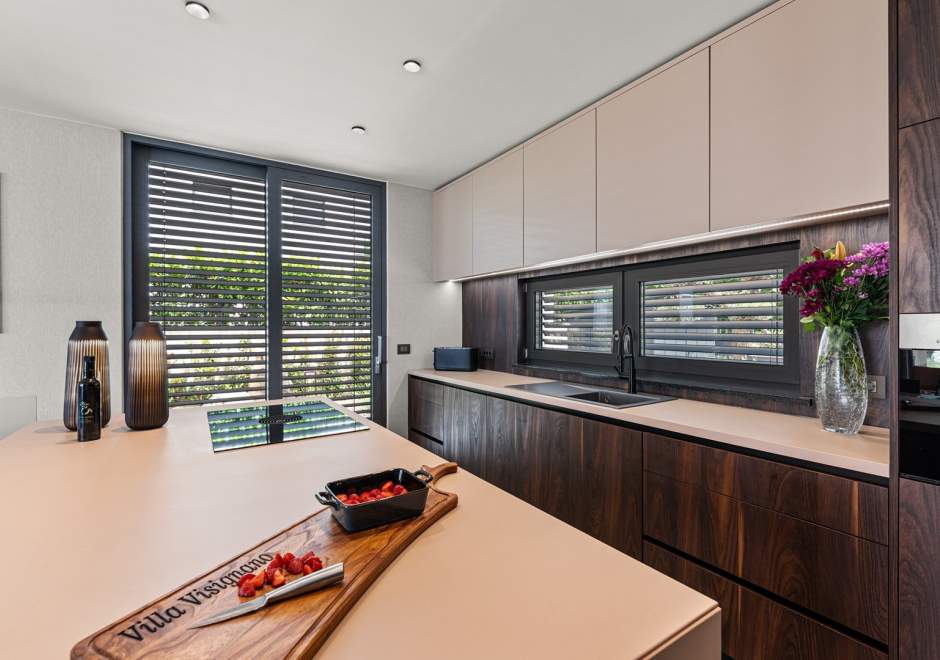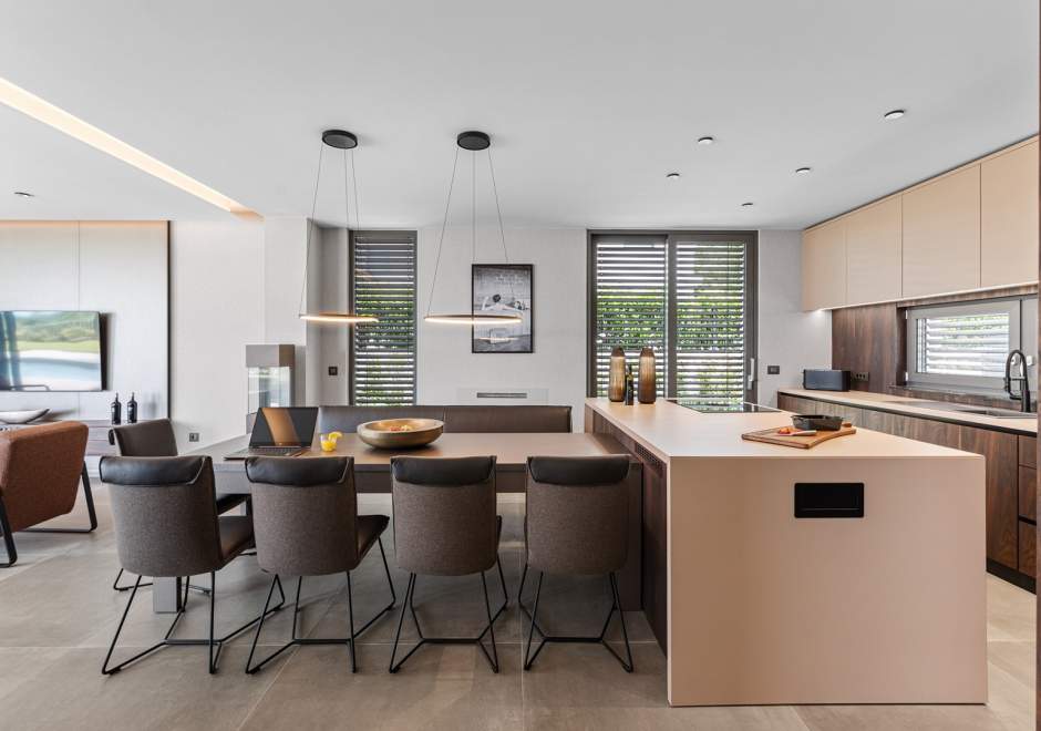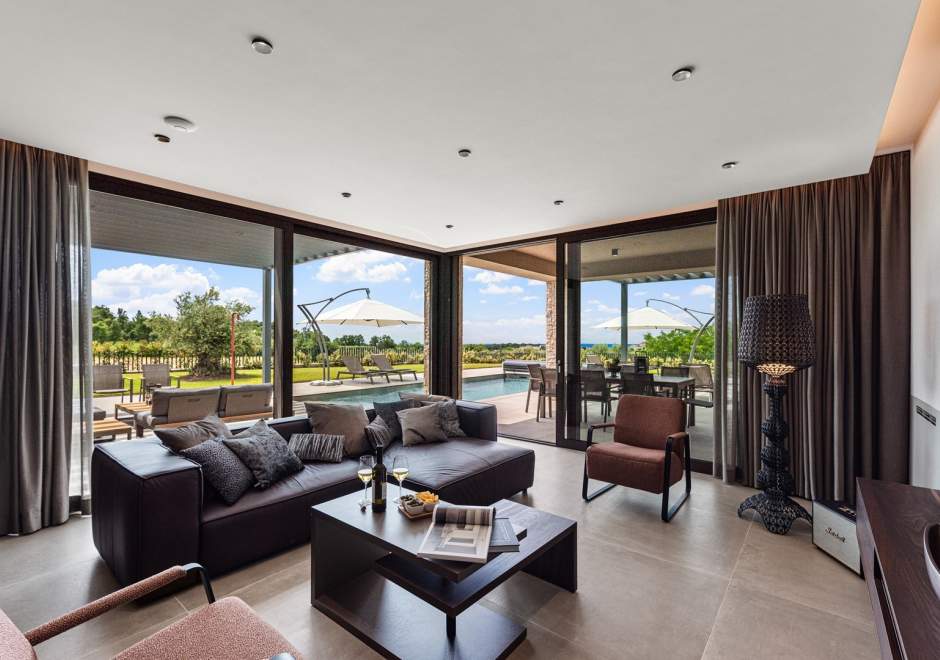 U prizemlju se nalazi elegantan open-space dnevni boravak s kaminom, potpuno opremljena moderna kuhinja i blagovaonica s izlazom na natkrivenu ljetnu kuhinju i prostrano sunčalište uz privatni bazen od 49 m2 s mogućnošću grijanja. U istom dijelu smještena je i sauna te jedna spavaća soba s vlastitom kupaonicom.