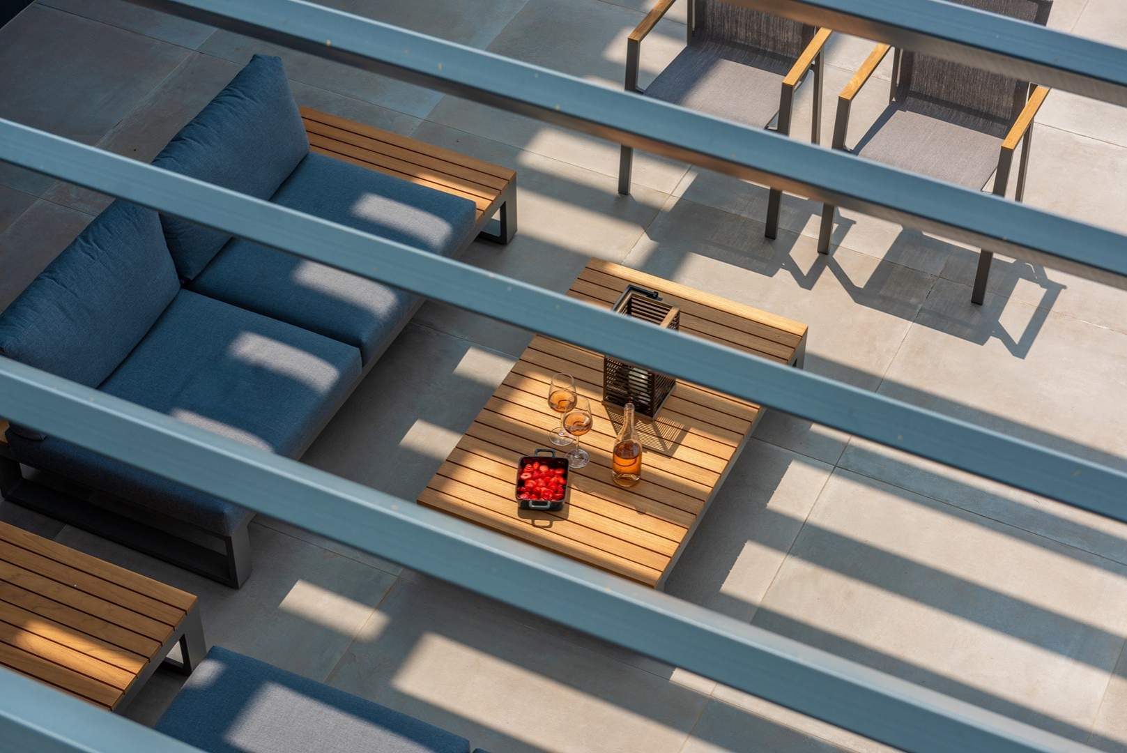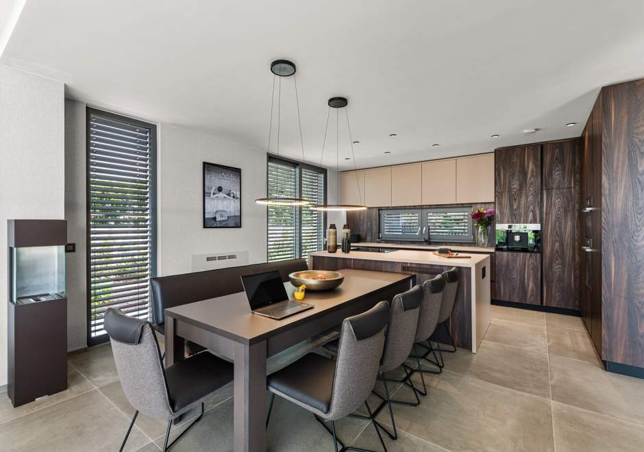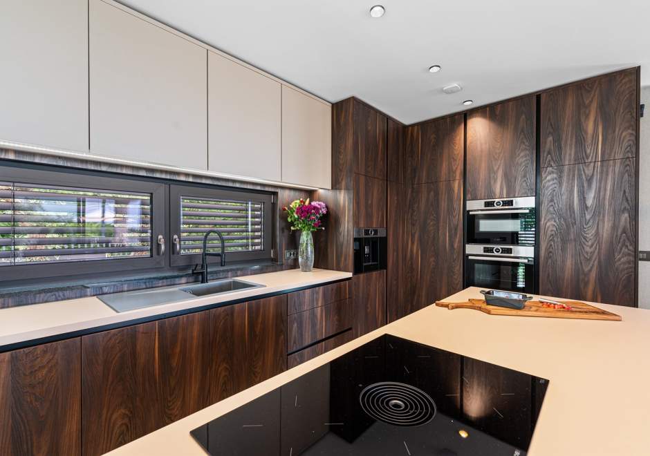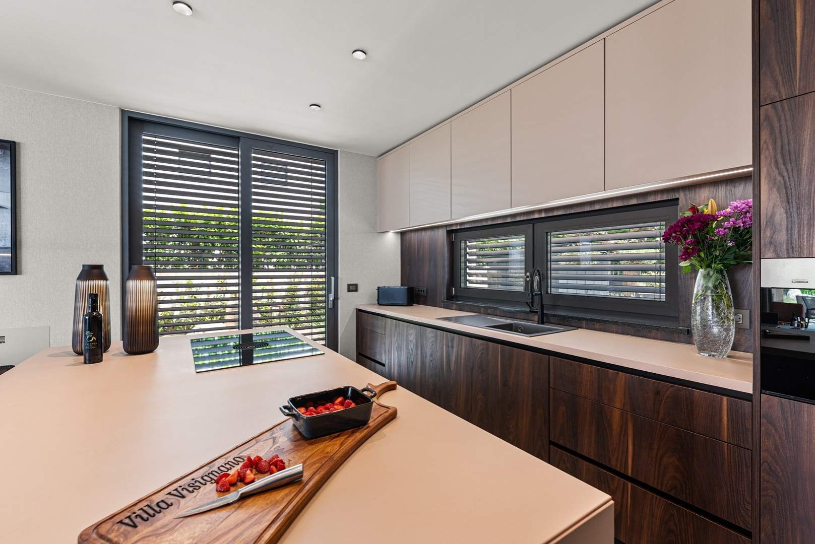 U prizemlju se nalazi elegantan open-space dnevni boravak s kaminom, potpuno opremljena moderna kuhinja i blagovaonica s izlazom na natkrivenu ljetnu kuhinju i prostrano sunčalište uz privatni bazen od 49 m2 s mogućnošću grijanja. U istom dijelu smještena je i sauna te jedna spavaća soba s vlastitom kupaonicom.