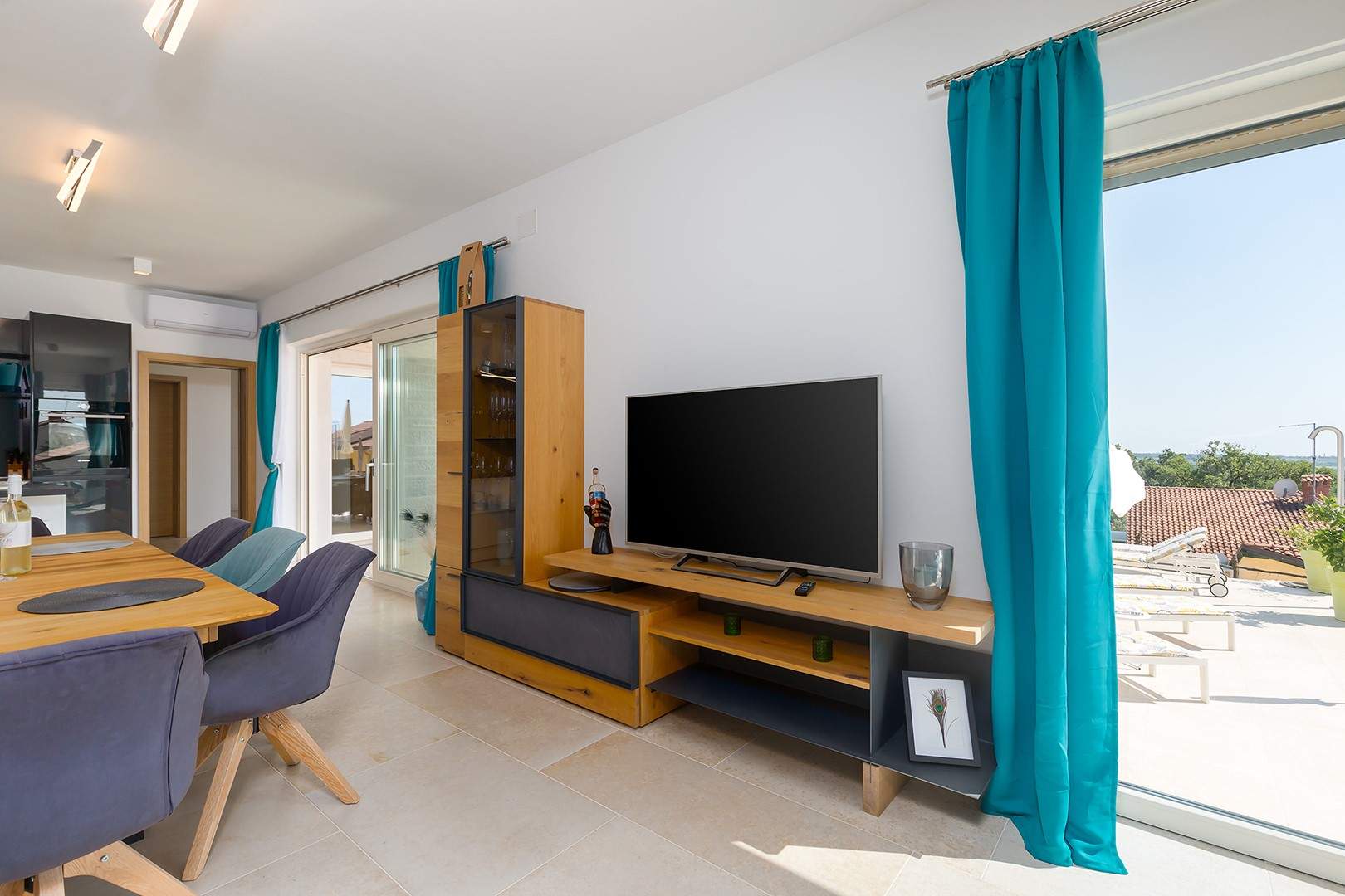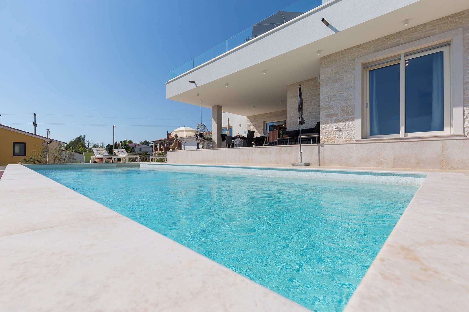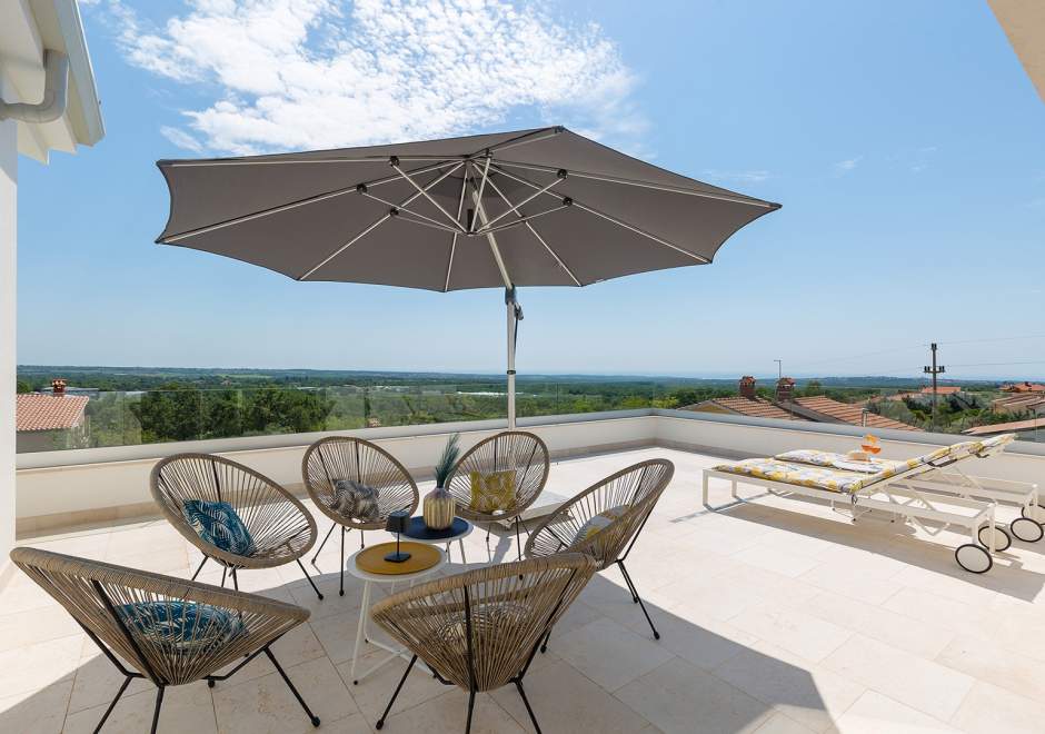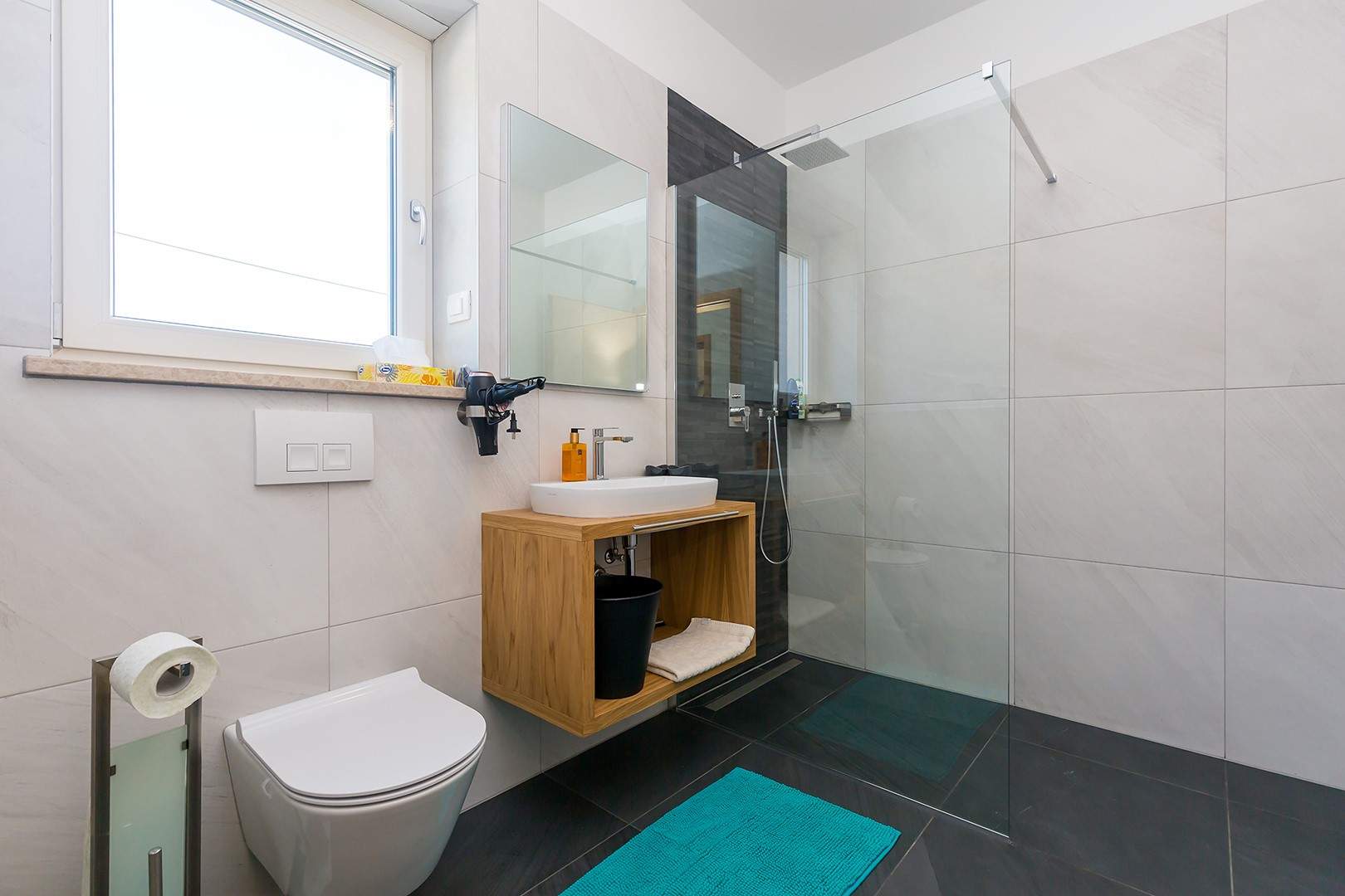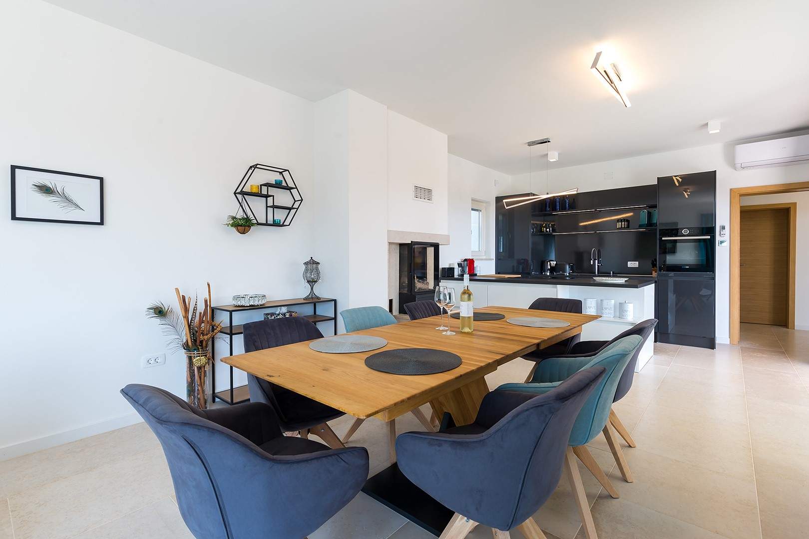 Elegante casa vacanze con piscina privata nel villaggio di Kastelir, vicino a Parenzo, ideale per 8 persone. Dopo una lunga giornata in spiaggia, rinfrescati nella piscina privata di 10 x 4 metri. Diversi ombrelloni offrono una piacevole ombra durante il peggior caldo di mezzogiorno. Se fa troppo caldo, puoi rinfrescarti comodamente nella doccia esterna. Tre gradini conducono alla terrazza, dove le persone si incontrano per un pasto insieme. I maestri della griglia possono preparare piatti sostanziosi sulla griglia mobile. L'interno spazioso della casa offre comfort e intimita su 243 m2 e due livelli abitativi. Il soggiorno e modernamente attrezzato in modo da poter guardare la TV o leggere in un'atmosfera elegante. TV satellitare con canali tedeschi e disponibile. Accanto si trova la zona pranzo, dove 8 ospiti possono riunirsi attorno al tavolo da pranzo. La cucina spaziosa e luminosa offre un piano cottura a gas, un forno elettrico, una lavastoviglie e un forno. Al piano terra si trovano due moderne camere matrimoniali con guardaroba e accesso alla terrazza e un bagno con doccia. Nella parte alta della casa c'e un soggiorno e una cucina, oltre a un secondo terrazzo, anch'esso arredato. Anche in questo caso, gli ombrelloni obbligatori, cosi da poter mangiare all'aperto anche a mezzogiorno. Le due restanti camere da letto sono al primo piano. Ogni camera ha il proprio bagno. La lavatrice resta a tua disposizione. Ogni camera dispone di aria condizionata. Non sono ammesse feste o eventi simili. Gli animali non sono ammessi.