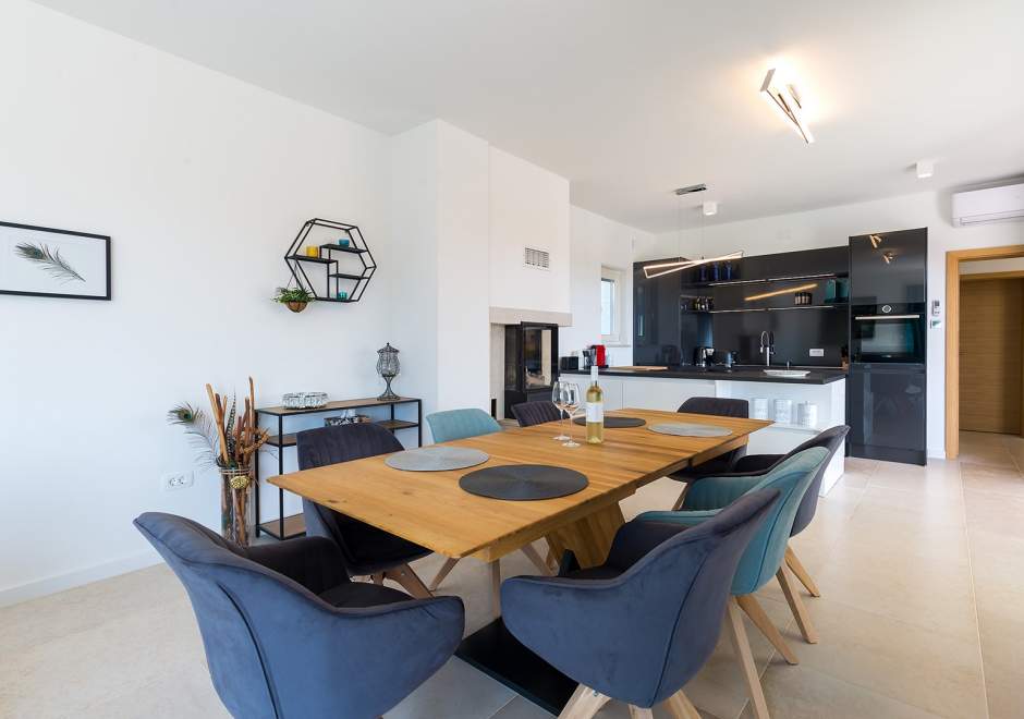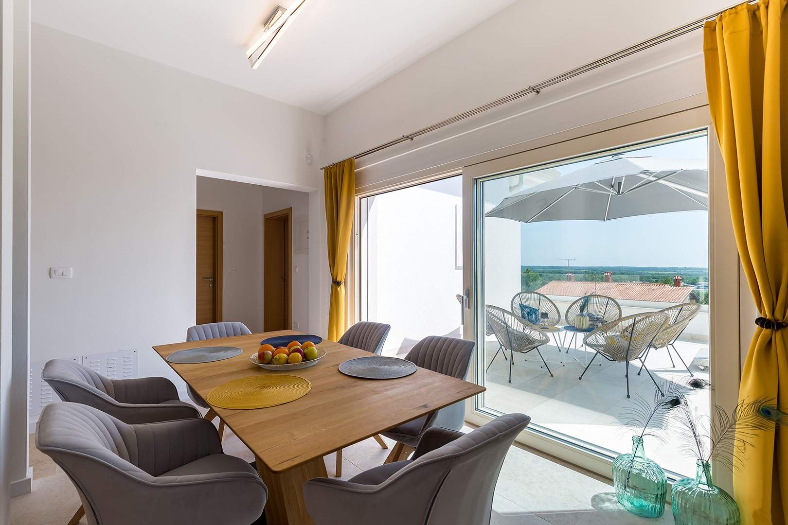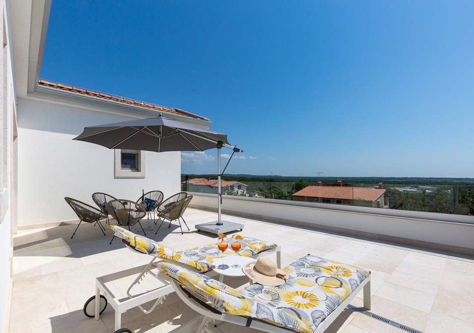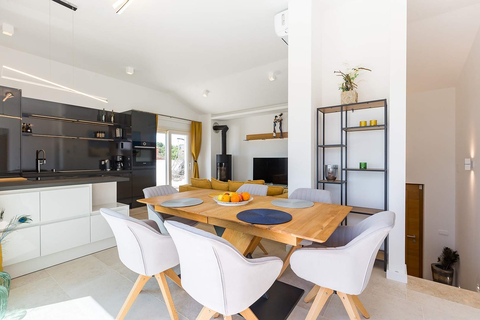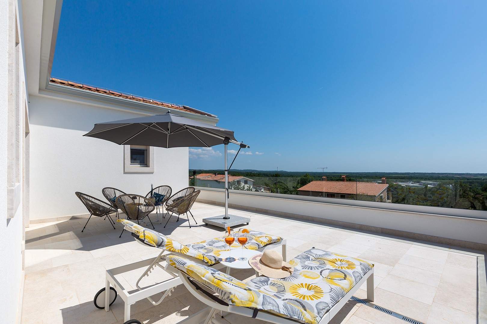 Elegante casa vacanze con piscina privata nel villaggio di Kastelir, vicino a Parenzo, ideale per 8 persone. Dopo una lunga giornata in spiaggia, rinfrescati nella piscina privata di 10 x 4 metri. Diversi ombrelloni offrono una piacevole ombra durante il peggior caldo di mezzogiorno. Se fa troppo caldo, puoi rinfrescarti comodamente nella doccia esterna. Tre gradini conducono alla terrazza, dove le persone si incontrano per un pasto insieme. I maestri della griglia possono preparare piatti sostanziosi sulla griglia mobile. L'interno spazioso della casa offre comfort e intimita su 243 m2 e due livelli abitativi. Il soggiorno e modernamente attrezzato in modo da poter guardare la TV o leggere in un'atmosfera elegante. TV satellitare con canali tedeschi e disponibile. Accanto si trova la zona pranzo, dove 8 ospiti possono riunirsi attorno al tavolo da pranzo. La cucina spaziosa e luminosa offre un piano cottura a gas, un forno elettrico, una lavastoviglie e un forno. Al piano terra si trovano due moderne camere matrimoniali con guardaroba e accesso alla terrazza e un bagno con doccia. Nella parte alta della casa c'e un soggiorno e una cucina, oltre a un secondo terrazzo, anch'esso arredato. Anche in questo caso, gli ombrelloni obbligatori, cosi da poter mangiare all'aperto anche a mezzogiorno. Le due restanti camere da letto sono al primo piano. Ogni camera ha il proprio bagno. La lavatrice resta a tua disposizione. Ogni camera dispone di aria condizionata. Non sono ammesse feste o eventi simili. Gli animali non sono ammessi.