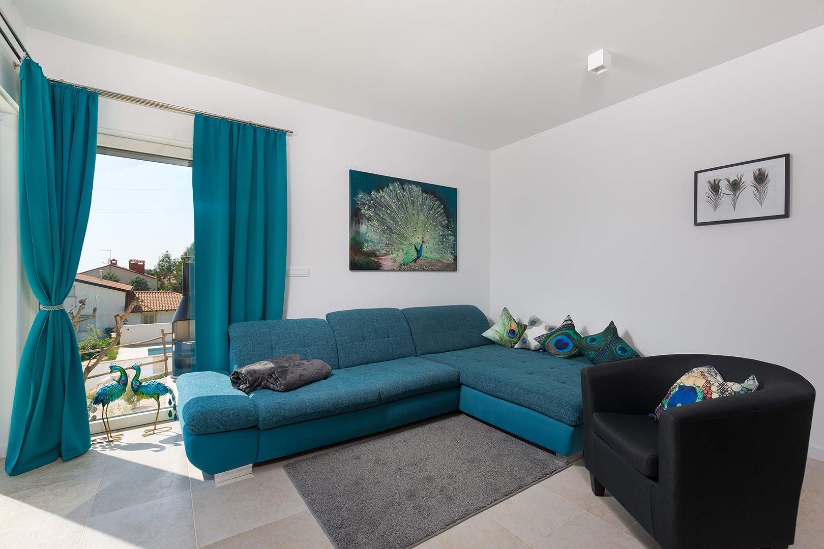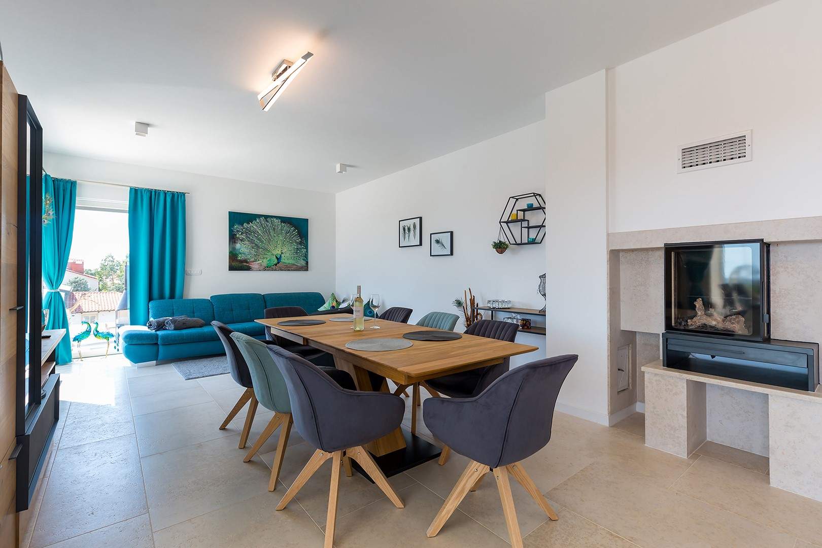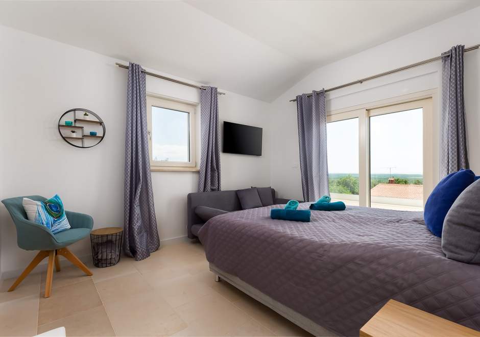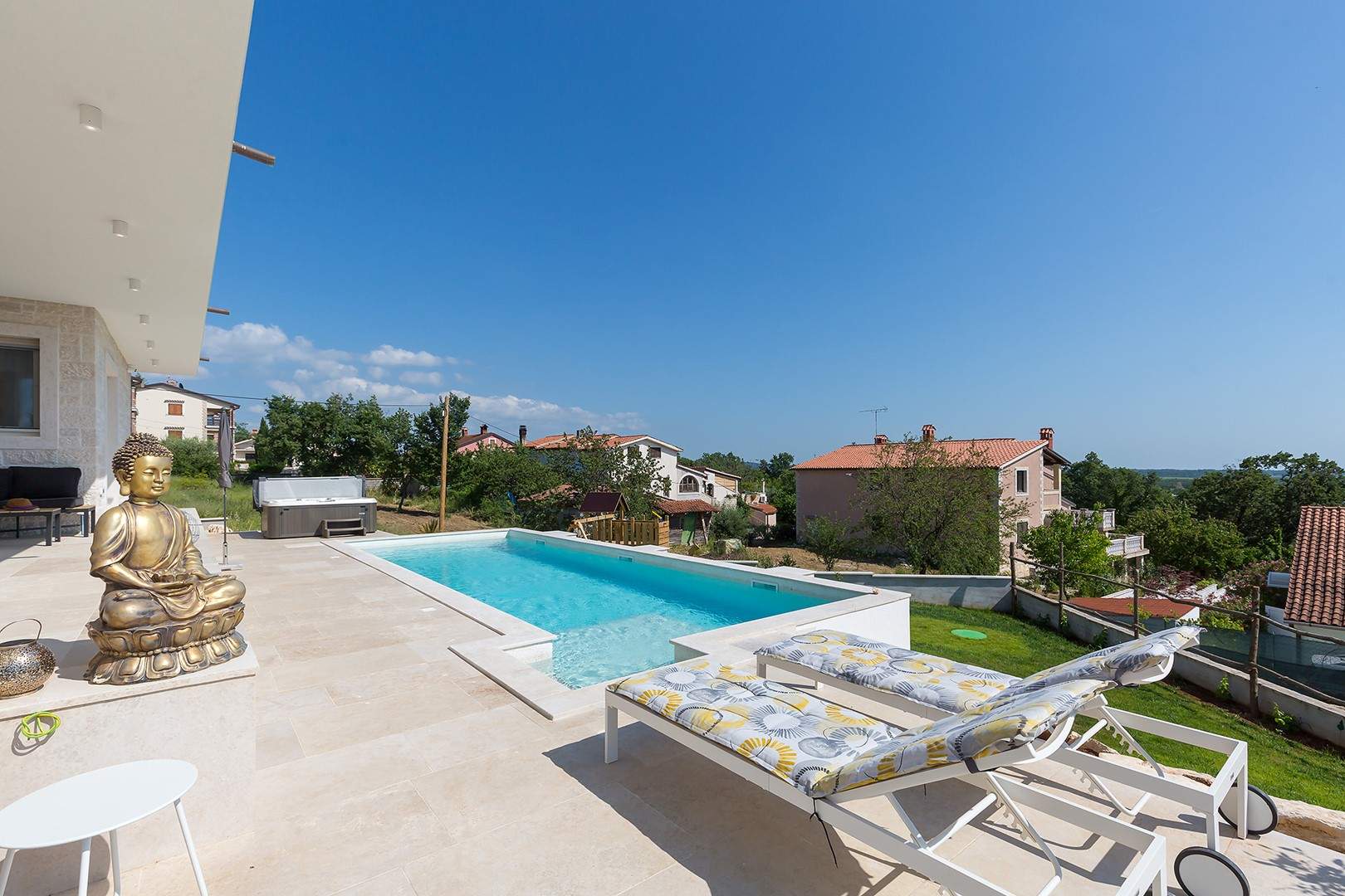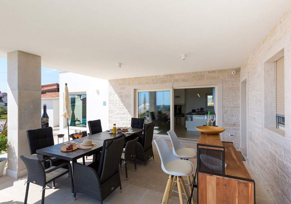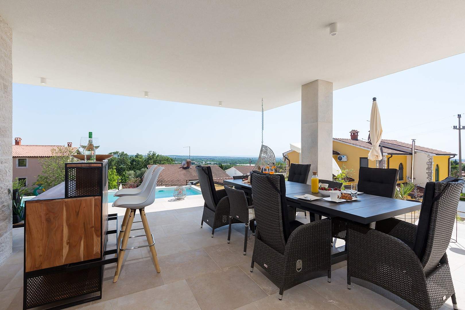Elegante casa vacanze con piscina privata nel villaggio di Kastelir, vicino a Parenzo, ideale per 8 persone. Dopo una lunga giornata in spiaggia, rinfrescati nella piscina privata di 10 x 4 metri. Diversi ombrelloni offrono una piacevole ombra durante il peggior caldo di mezzogiorno. Se fa troppo caldo, puoi rinfrescarti comodamente nella doccia esterna. Tre gradini conducono alla terrazza, dove le persone si incontrano per un pasto insieme. I maestri della griglia possono preparare piatti sostanziosi sulla griglia mobile. L'interno spazioso della casa offre comfort e intimita su 243 m2 e due livelli abitativi. Il soggiorno e modernamente attrezzato in modo da poter guardare la TV o leggere in un'atmosfera elegante. TV satellitare con canali tedeschi e disponibile. Accanto si trova la zona pranzo, dove 8 ospiti possono riunirsi attorno al tavolo da pranzo. La cucina spaziosa e luminosa offre un piano cottura a gas, un forno elettrico, una lavastoviglie e un forno. Al piano terra si trovano due moderne camere matrimoniali con guardaroba e accesso alla terrazza e un bagno con doccia. Nella parte alta della casa c'e un soggiorno e una cucina, oltre a un secondo terrazzo, anch'esso arredato. Anche in questo caso, gli ombrelloni obbligatori, cosi da poter mangiare all'aperto anche a mezzogiorno. Le due restanti camere da letto sono al primo piano. Ogni camera ha il proprio bagno. La lavatrice resta a tua disposizione. Ogni camera dispone di aria condizionata. Non sono ammesse feste o eventi simili. Gli animali non sono ammessi.