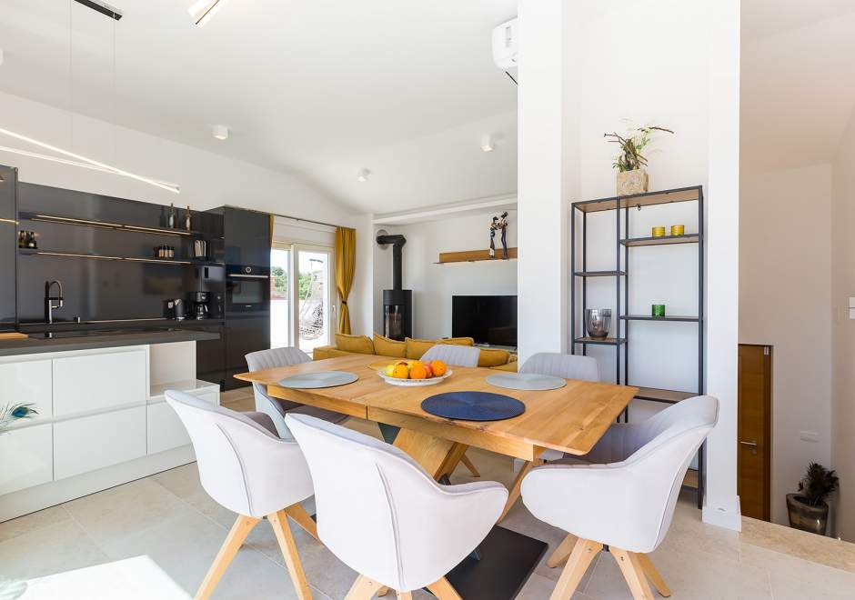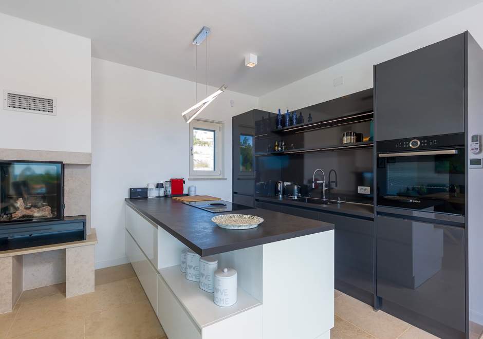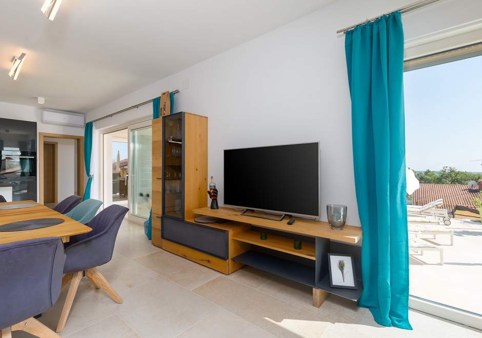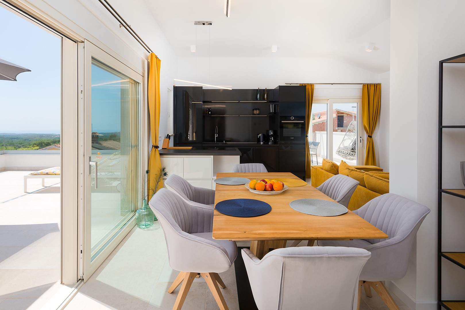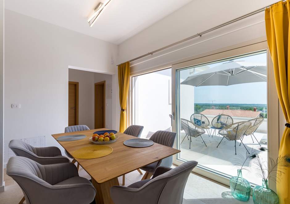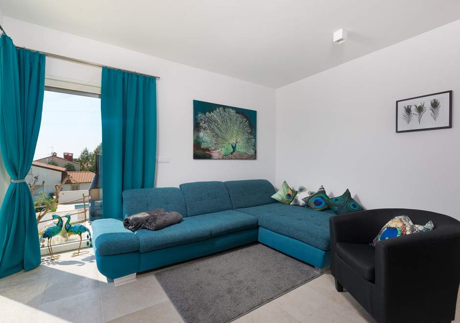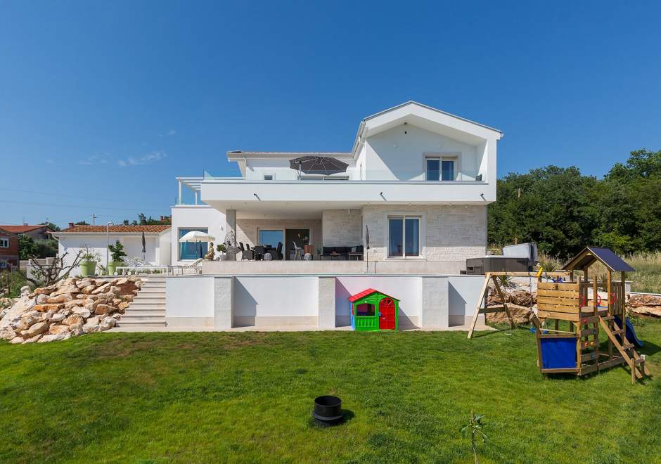 Elegante casa vacanze con piscina privata nel villaggio di Kastelir, vicino a Parenzo, ideale per 8 persone. Dopo una lunga giornata in spiaggia, rinfrescati nella piscina privata di 10 x 4 metri. Diversi ombrelloni offrono una piacevole ombra durante il peggior caldo di mezzogiorno. Se fa troppo caldo, puoi rinfrescarti comodamente nella doccia esterna. Tre gradini conducono alla terrazza, dove le persone si incontrano per un pasto insieme. I maestri della griglia possono preparare piatti sostanziosi sulla griglia mobile. L'interno spazioso della casa offre comfort e intimita su 243 m2 e due livelli abitativi. Il soggiorno e modernamente attrezzato in modo da poter guardare la TV o leggere in un'atmosfera elegante. TV satellitare con canali tedeschi e disponibile. Accanto si trova la zona pranzo, dove 8 ospiti possono riunirsi attorno al tavolo da pranzo. La cucina spaziosa e luminosa offre un piano cottura a gas, un forno elettrico, una lavastoviglie e un forno. Al piano terra si trovano due moderne camere matrimoniali con guardaroba e accesso alla terrazza e un bagno con doccia. Nella parte alta della casa c'e un soggiorno e una cucina, oltre a un secondo terrazzo, anch'esso arredato. Anche in questo caso, gli ombrelloni obbligatori, cosi da poter mangiare all'aperto anche a mezzogiorno. Le due restanti camere da letto sono al primo piano. Ogni camera ha il proprio bagno. La lavatrice resta a tua disposizione. Ogni camera dispone di aria condizionata. Non sono ammesse feste o eventi simili. Gli animali non sono ammessi.