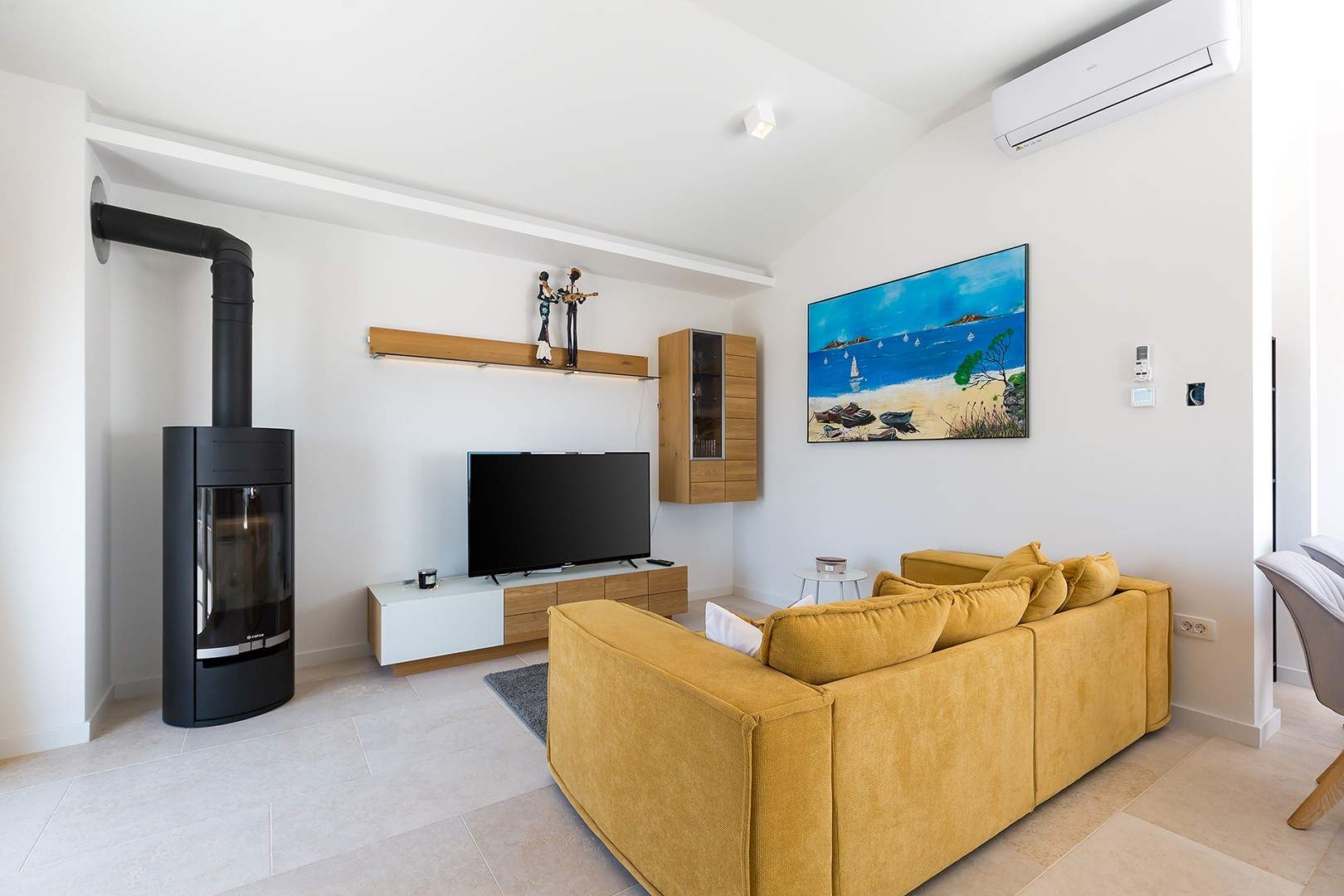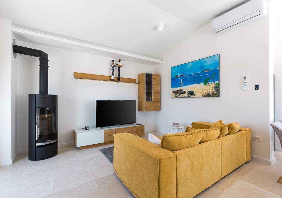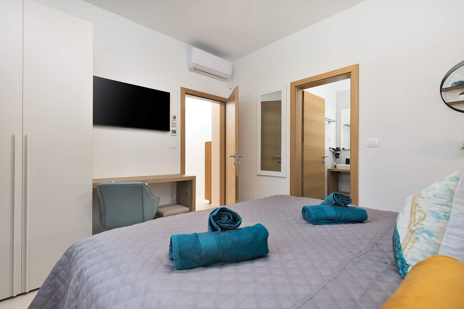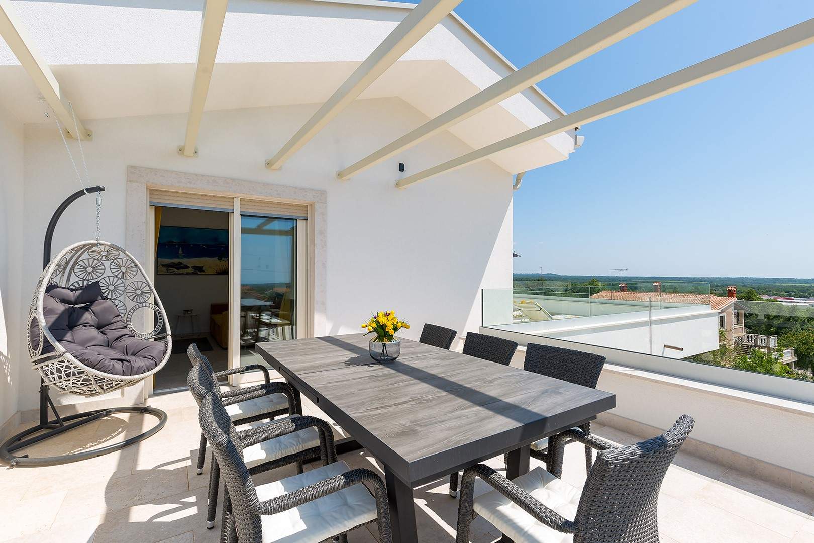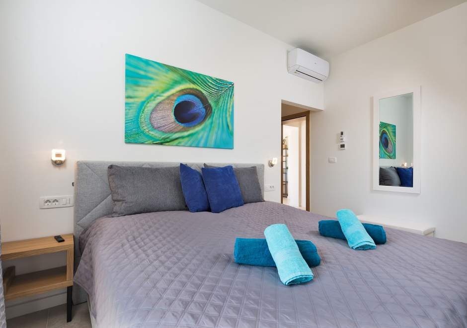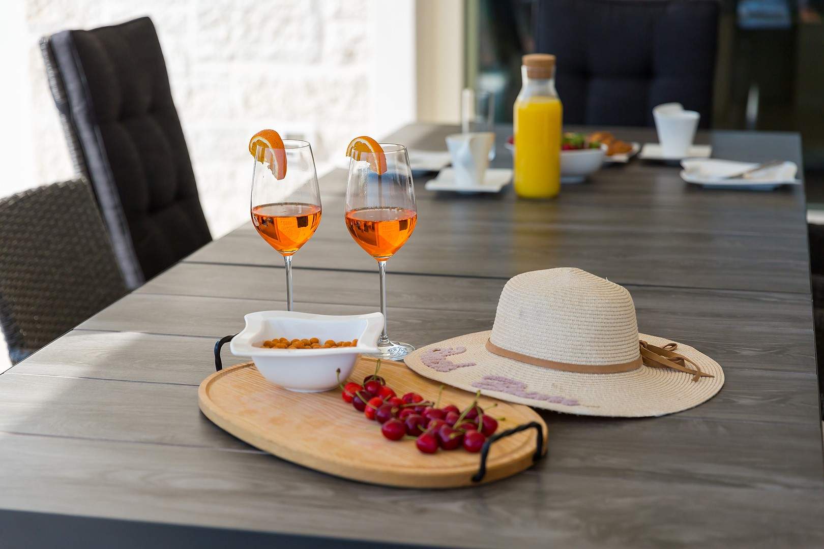 Elegante casa vacanze con piscina privata nel villaggio di Kastelir, vicino a Parenzo, ideale per 8 persone. Dopo una lunga giornata in spiaggia, rinfrescati nella piscina privata di 10 x 4 metri. Diversi ombrelloni offrono una piacevole ombra durante il peggior caldo di mezzogiorno. Se fa troppo caldo, puoi rinfrescarti comodamente nella doccia esterna. Tre gradini conducono alla terrazza, dove le persone si incontrano per un pasto insieme. I maestri della griglia possono preparare piatti sostanziosi sulla griglia mobile. L'interno spazioso della casa offre comfort e intimita su 243 m2 e due livelli abitativi. Il soggiorno e modernamente attrezzato in modo da poter guardare la TV o leggere in un'atmosfera elegante. TV satellitare con canali tedeschi e disponibile. Accanto si trova la zona pranzo, dove 8 ospiti possono riunirsi attorno al tavolo da pranzo. La cucina spaziosa e luminosa offre un piano cottura a gas, un forno elettrico, una lavastoviglie e un forno. Al piano terra si trovano due moderne camere matrimoniali con guardaroba e accesso alla terrazza e un bagno con doccia. Nella parte alta della casa c'e un soggiorno e una cucina, oltre a un secondo terrazzo, anch'esso arredato. Anche in questo caso, gli ombrelloni obbligatori, cosi da poter mangiare all'aperto anche a mezzogiorno. Le due restanti camere da letto sono al primo piano. Ogni camera ha il proprio bagno. La lavatrice resta a tua disposizione. Ogni camera dispone di aria condizionata. Non sono ammesse feste o eventi simili. Gli animali non sono ammessi.