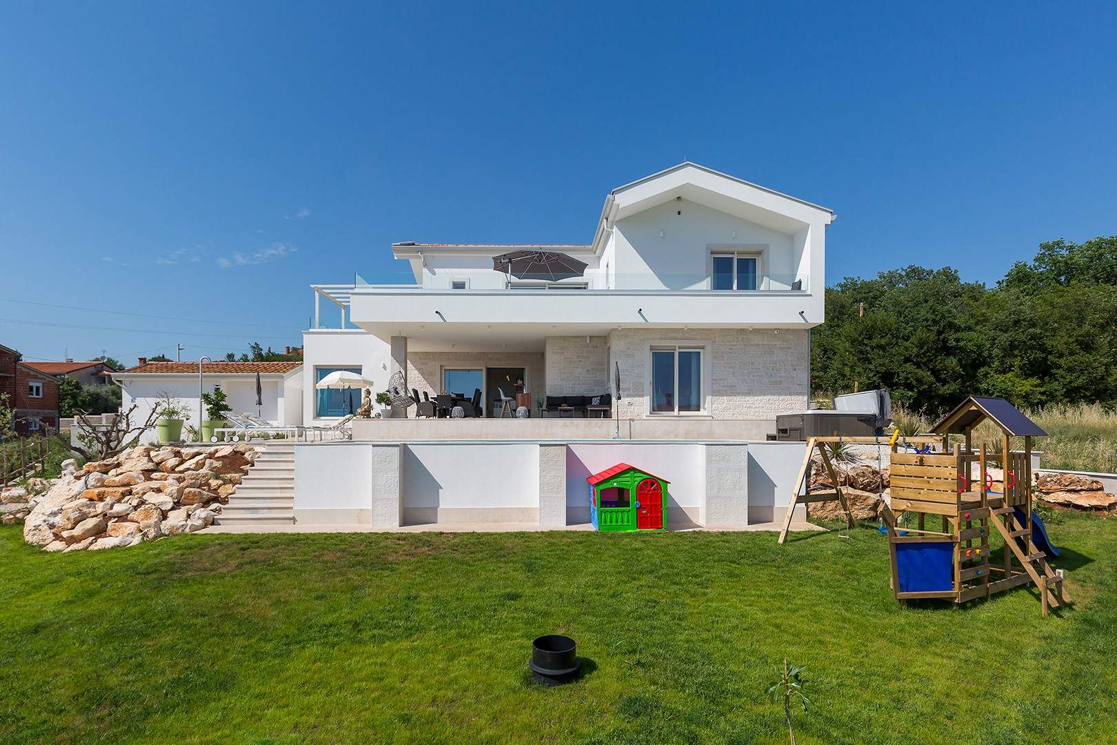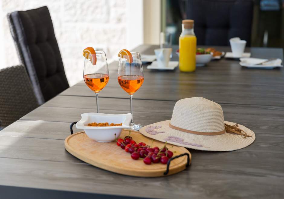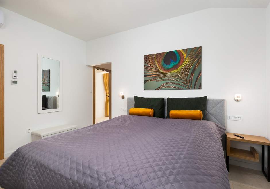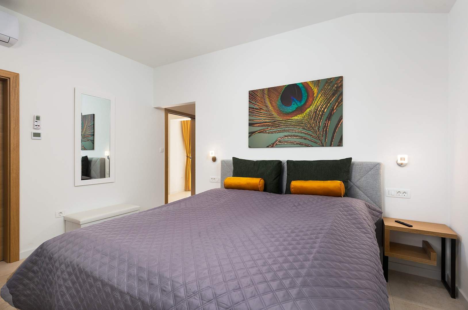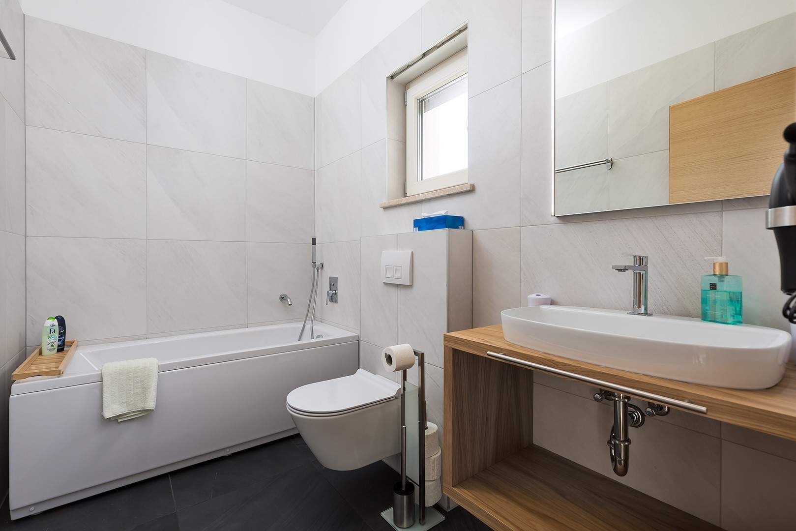 Elegante casa vacanze con piscina privata nel villaggio di Kastelir, vicino a Parenzo, ideale per 8 persone. Dopo una lunga giornata in spiaggia, rinfrescati nella piscina privata di 10 x 4 metri. Diversi ombrelloni offrono una piacevole ombra durante il peggior caldo di mezzogiorno. Se fa troppo caldo, puoi rinfrescarti comodamente nella doccia esterna. Tre gradini conducono alla terrazza, dove le persone si incontrano per un pasto insieme. I maestri della griglia possono preparare piatti sostanziosi sulla griglia mobile. L'interno spazioso della casa offre comfort e intimita su 243 m2 e due livelli abitativi. Il soggiorno e modernamente attrezzato in modo da poter guardare la TV o leggere in un'atmosfera elegante. TV satellitare con canali tedeschi e disponibile. Accanto si trova la zona pranzo, dove 8 ospiti possono riunirsi attorno al tavolo da pranzo. La cucina spaziosa e luminosa offre un piano cottura a gas, un forno elettrico, una lavastoviglie e un forno. Al piano terra si trovano due moderne camere matrimoniali con guardaroba e accesso alla terrazza e un bagno con doccia. Nella parte alta della casa c'e un soggiorno e una cucina, oltre a un secondo terrazzo, anch'esso arredato. Anche in questo caso, gli ombrelloni obbligatori, cosi da poter mangiare all'aperto anche a mezzogiorno. Le due restanti camere da letto sono al primo piano. Ogni camera ha il proprio bagno. La lavatrice resta a tua disposizione. Ogni camera dispone di aria condizionata. Non sono ammesse feste o eventi simili. Gli animali non sono ammessi.
