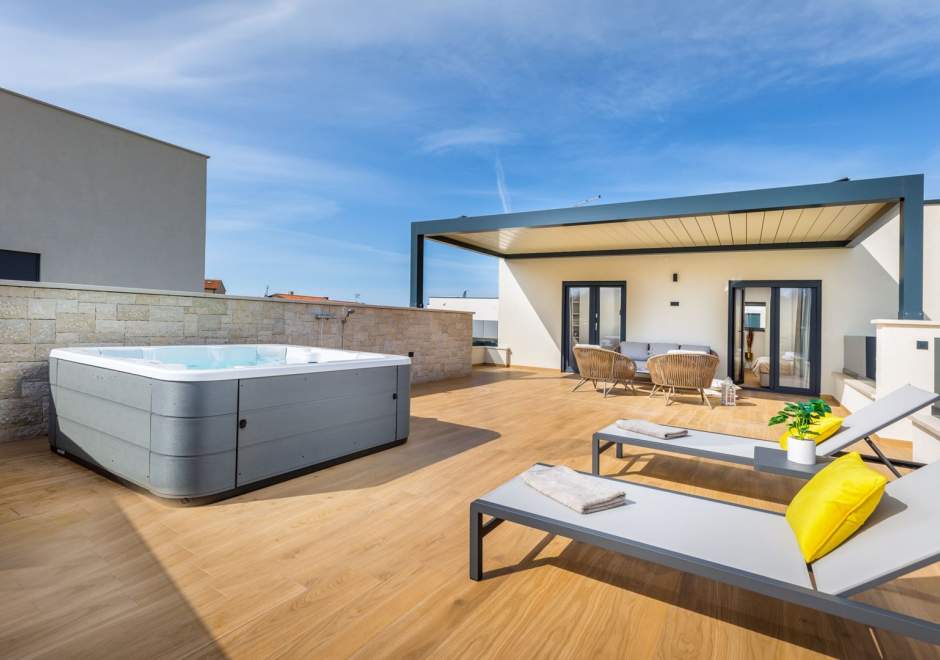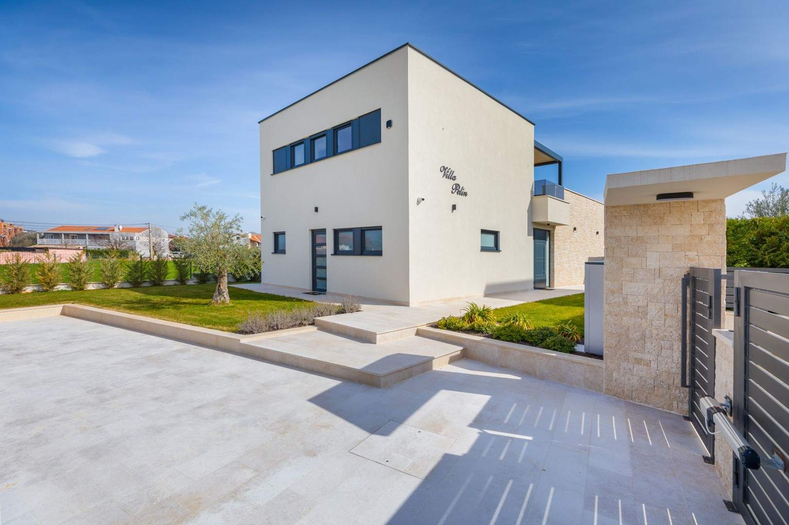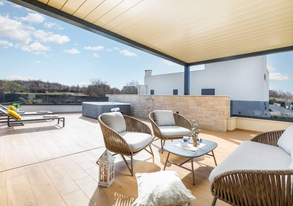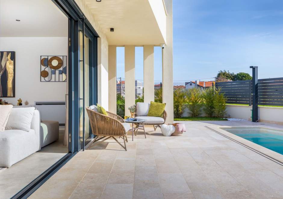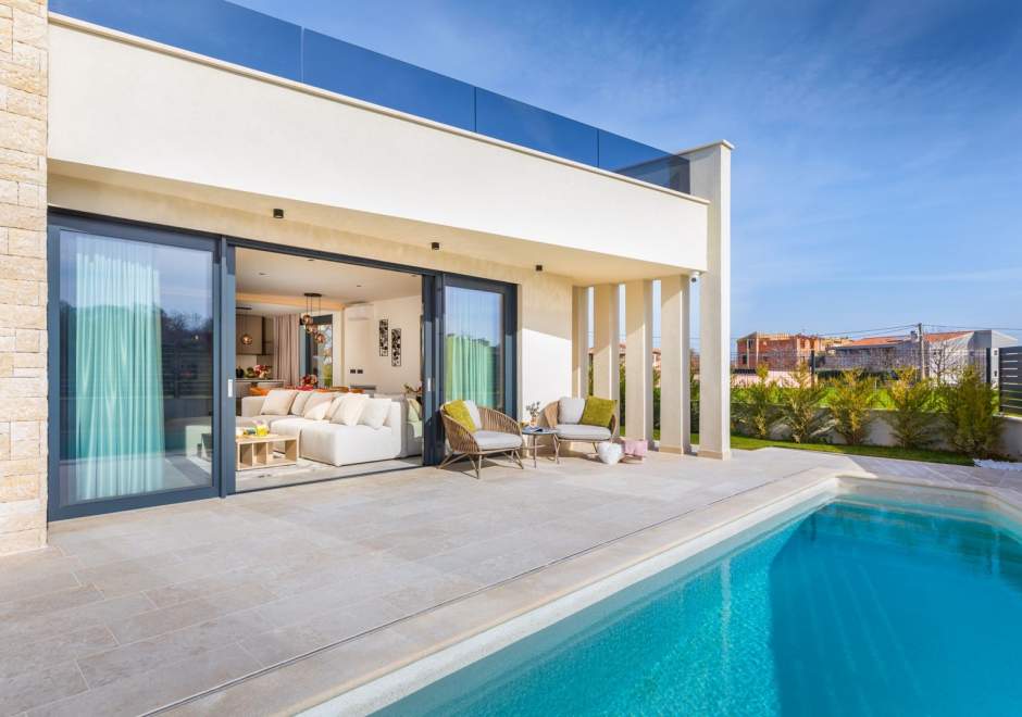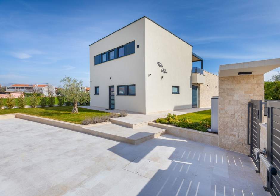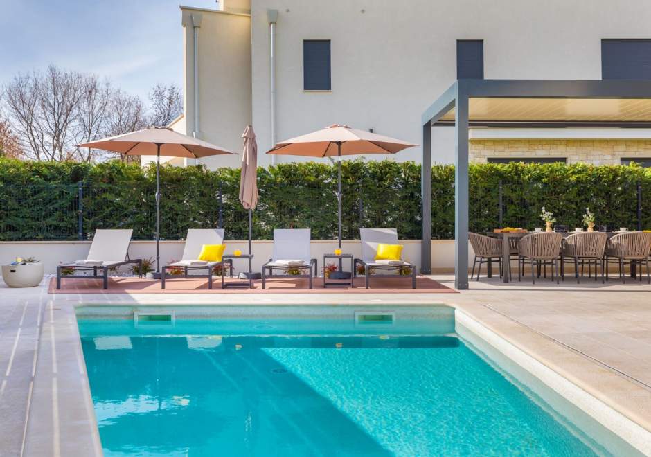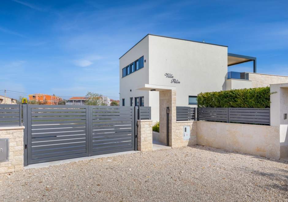 Situata alla periferia di Parenzo, Villa Pelin offre un soggiorno tranquillo e lussuoso vicino a spiagge e attrazioni. Sorge su un terreno di 600 m² con vista sul verde ed è arredata con mobili di alta qualità ed elegante design. Al piano terra si trovano soggiorno open space con TV, cucina completamente attrezzata, zona pranzo con accesso al giardino e alla piscina, una camera matrimoniale con bagno privato e TV, WC separato e lavanderia. Al piano superiore due camere matrimoniali, ciascuna con bagno privato e TV, con accesso a un ampio balcone con pergola e jacuzzi. All’esterno piscina privata, giardino, cucina esterna, zona pranzo, barbecue elettrico e parcheggio per due auto.