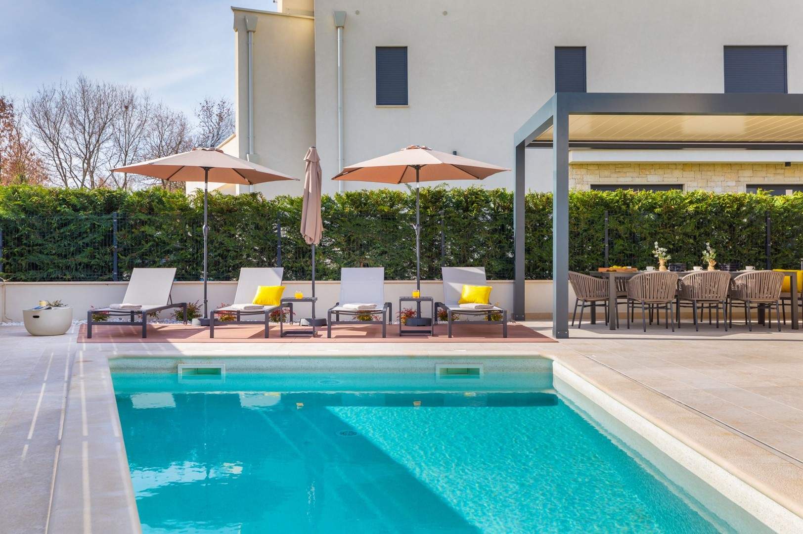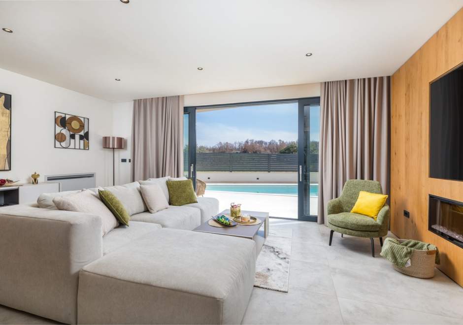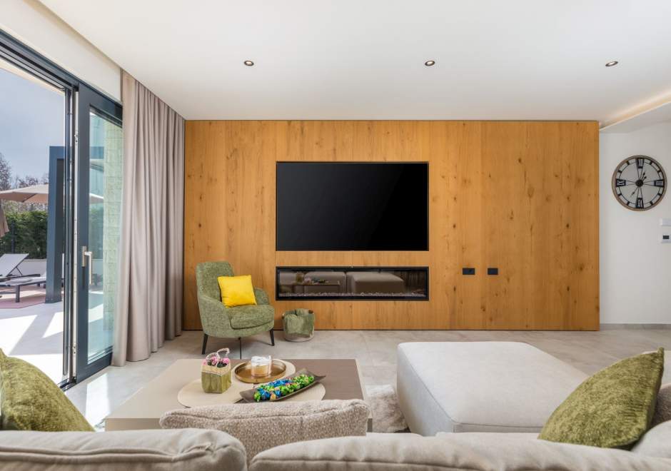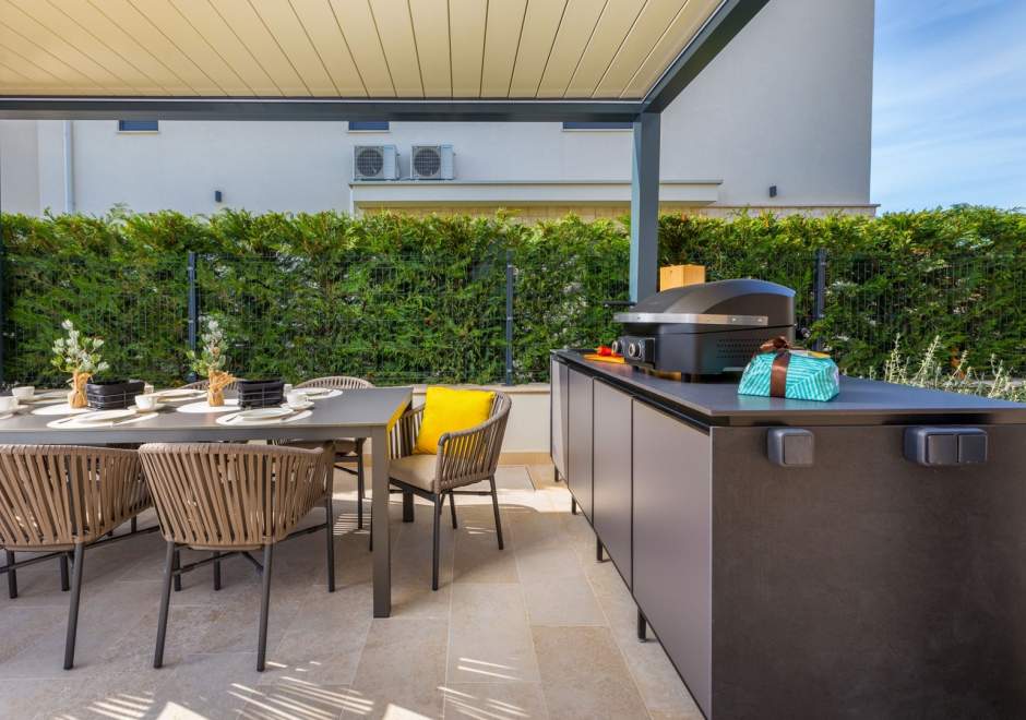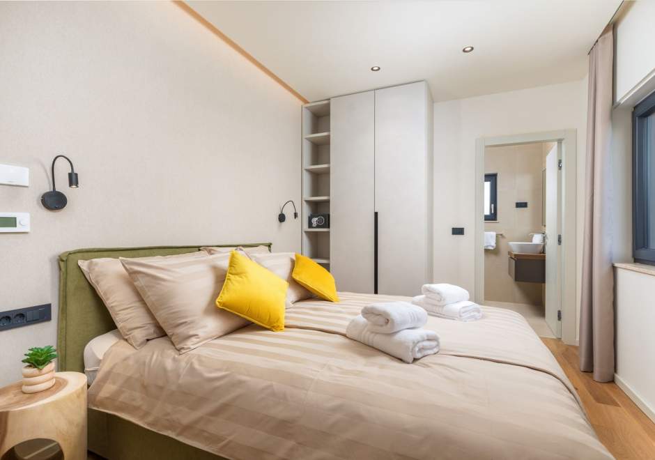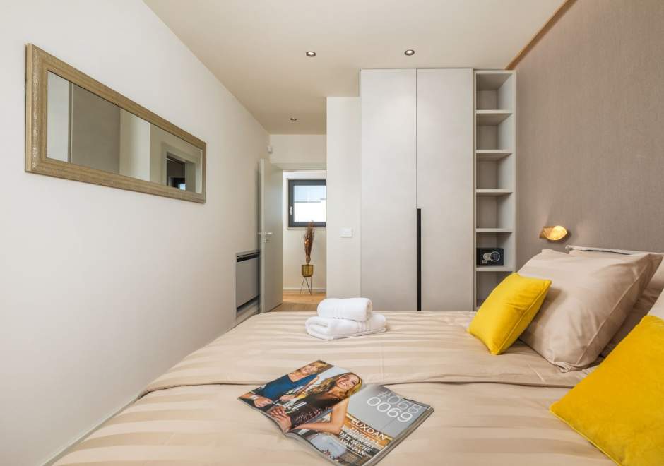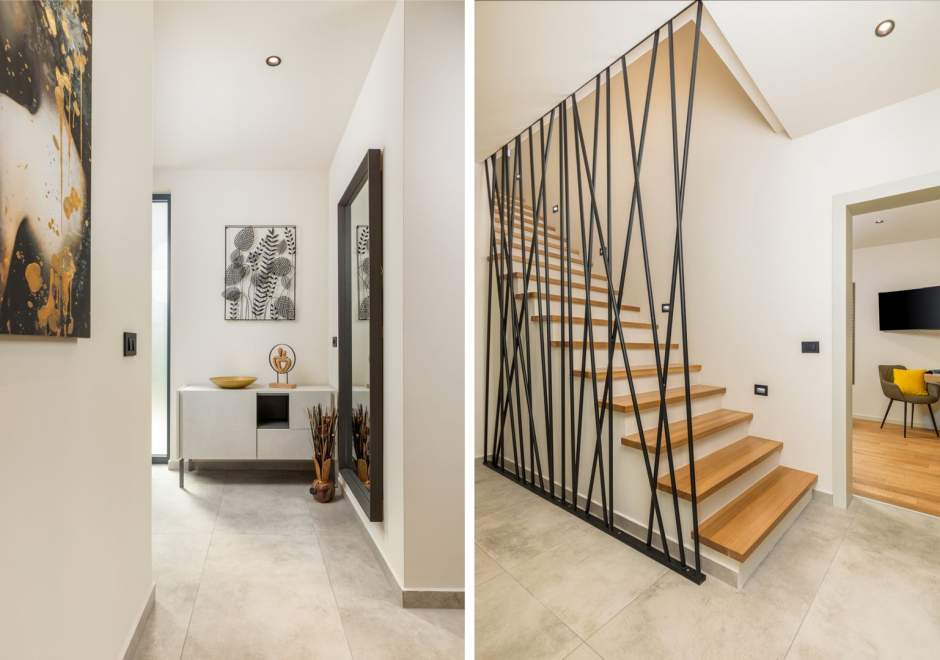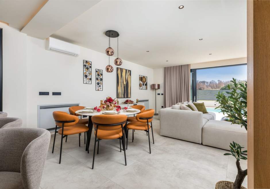 Situata alla periferia di Parenzo, Villa Pelin offre un soggiorno tranquillo e lussuoso vicino a spiagge e attrazioni. Sorge su un terreno di 600 m² con vista sul verde ed è arredata con mobili di alta qualità ed elegante design. Al piano terra si trovano soggiorno open space con TV, cucina completamente attrezzata, zona pranzo con accesso al giardino e alla piscina, una camera matrimoniale con bagno privato e TV, WC separato e lavanderia. Al piano superiore due camere matrimoniali, ciascuna con bagno privato e TV, con accesso a un ampio balcone con pergola e jacuzzi. All’esterno piscina privata, giardino, cucina esterna, zona pranzo, barbecue elettrico e parcheggio per due auto.
