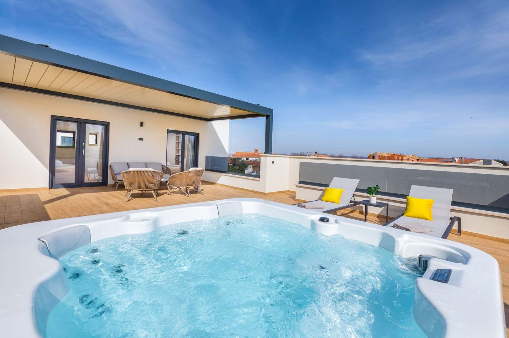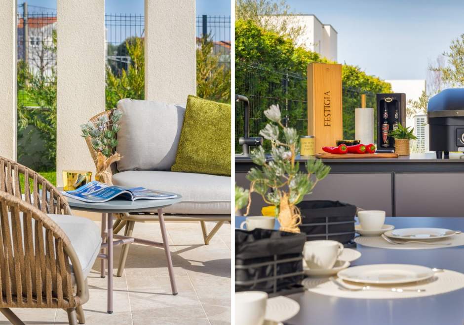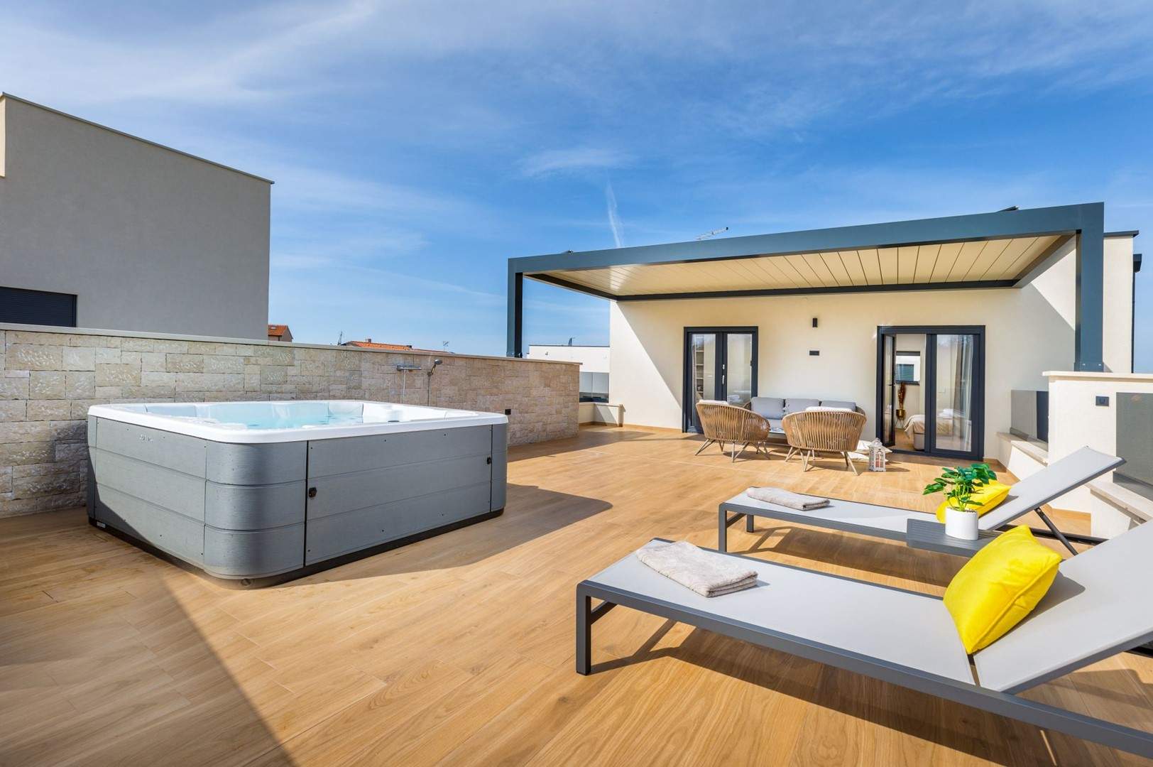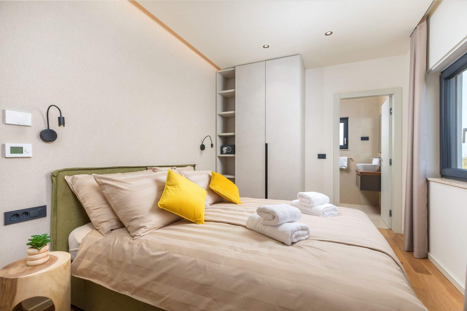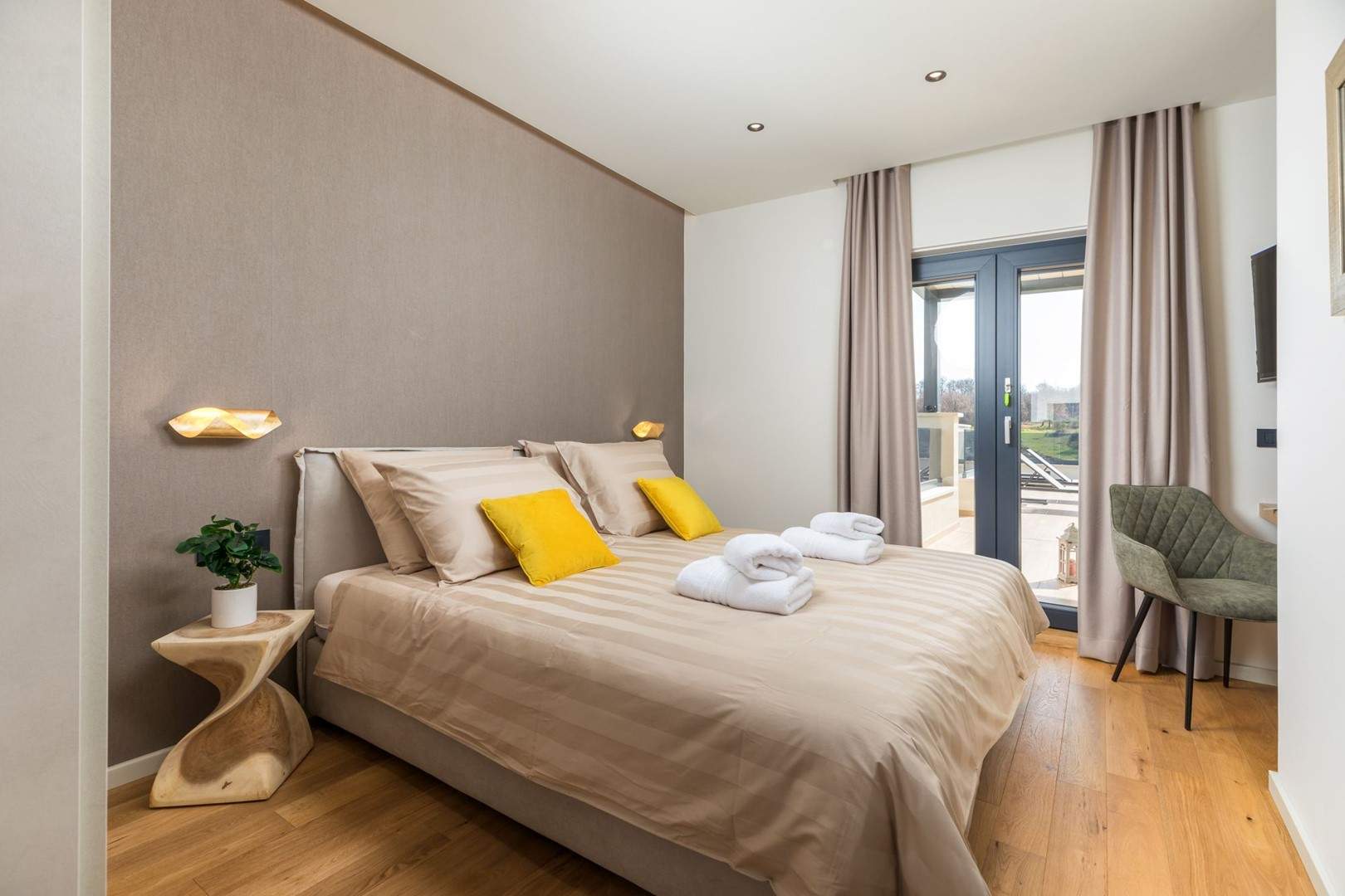 Situata alla periferia di Parenzo, Villa Pelin offre un soggiorno tranquillo e lussuoso vicino a spiagge e attrazioni. Sorge su un terreno di 600 m² con vista sul verde ed è arredata con mobili di alta qualità ed elegante design. Al piano terra si trovano soggiorno open space con TV, cucina completamente attrezzata, zona pranzo con accesso al giardino e alla piscina, una camera matrimoniale con bagno privato e TV, WC separato e lavanderia. Al piano superiore due camere matrimoniali, ciascuna con bagno privato e TV, con accesso a un ampio balcone con pergola e jacuzzi. All’esterno piscina privata, giardino, cucina esterna, zona pranzo, barbecue elettrico e parcheggio per due auto.