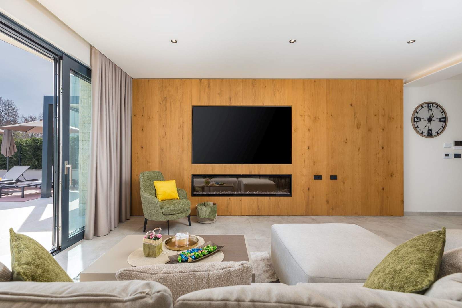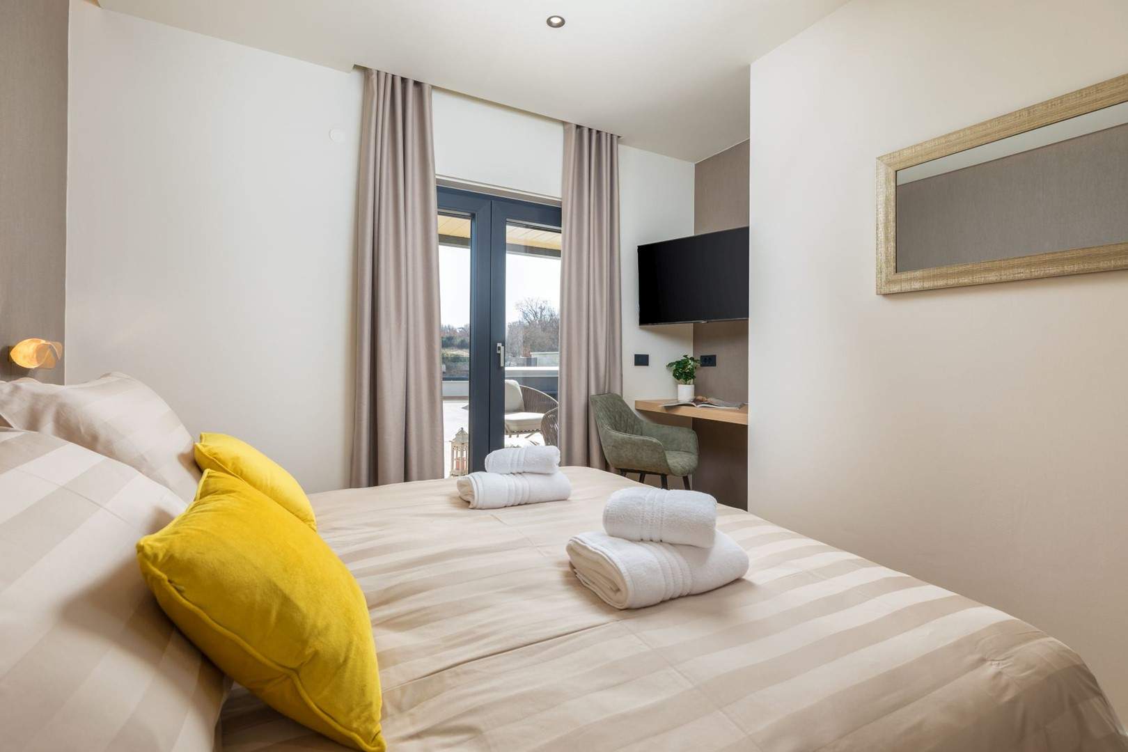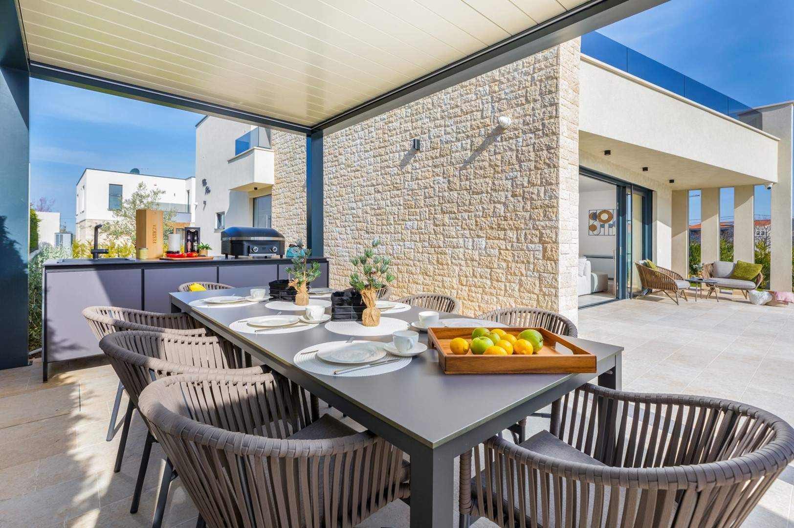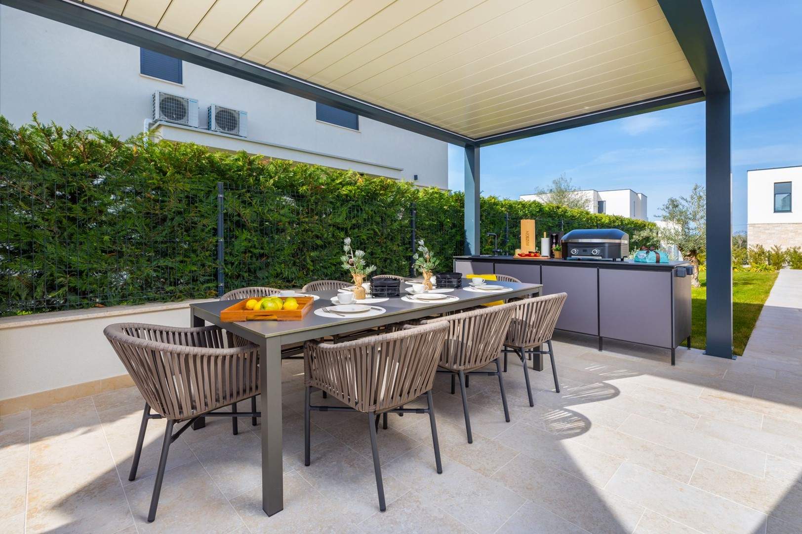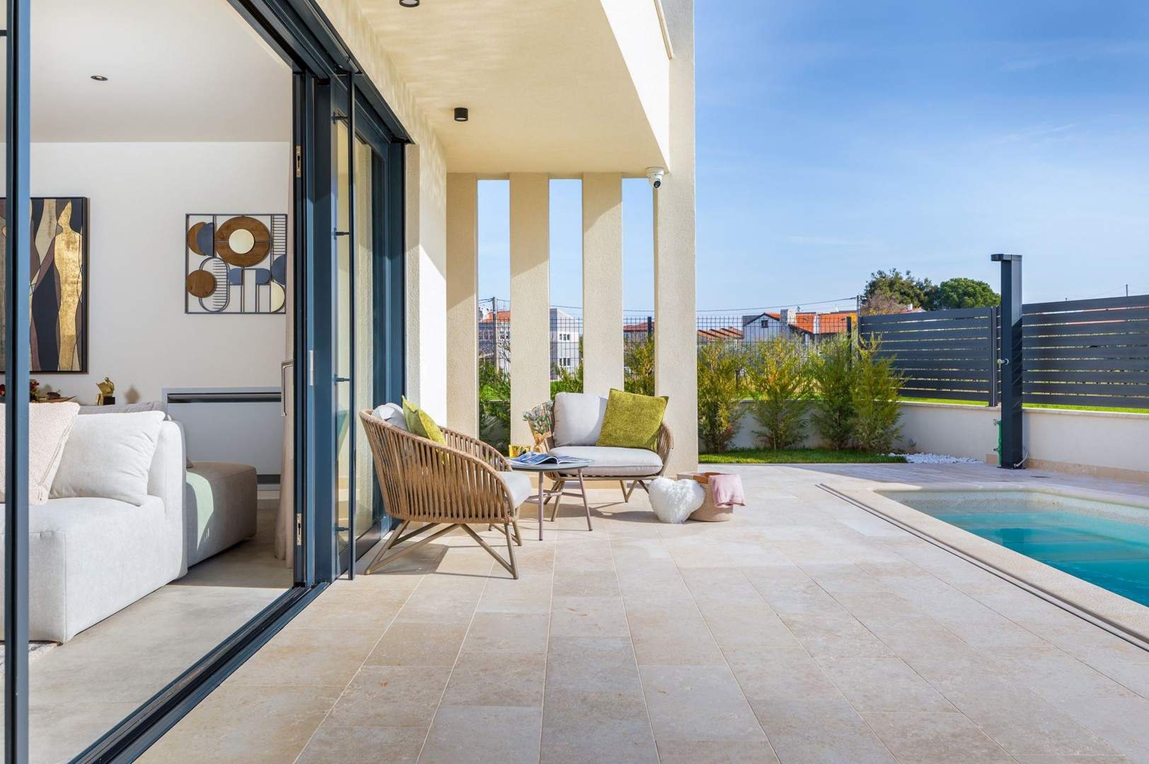 Situata alla periferia di Parenzo, Villa Pelin offre un soggiorno tranquillo e lussuoso vicino a spiagge e attrazioni. Sorge su un terreno di 600 m² con vista sul verde ed è arredata con mobili di alta qualità ed elegante design. Al piano terra si trovano soggiorno open space con TV, cucina completamente attrezzata, zona pranzo con accesso al giardino e alla piscina, una camera matrimoniale con bagno privato e TV, WC separato e lavanderia. Al piano superiore due camere matrimoniali, ciascuna con bagno privato e TV, con accesso a un ampio balcone con pergola e jacuzzi. All’esterno piscina privata, giardino, cucina esterna, zona pranzo, barbecue elettrico e parcheggio per due auto.
